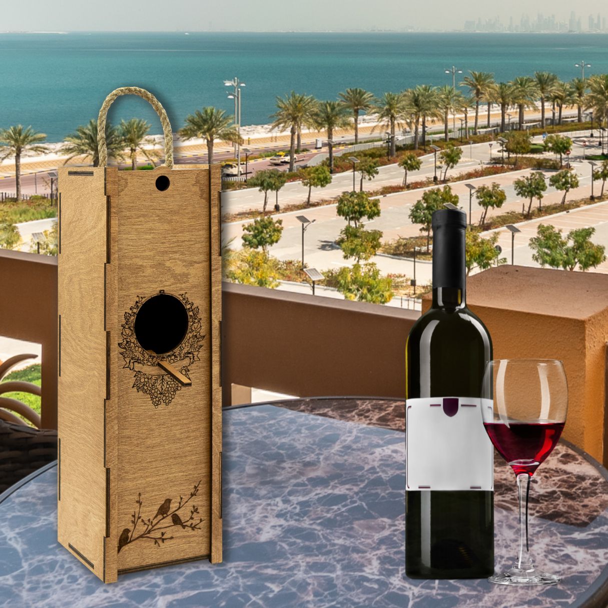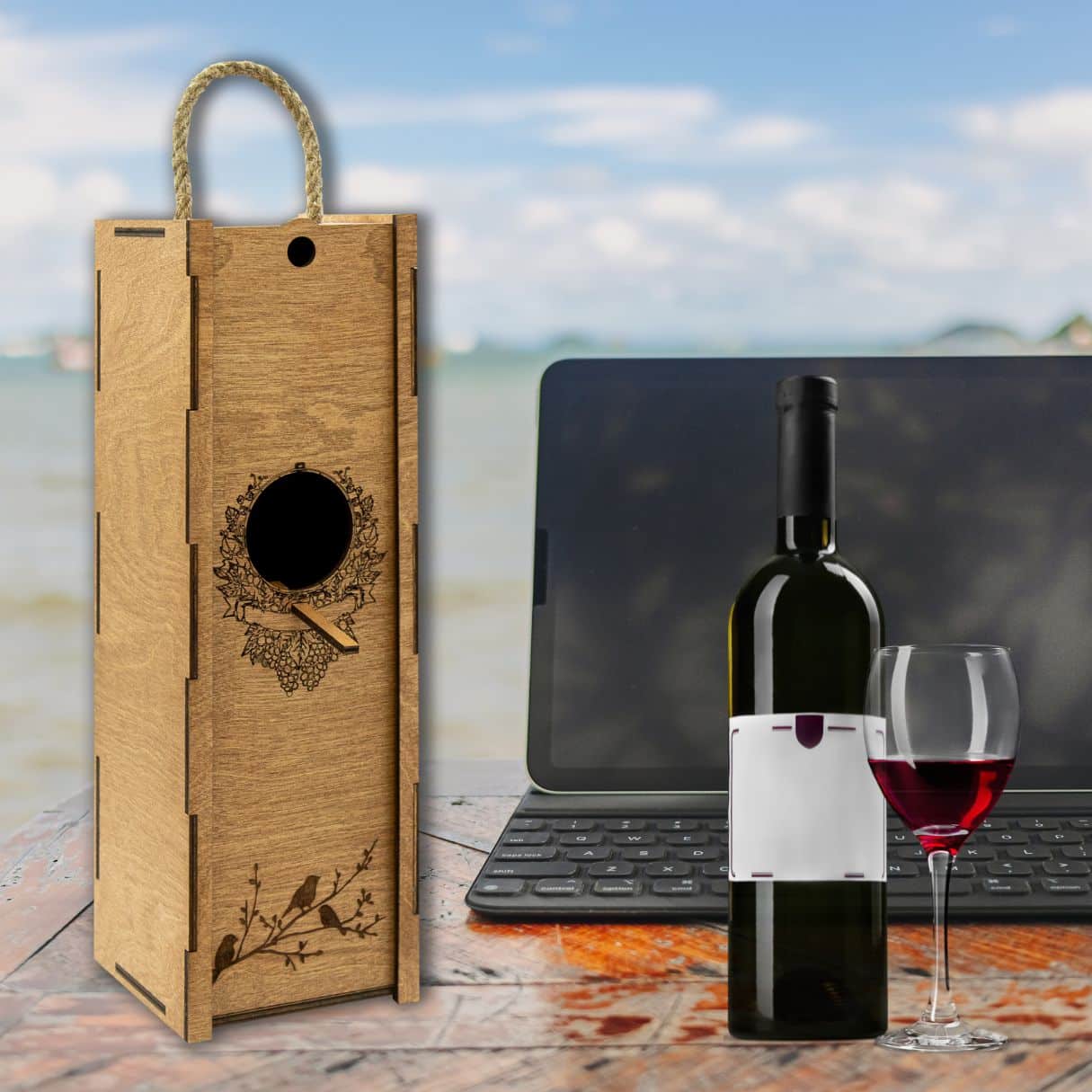 - Design : La boîte est ornée d’une illustration subtile d’une bouteille de vin, ajoutant une touche de charme rustique à votre cadeau.