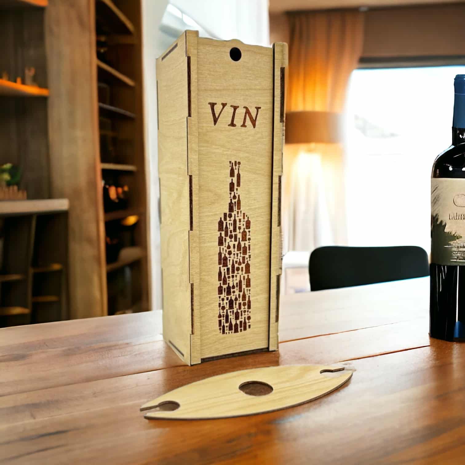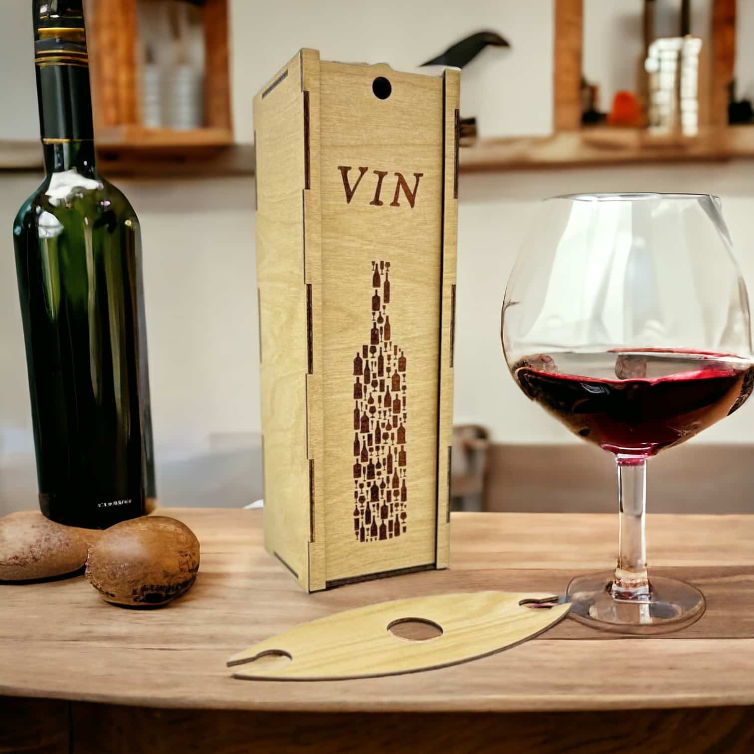 - Design : La boîte est ornée d’une illustration subtile d’une bouteille de vin, ajoutant une touche de charme rustique à votre cadeau.