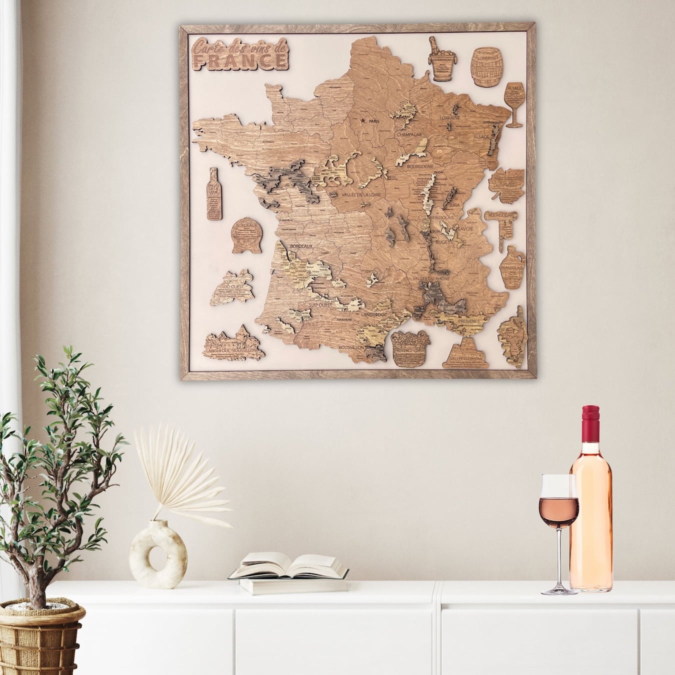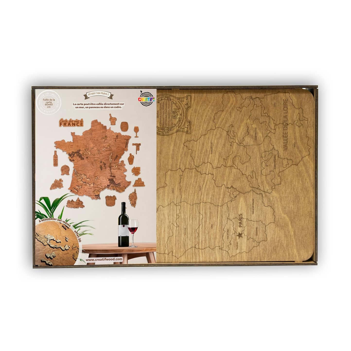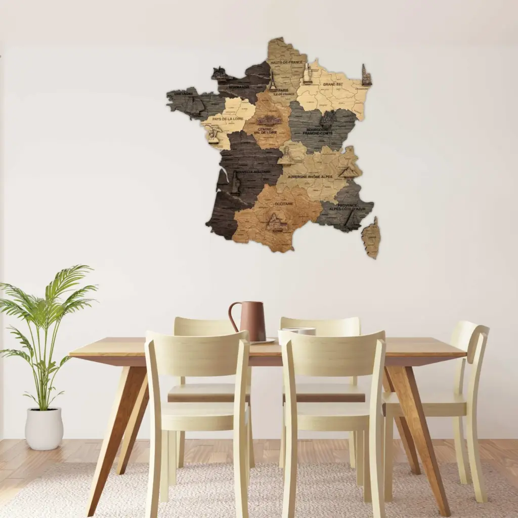 Plongez dans l’univers envoûtant des vins français avec notre Carte des Vins en Bois. D’une taille généreuse de 60*60 cm, cette pièce artistique est une célébration de la diversité et de la richesse viticole de la France.