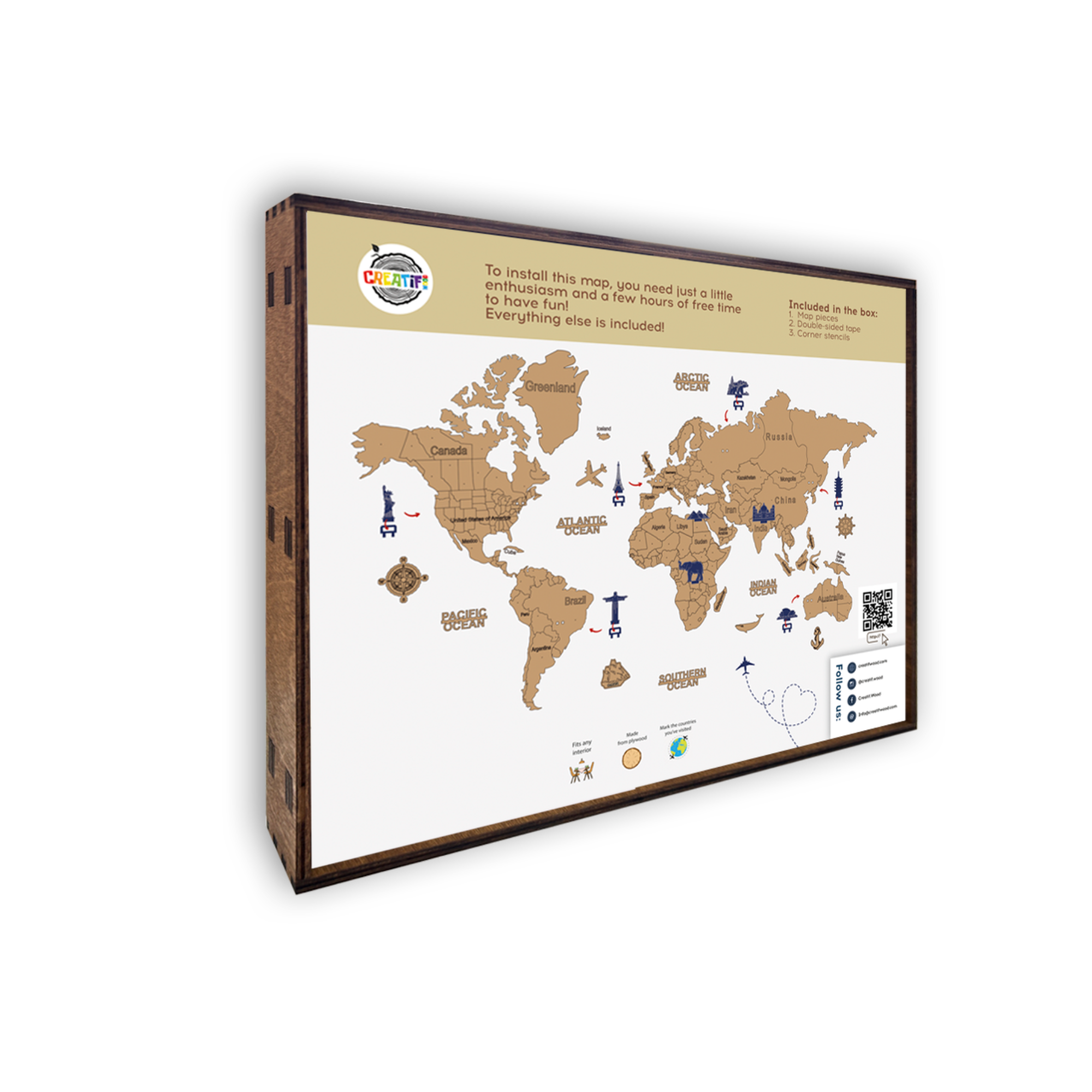 Pour installer cette Carte du monde en bois 2D, vous n’aurez besoin que d’un peu d’enthousiasme et de quelques heures pour vous amuser! Tout le reste est prévu !