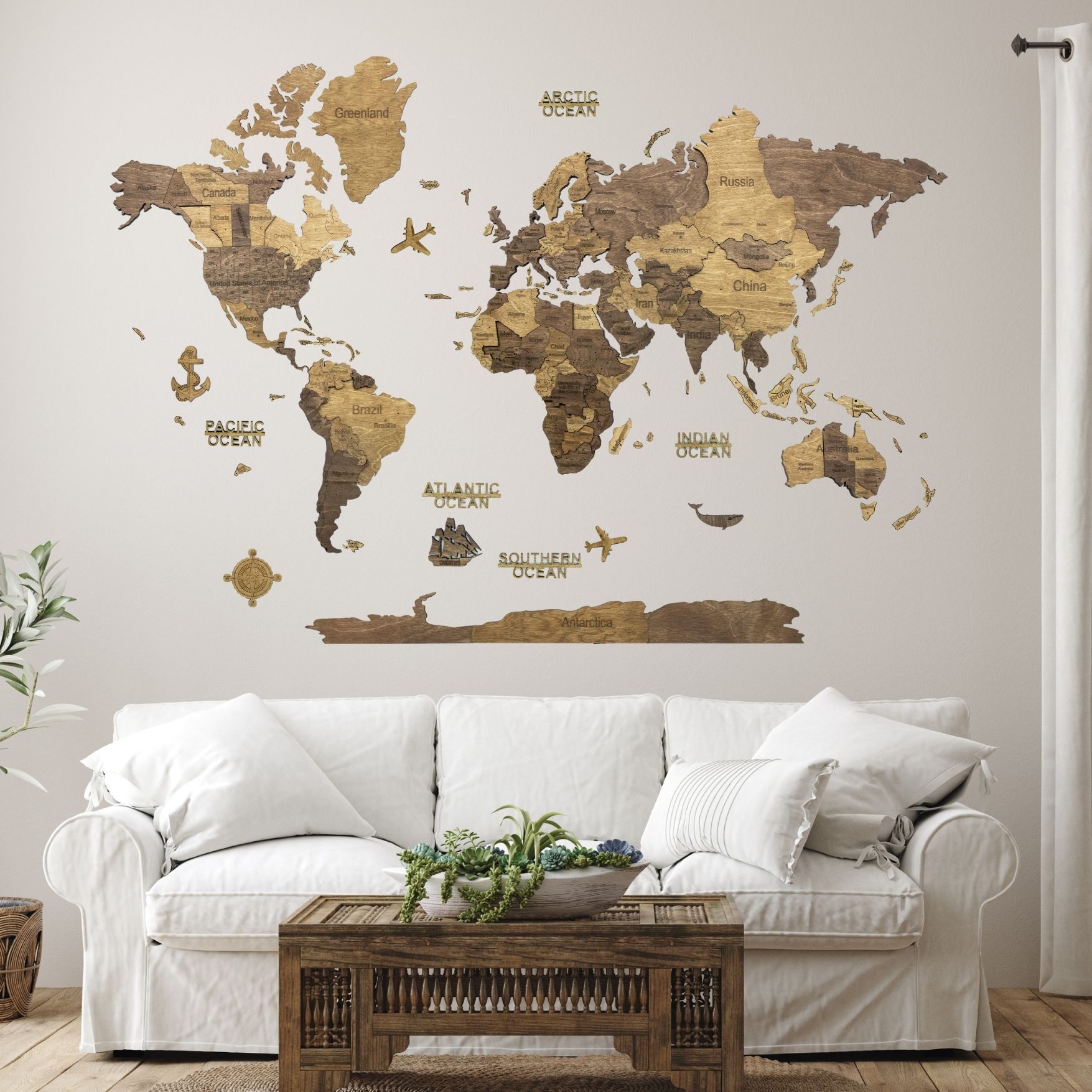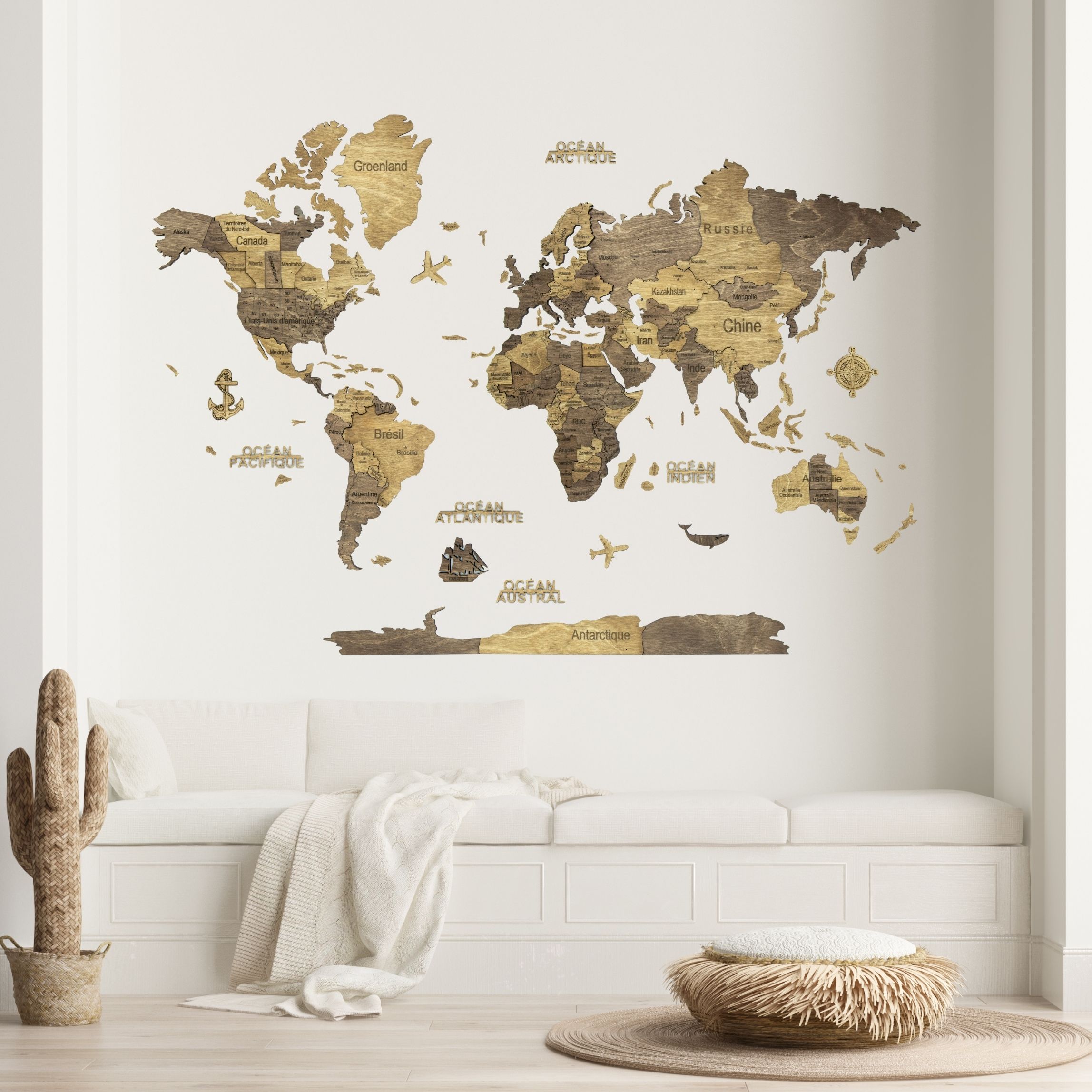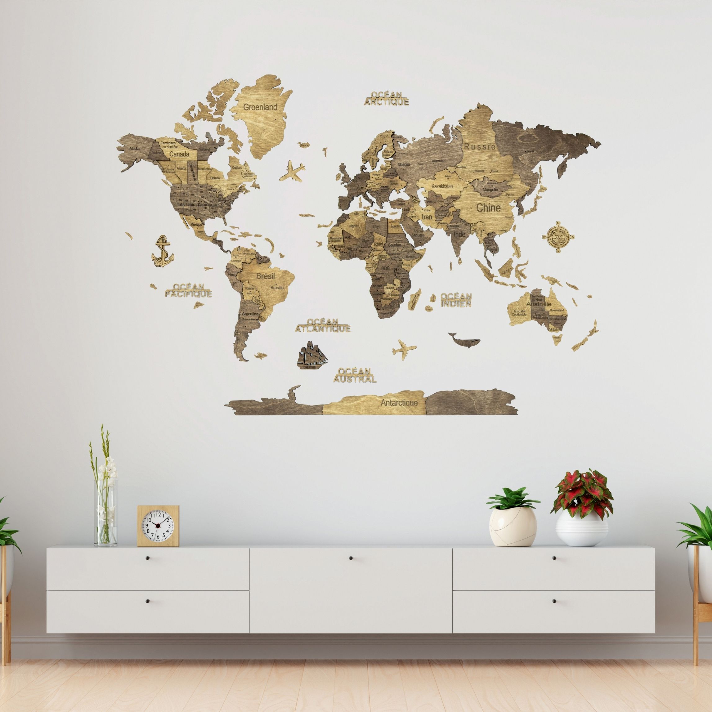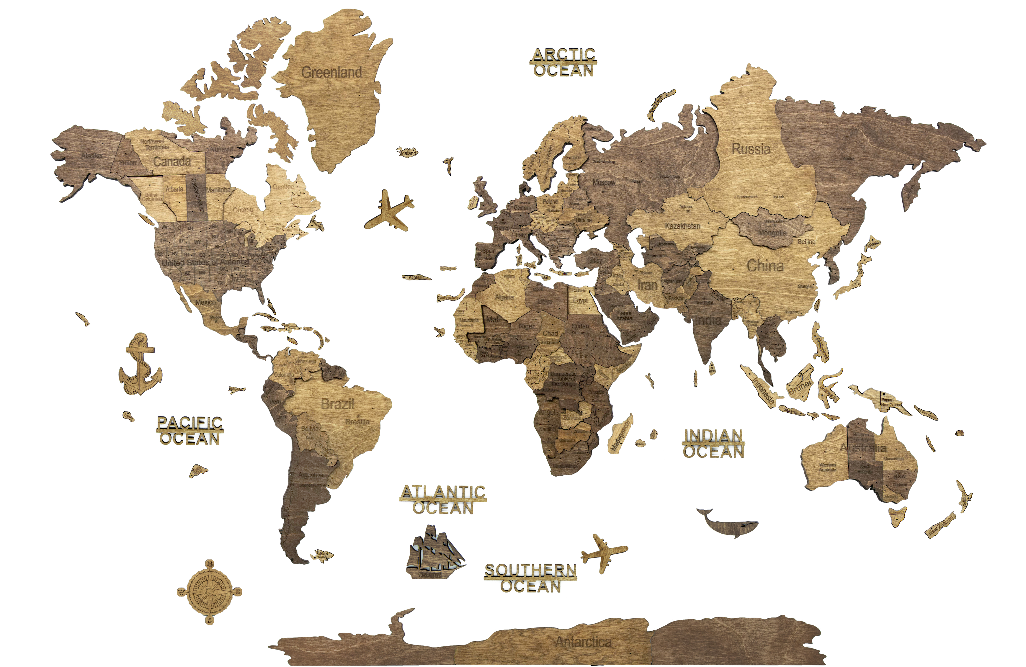 Carte en bois : continents et îles (avec noms et frontières des pays), Antarctique, des avions en bois, des bateaux et une boussole