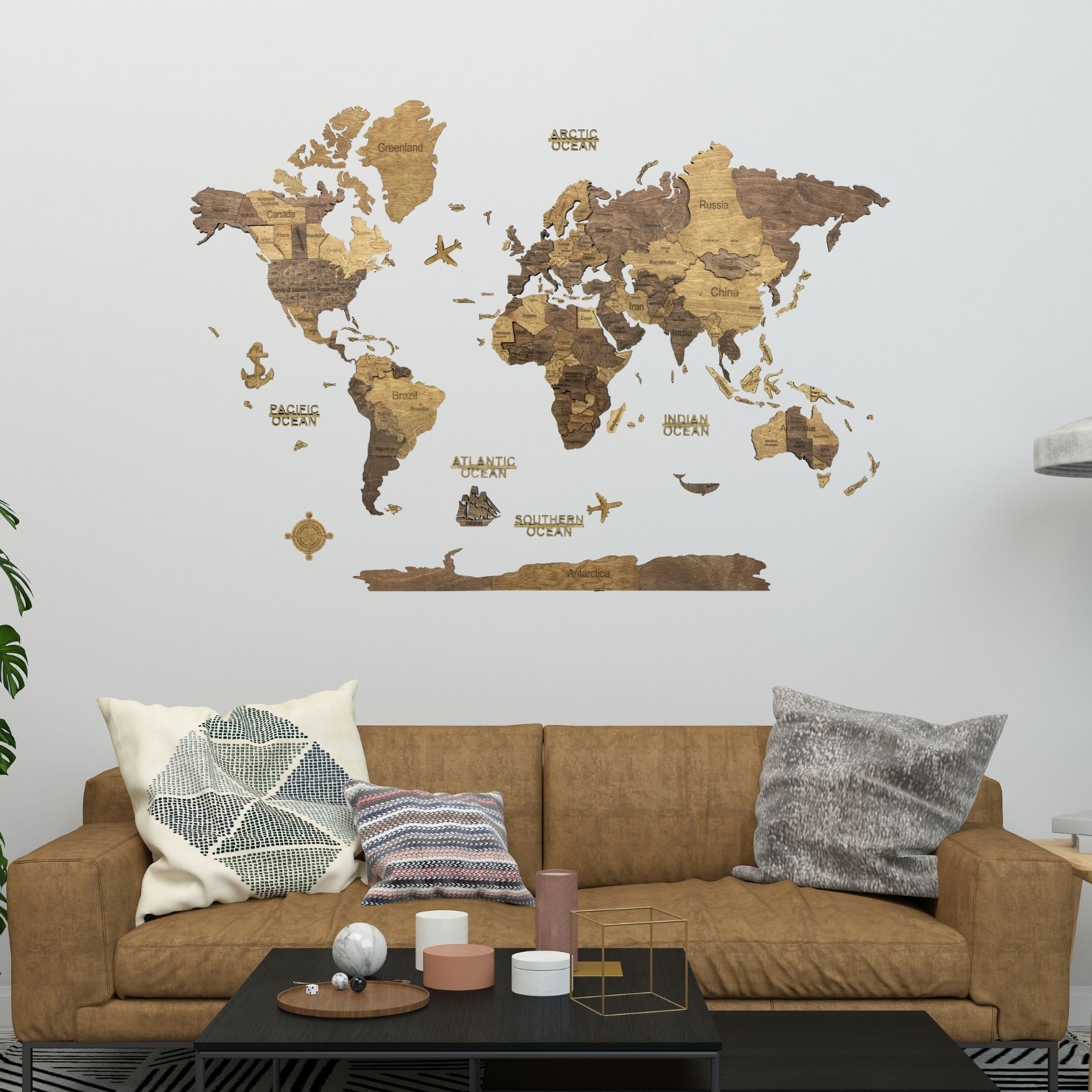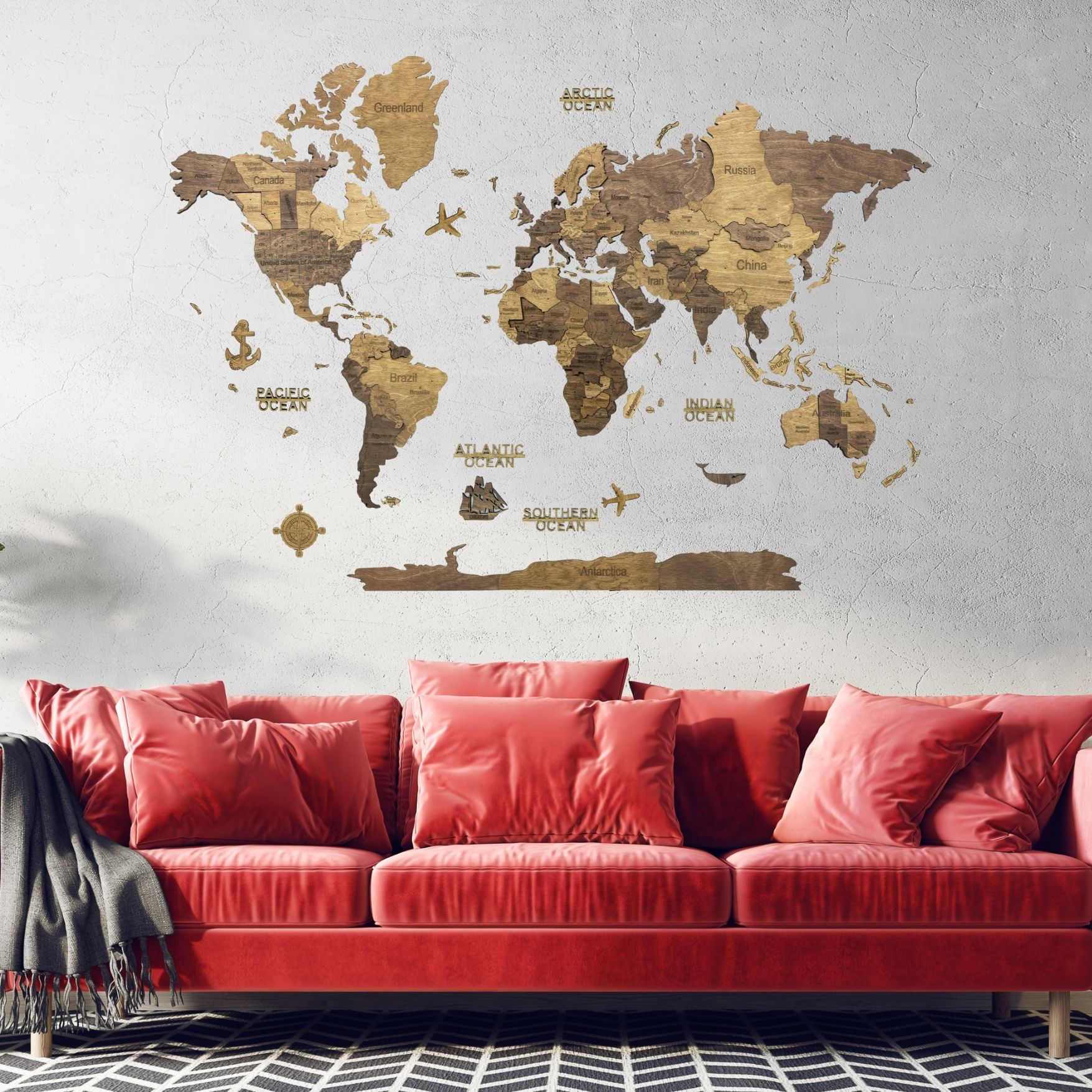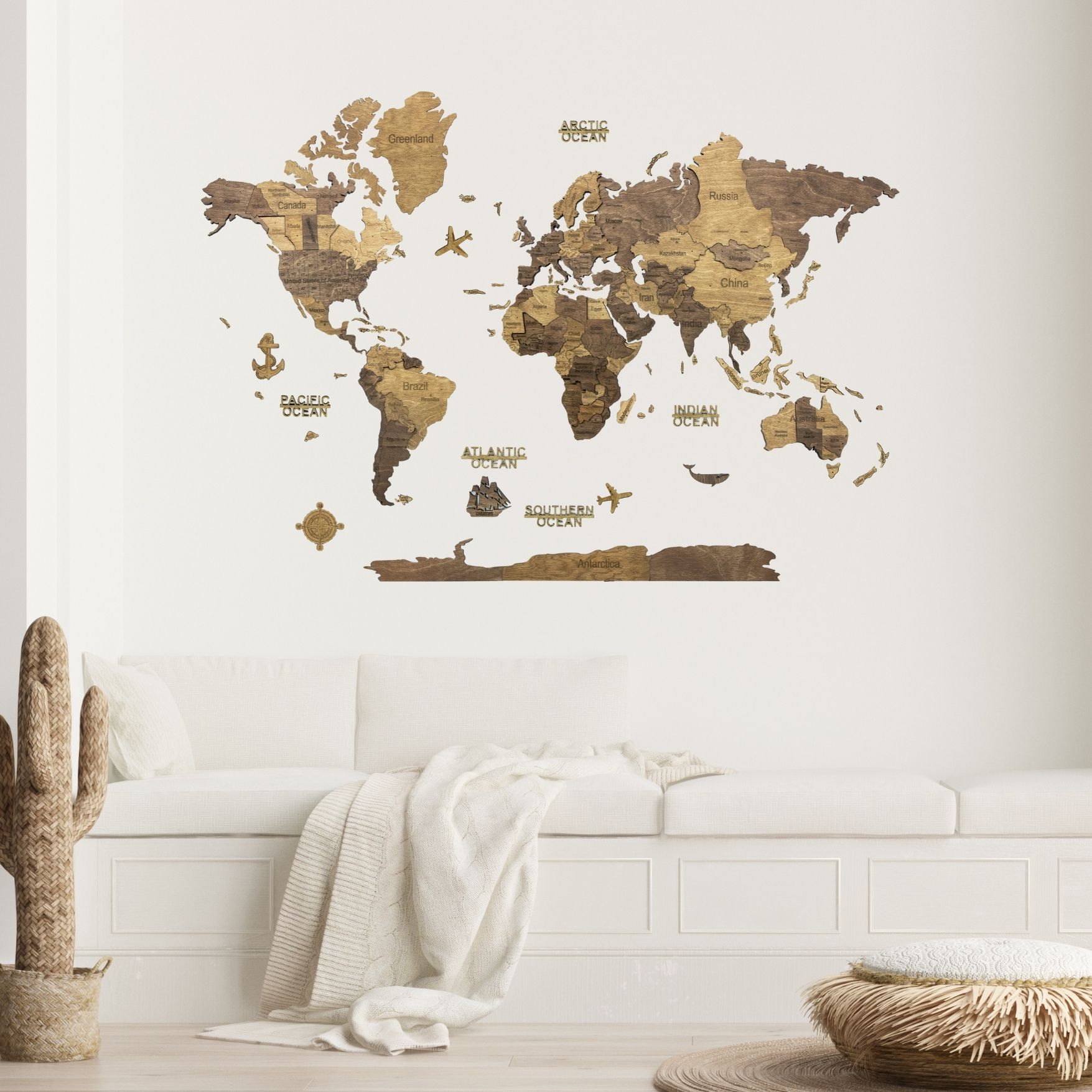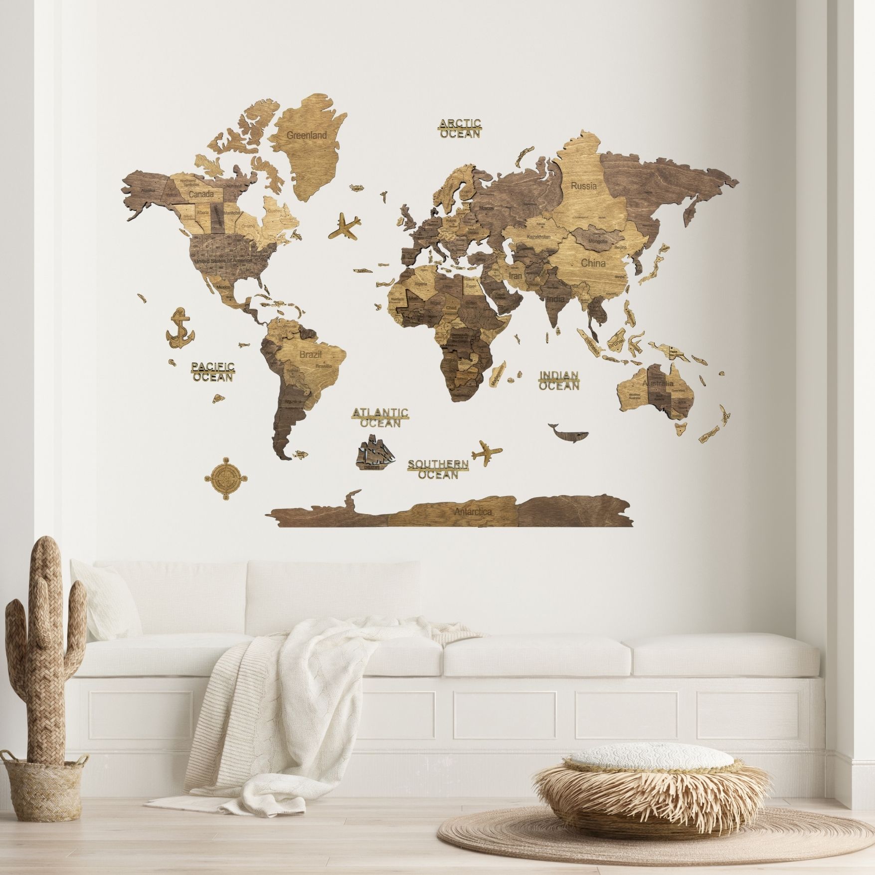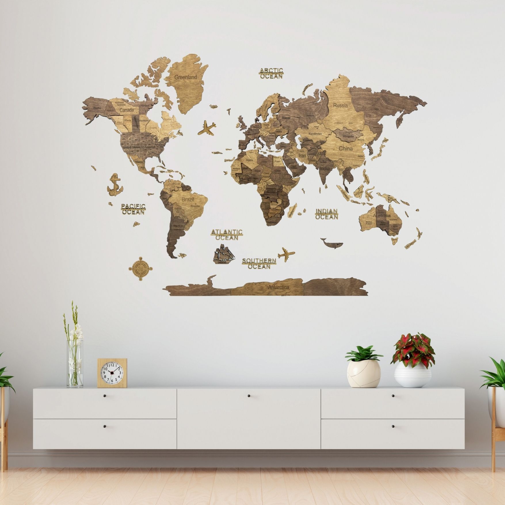 Carte en bois : continents et îles (avec noms et frontières des pays), Antarctique, des avions en bois, des bateaux et une boussole
