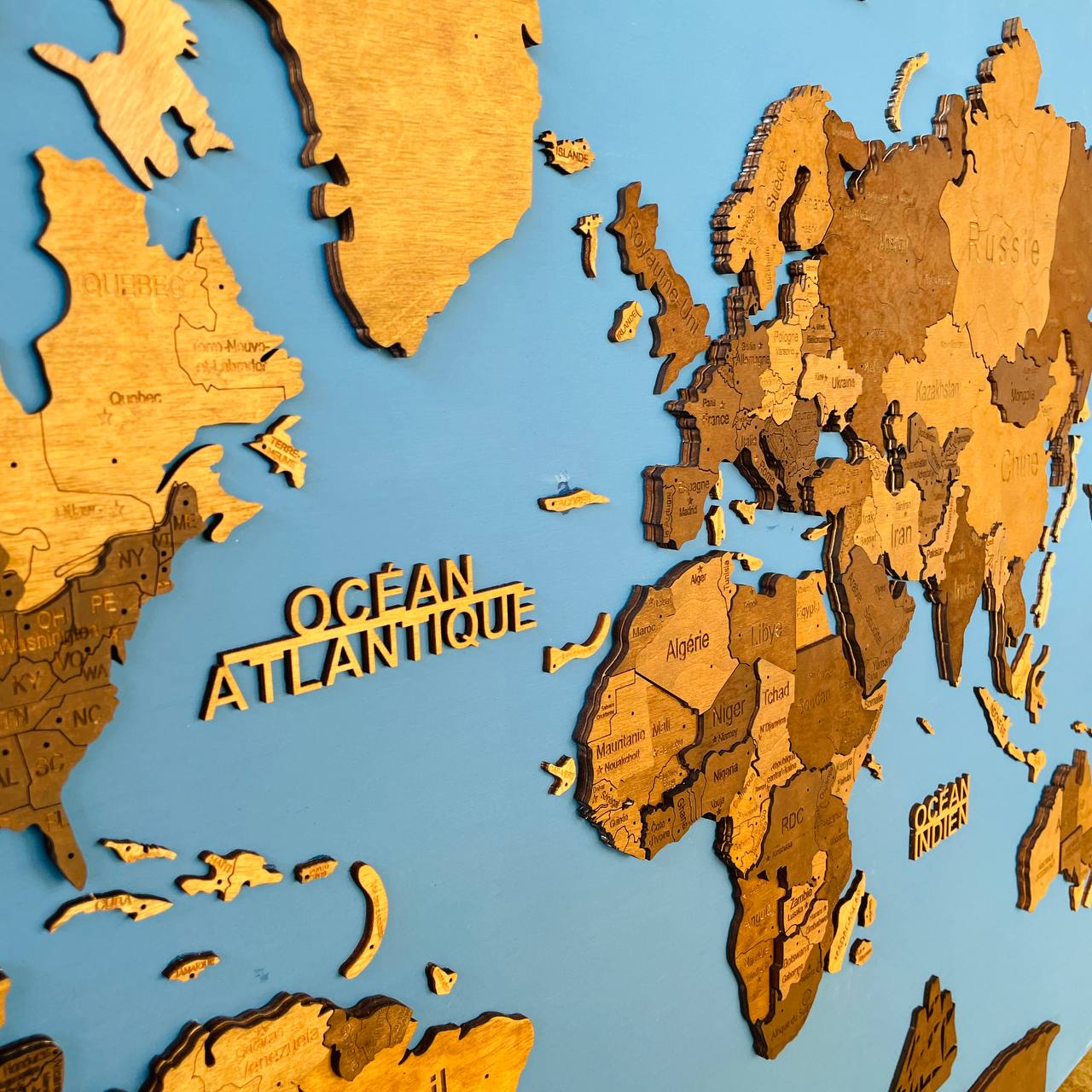 Il est important de noter que notre carte n’est pas une représentation géographique précise, mais plutôt une pièce de décoration. En raison de contraintes d’échelle, certains petits pays et îles peuvent être omis.
