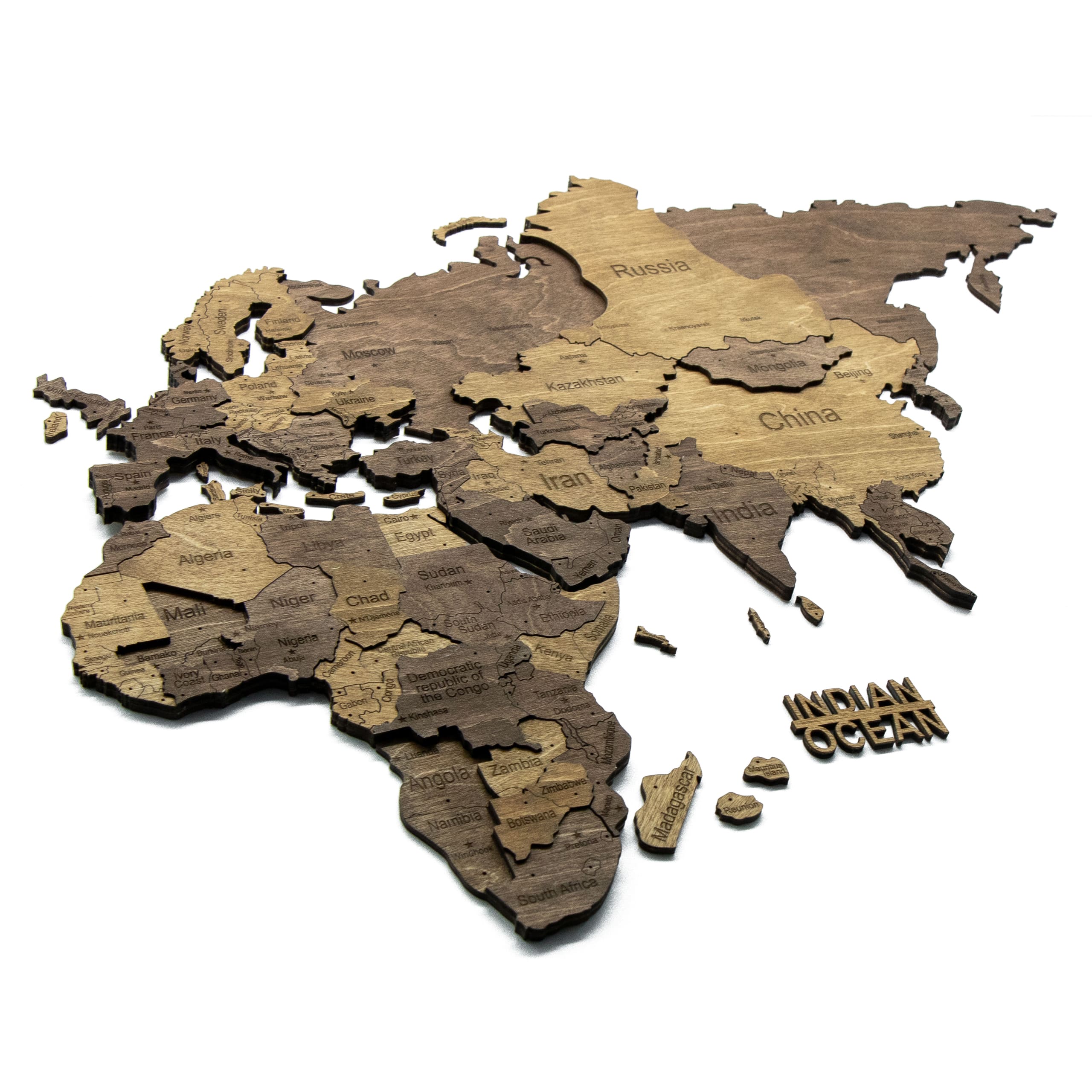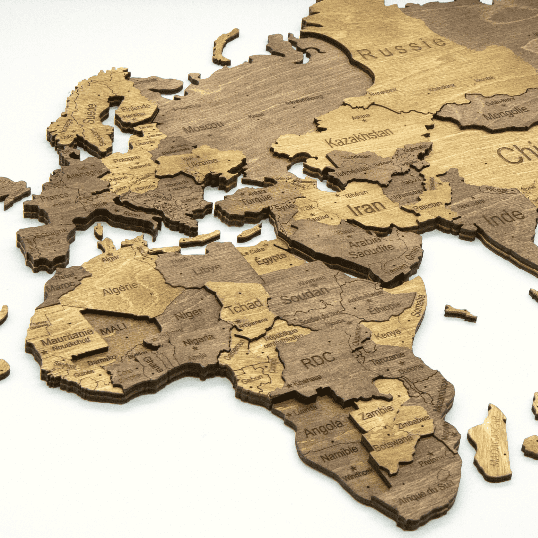 Explorez la splendeur naturelle du bois à travers la Carte du Monde en bois 3D Chocolate de CREATIFWOOD.