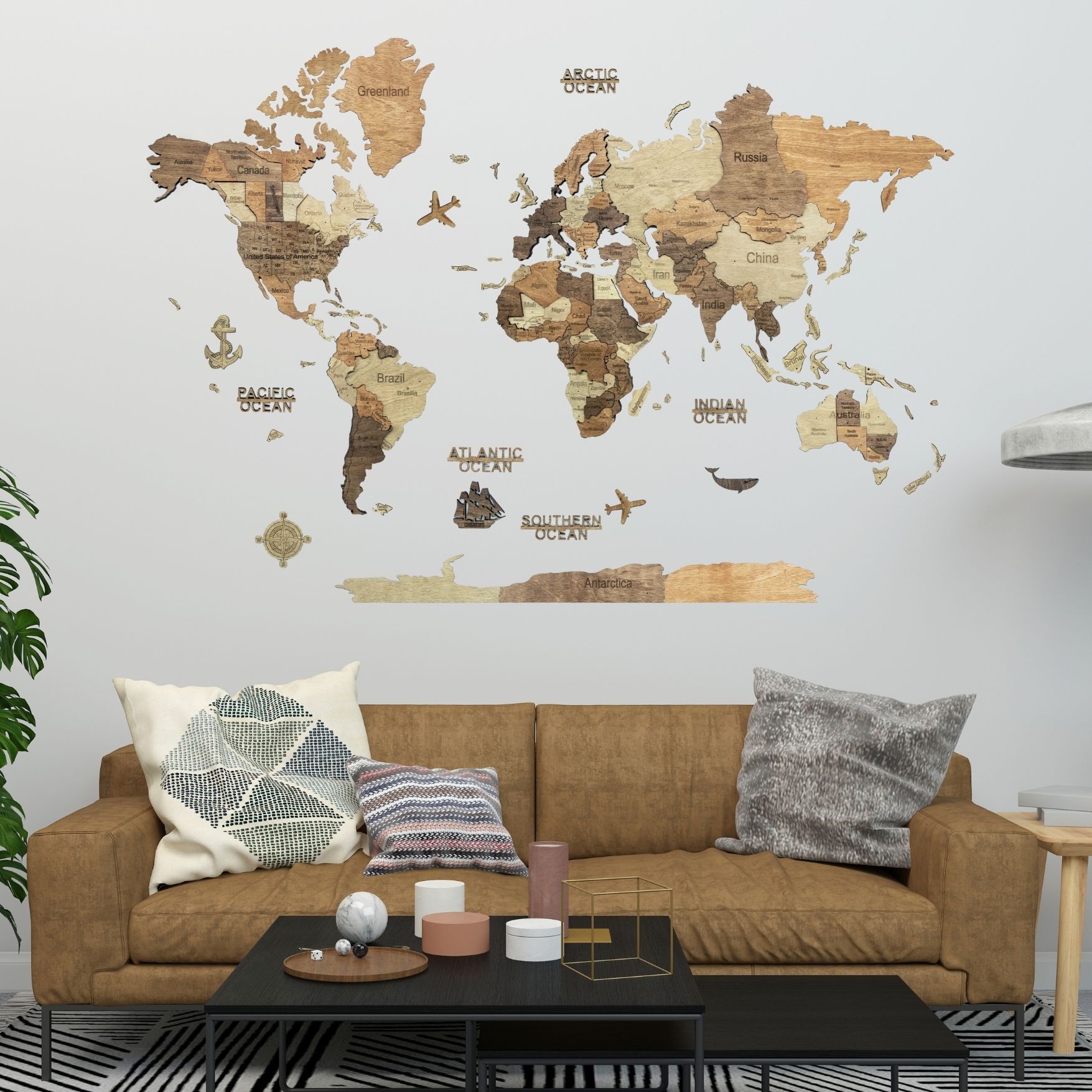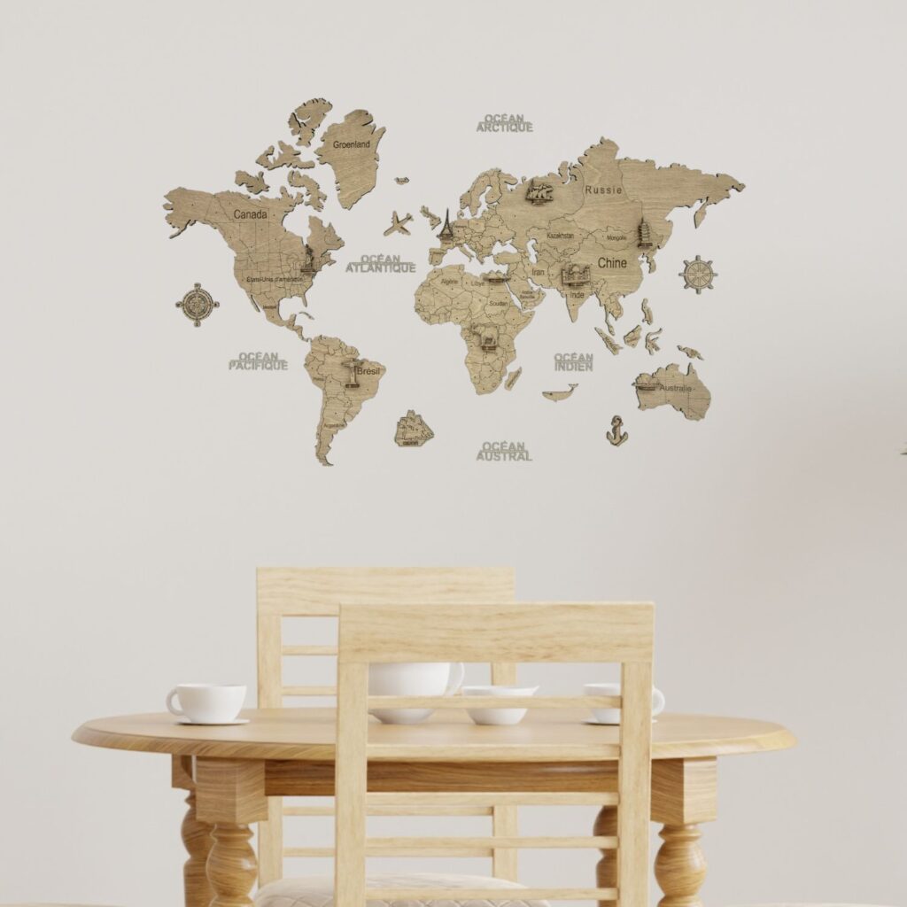 - Personnalisation : Faites de votre carte du monde une pièce unique en la personnalisant. Marquez vos voyages passés et à venir, ajoutez des épingles colorées pour indiquer vos destinations préférées, ou gravez des citations inspirantes pour une touche personnelle.