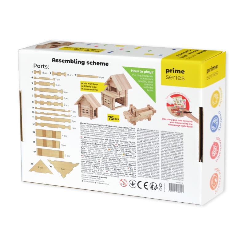 Le kit de construction « Maison avec Garage » est destiné aux enfants à partir de 5 ans. En assemblant les pièces selon les instructions, l’enfant obtient une maison en bois à deux étages avec un balcon et un garage pour sa voiture préférée. L’assemblage est facile et amusant ; chaque étape est illustrée dans des instructions détaillées. Ce kit complète parfaitement les jeux avec des voitures.