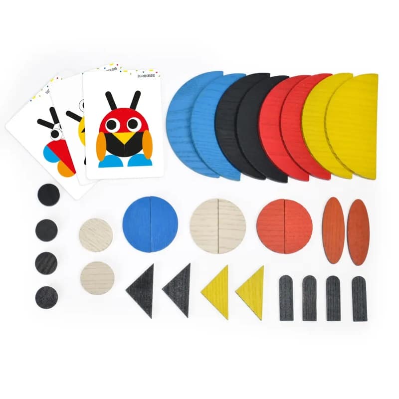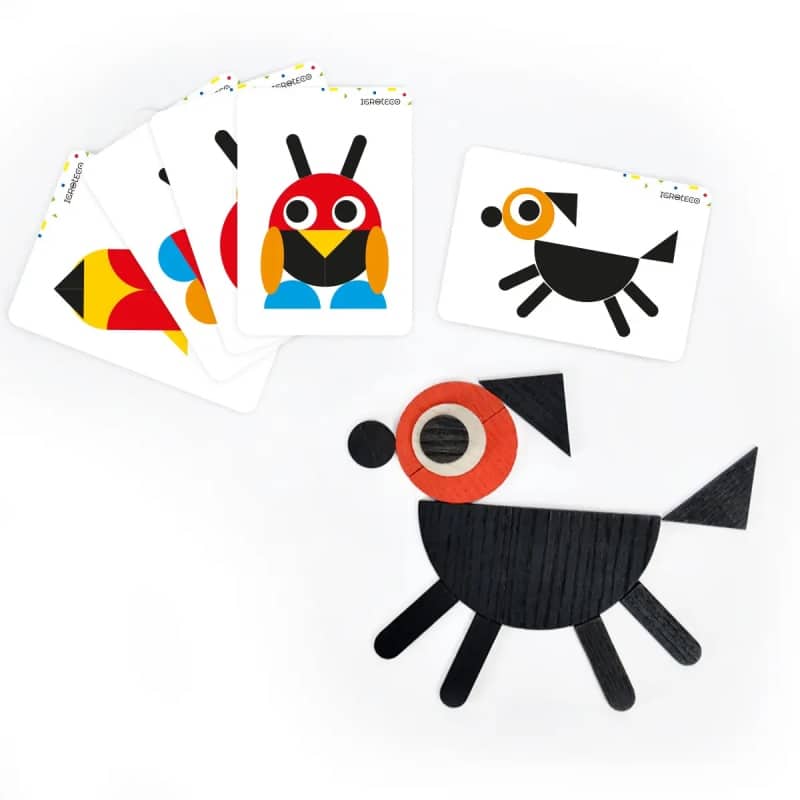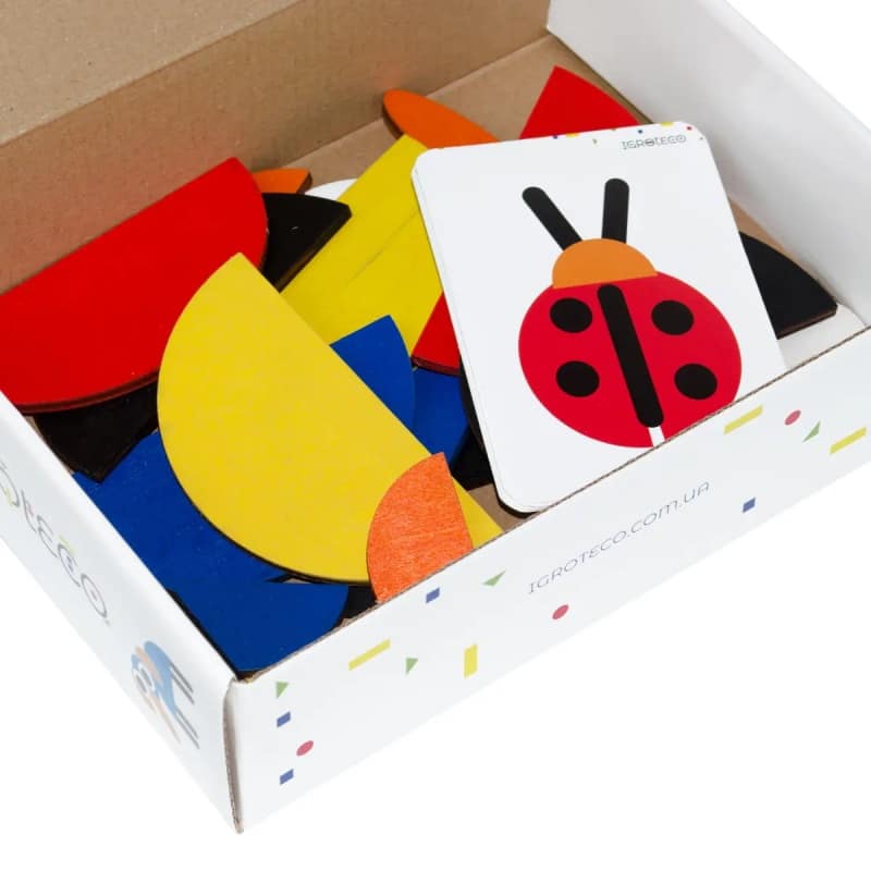 Vous voulez assembler une voiture, un oiseau ou un éléphant avec des cercles, des demi-cercles et des triangles ? Oui ! Ce jouet écologique est un super entraîneur pour le cerveau, les doigts et l’imagination des enfants. La mosaïque en bois colorée de la marque Igroteco se compose de 30 éléments, avec lesquels on peut former des images stylisées d’animaux, de plantes, d’objets du quotidien, de chiffres et de lettres, de formes géométriques et de motifs. Le kit comprend également 10 cartes colorées recto-verso avec des mosaïques intéressantes. En les plaçant, l’enfant peut inventer de nouvelles figures encore et encore. Ce processus passionnant est très bénéfique pour le développement de la motricité fine et de la pensée logique, de la coordination et de la compréhension des couleurs et des formes. Ce jouet développe :