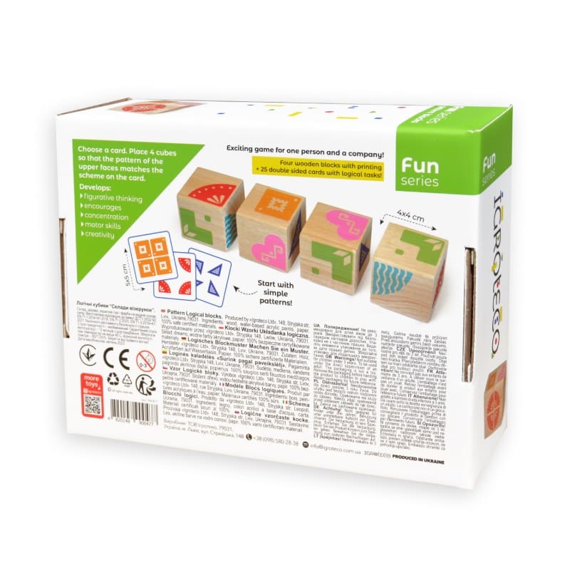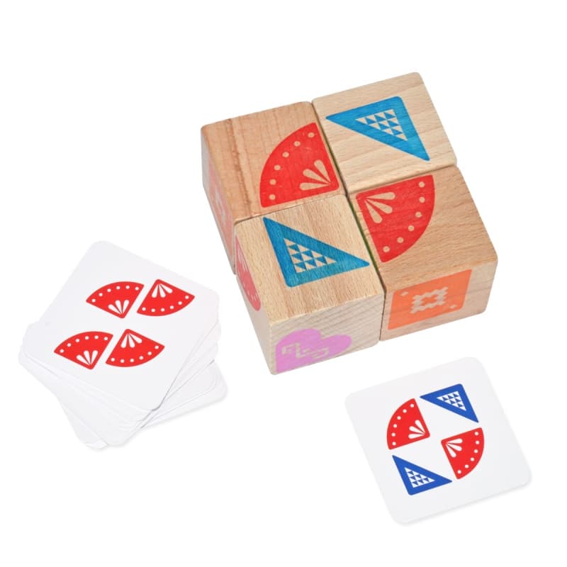 Le jouet en bois éducatif « Assemble le motif » avec la référence 900477 de chez IGROTECO, du fabricant Igroteko, est un jeu logique pour les enfants à partir de 3 ans, comprenant 4 cubes en bois et 25 cartes couleur recto verso avec des schémas à reproduire.