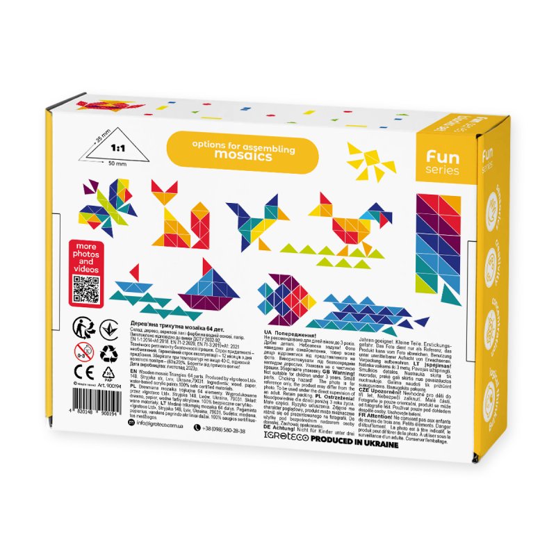Cette mosaïque en bois originale se compose de 64 éléments triangulaires multicolores, avec lesquels on peut créer des images stylisées d’animaux, de plantes, d’objets de la vie quotidienne, de chiffres et de lettres, de formes géométriques et d’ornements.