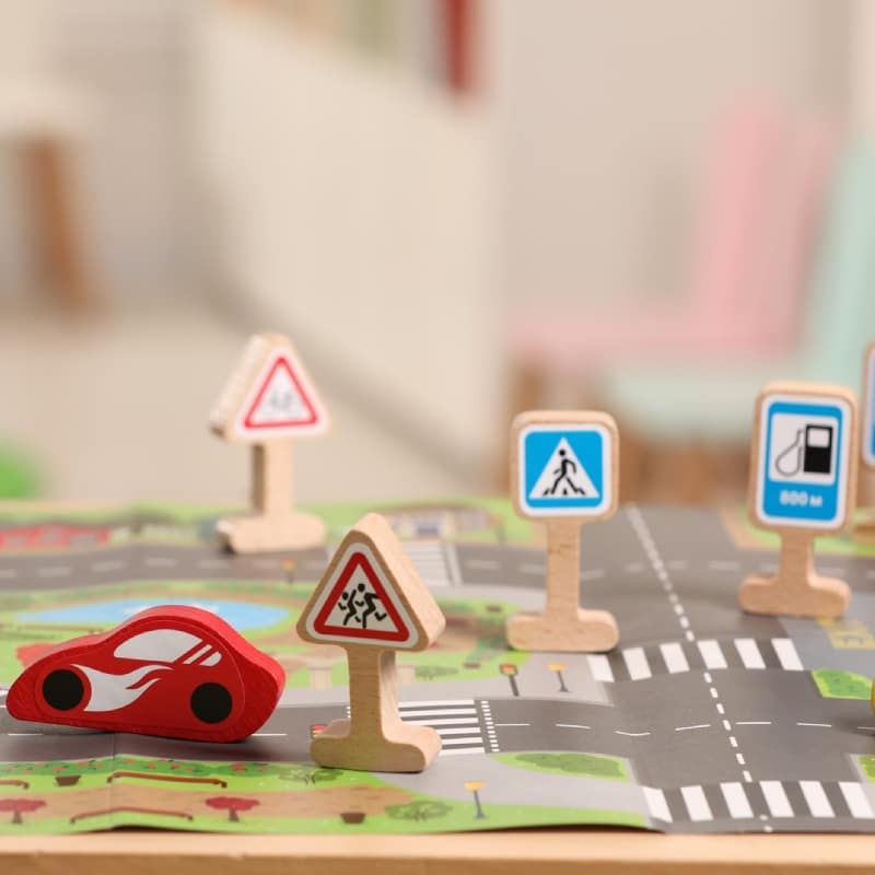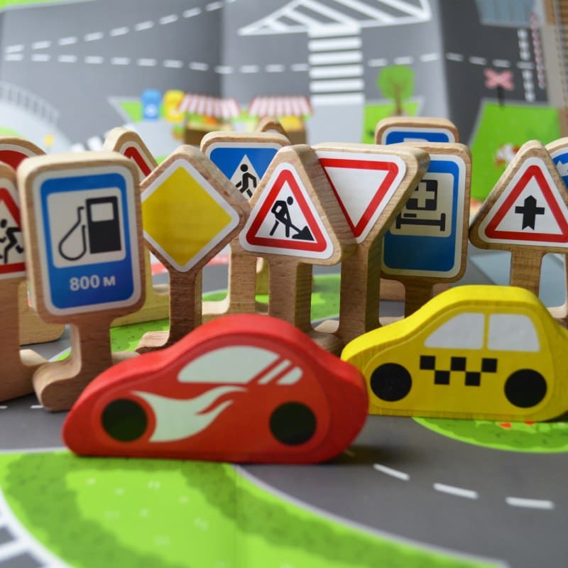 L’ensemble de jeu « Panneaux de signalisation » pour enfants est une excellente occasion de combiner l’apprentissage des règles simples de la circulation routière avec un jeu passionnant de voitures. Collez les autocollants sur les panneaux de signalisation, disposez-les le long des routes et partez en voyage à travers la ville !
