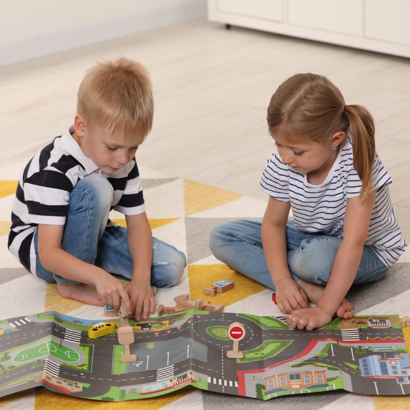 À la demande de l’enfant, il peut assembler les routes les unes aux autres et créer une ville entière, longue de près de 2 mètres ! Ce jeu intéressera à la fois les enfants qui peuvent conduire leurs voitures préférées dans la ville, s’arrêter aux passages pour piétons, étudier les couleurs des feux de circulation, ainsi que les enfants plus âgés qui commenceront à se familiariser avec les règles de base de la circulation et du comportement dans les rues de la ville sous forme de jeu.