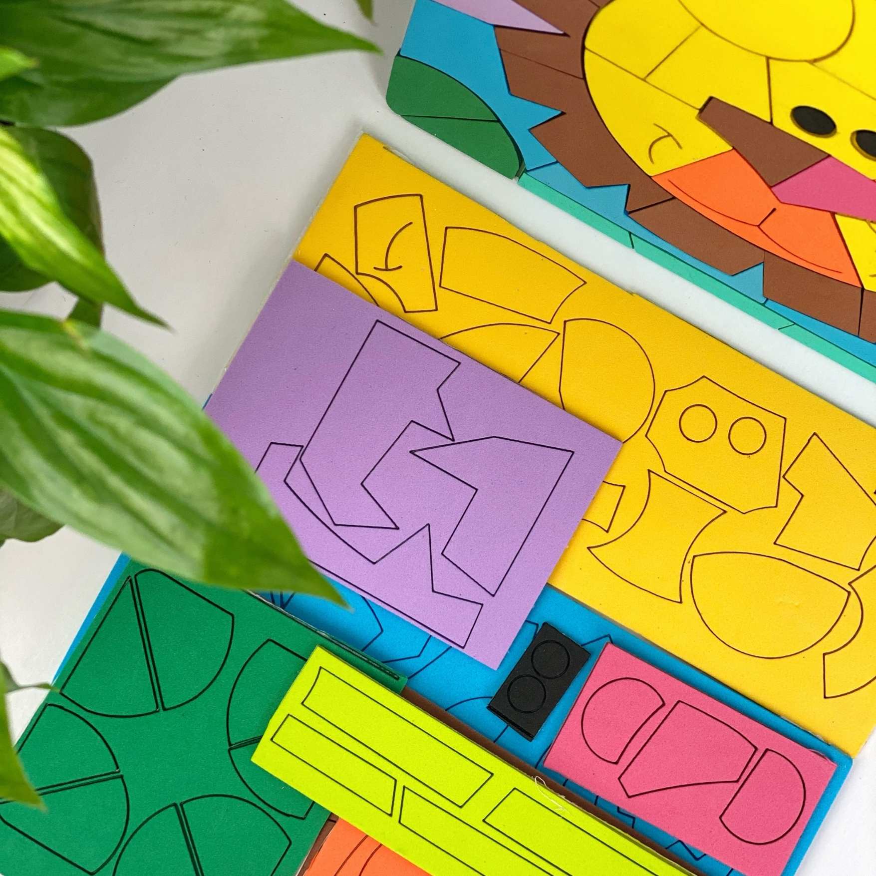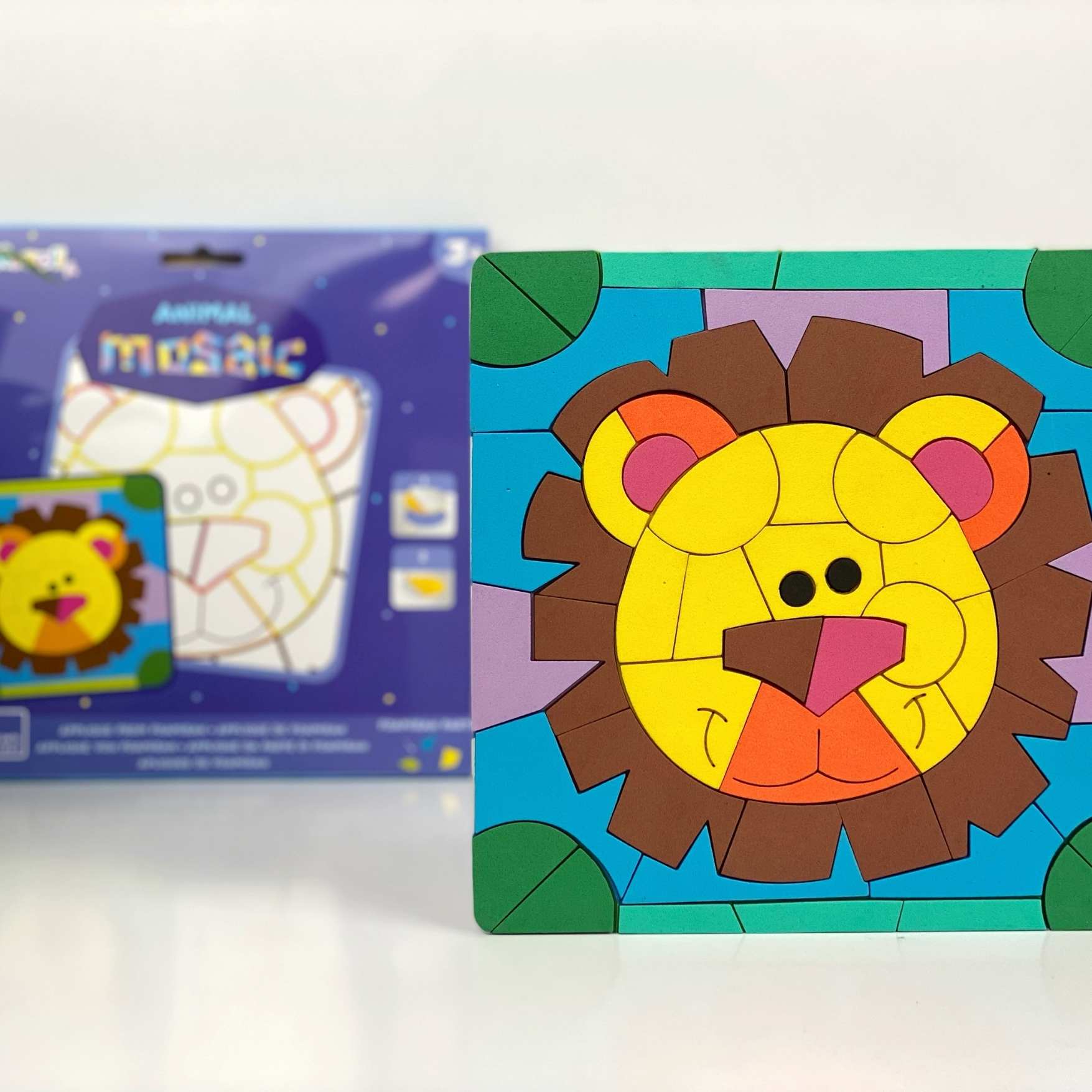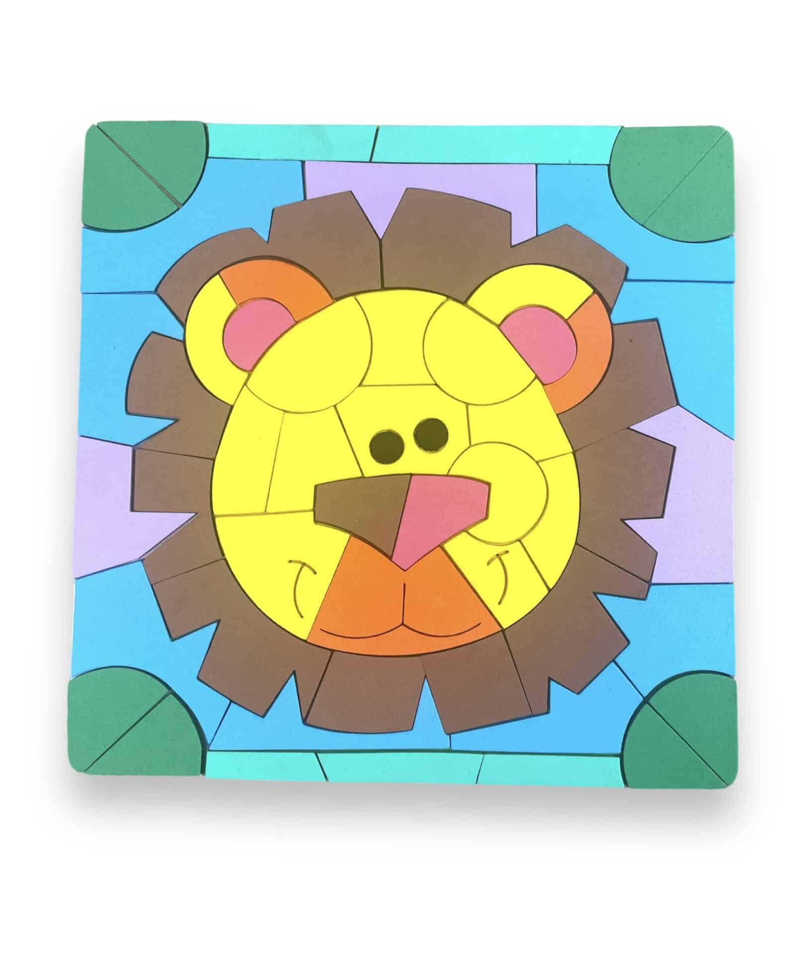 - Design : Contient toutes les pièces nécessaires pour créer une mosaïque colorée de lion.