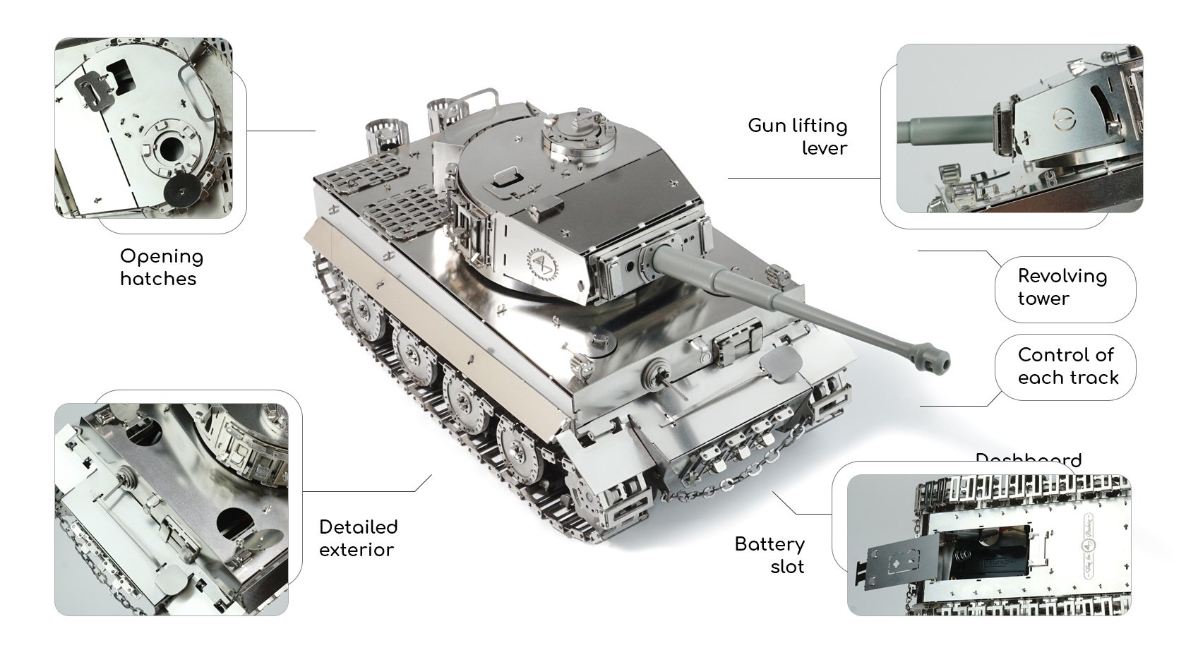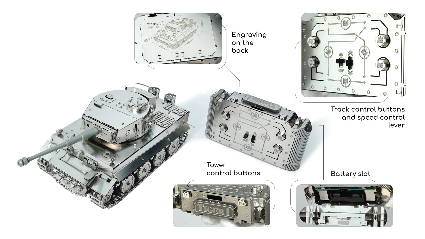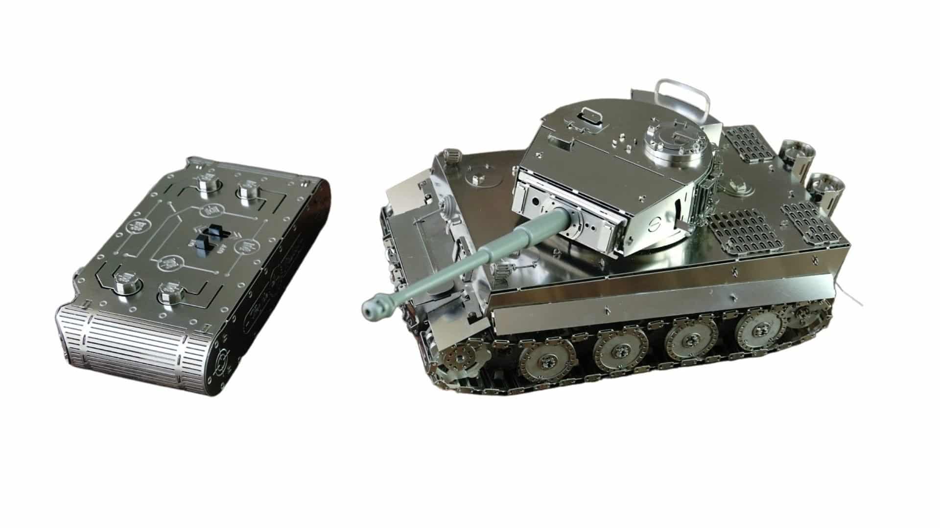 Le Tiger-I, en matériau inhabituel pour la modélisation, mais dans une échelle populaire de modèle de char 1:35, sera certainement inspirer votre intérêt et vous mettre au défi de l’essayer en action. Très unique avec son char en métal couplé avec sa télécommande en métal,qui est aussi belle que le char lui-même avec des boutons en métal. Ensemble, ils créent un ensemble de modèles spécial et un look excellent à la fois en utilisation et sur votre étagère.