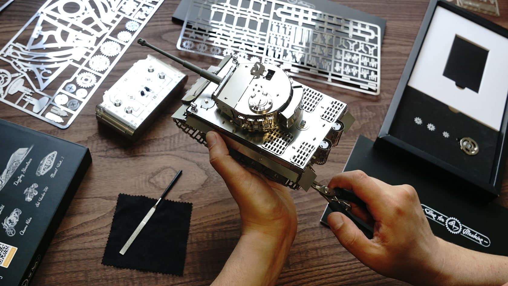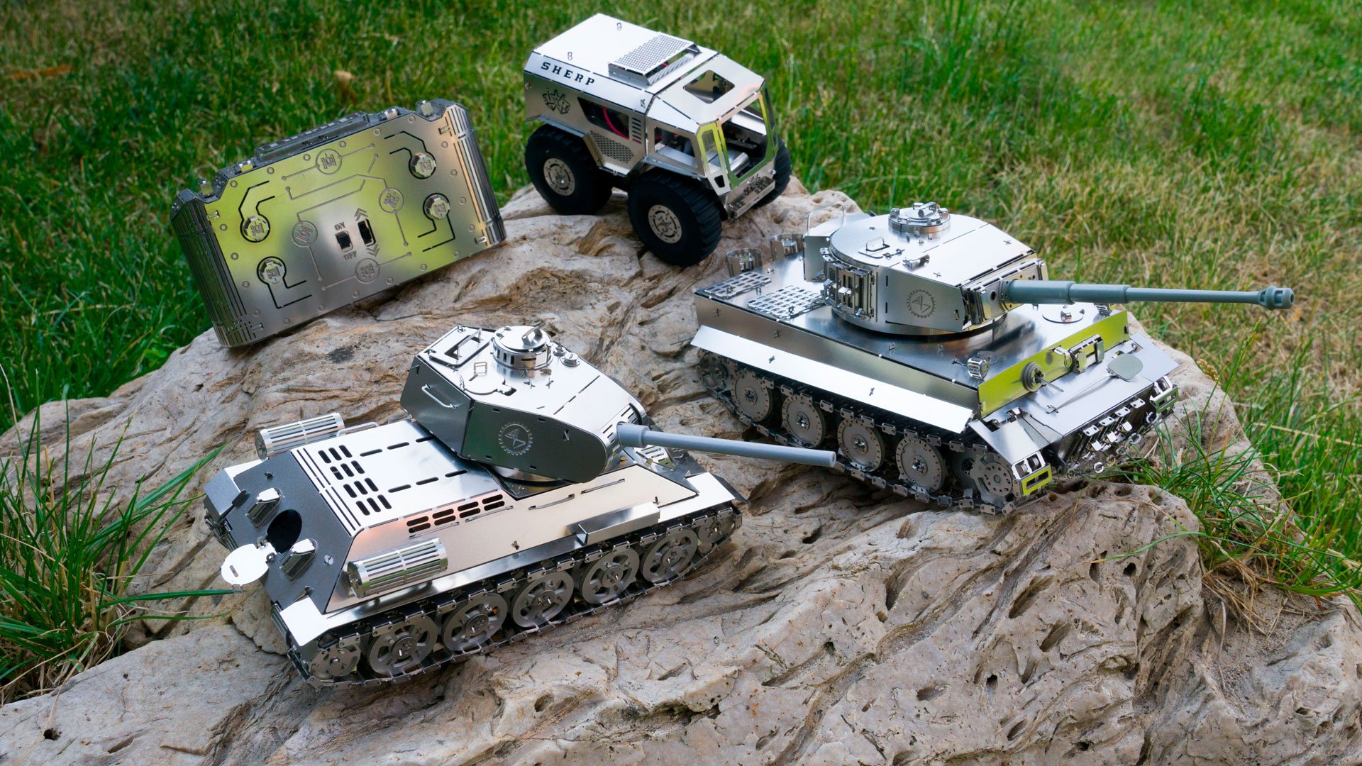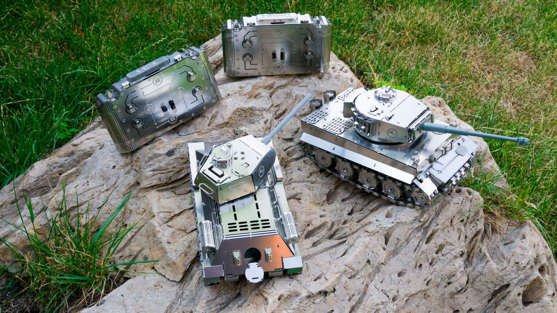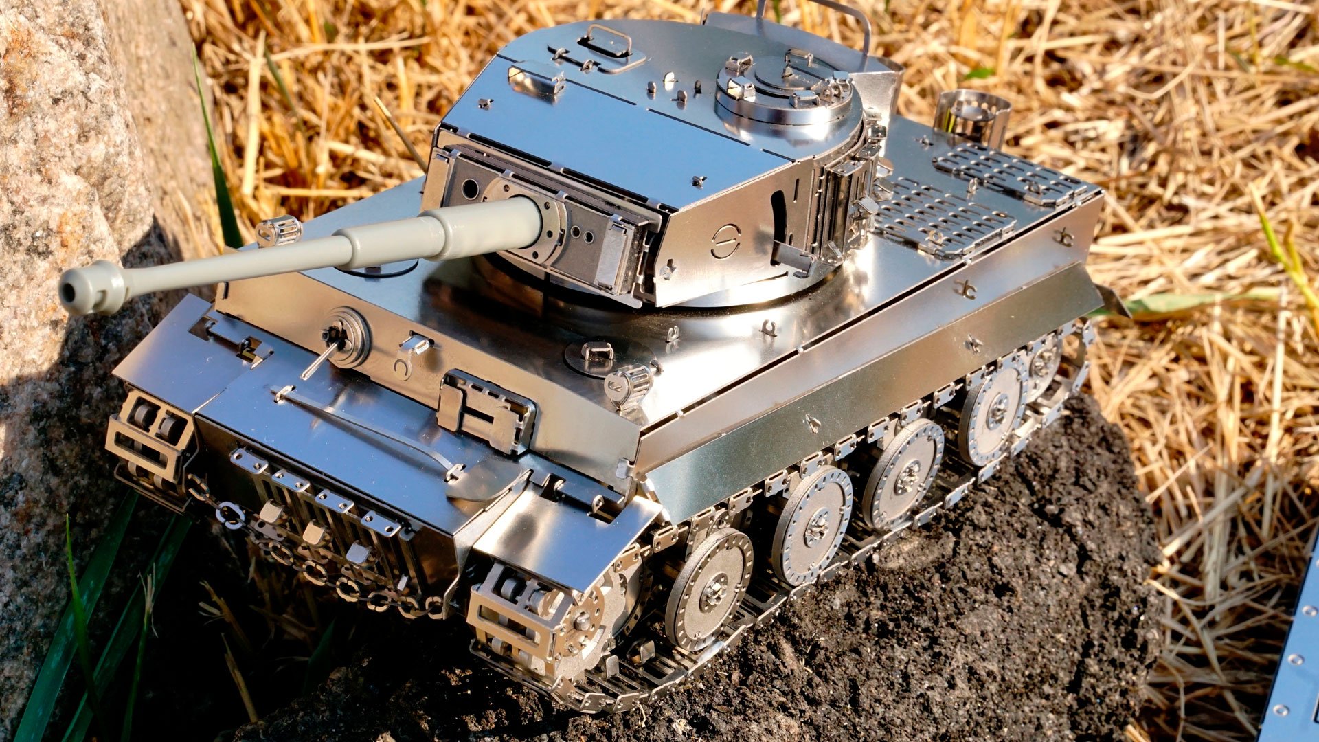 Le Tiger-I, en matériau inhabituel pour la modélisation, mais dans une échelle populaire de modèle de char 1:35, sera certainement inspirer votre intérêt et vous mettre au défi de l’essayer en action. Très unique avec son char en métal couplé avec sa télécommande en métal,qui est aussi belle que le char lui-même avec des boutons en métal. Ensemble, ils créent un ensemble de modèles spécial et un look excellent à la fois en utilisation et sur votre étagère.