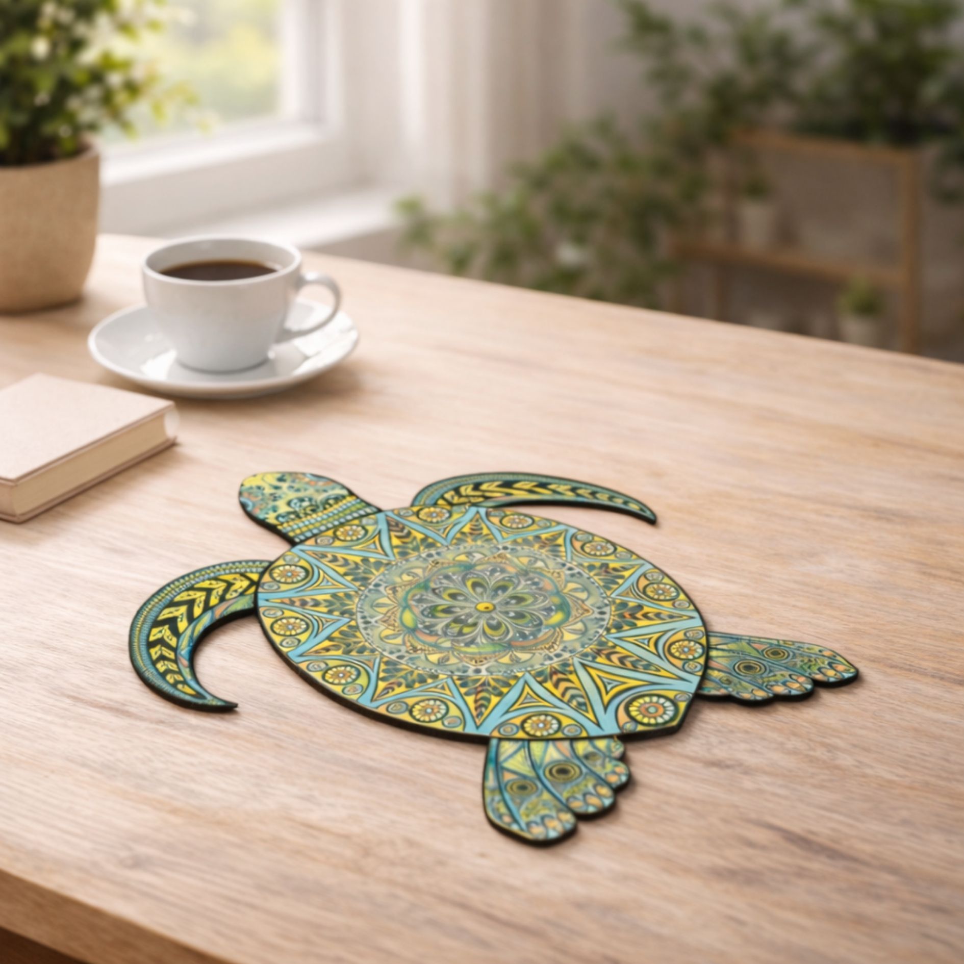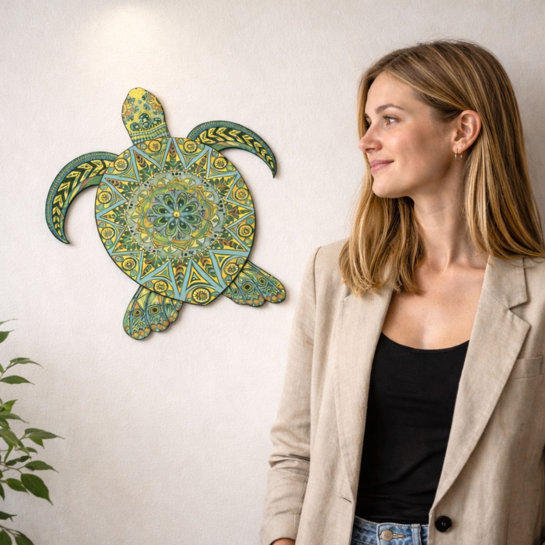 La Tortue Tropicale vous transporte vers les eaux chaudes et lumineuses des récifs coralliens. Symbole d’équilibre, de patience et de sérénité, elle avance lentement mais avec une force tranquille à travers un univers marin éclatant de couleurs.