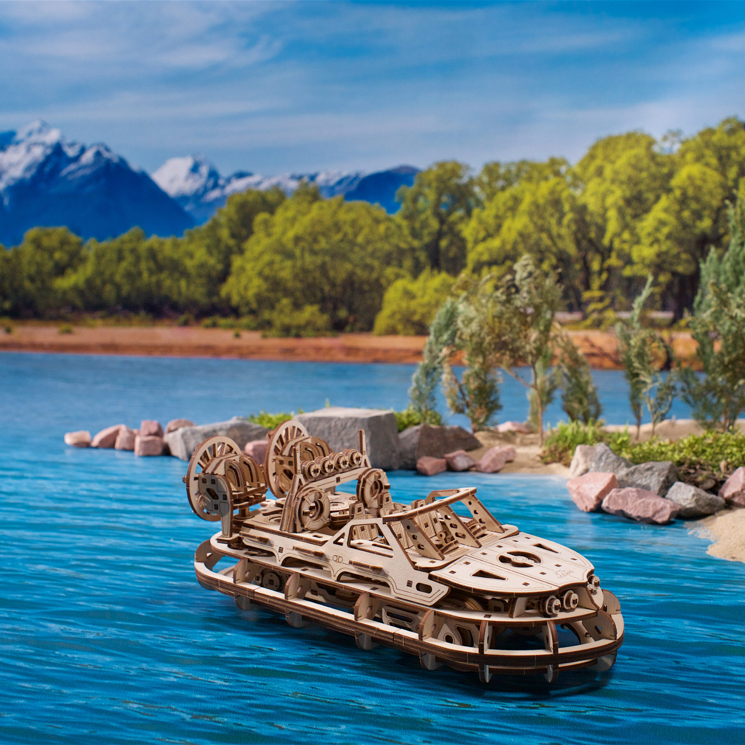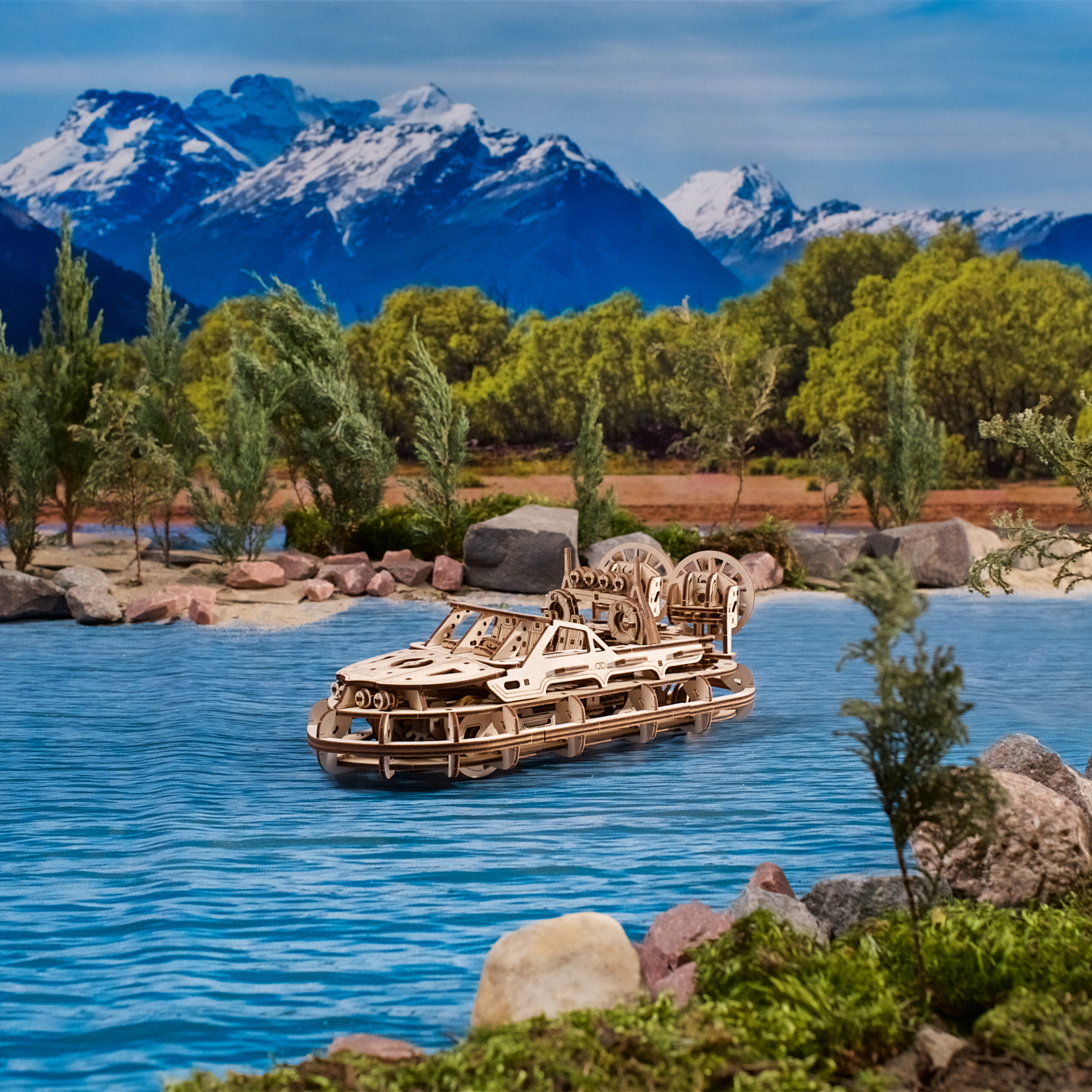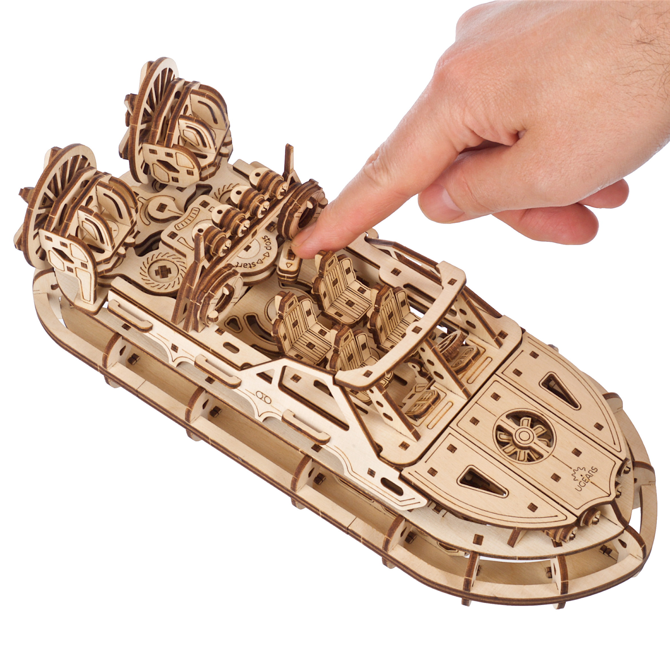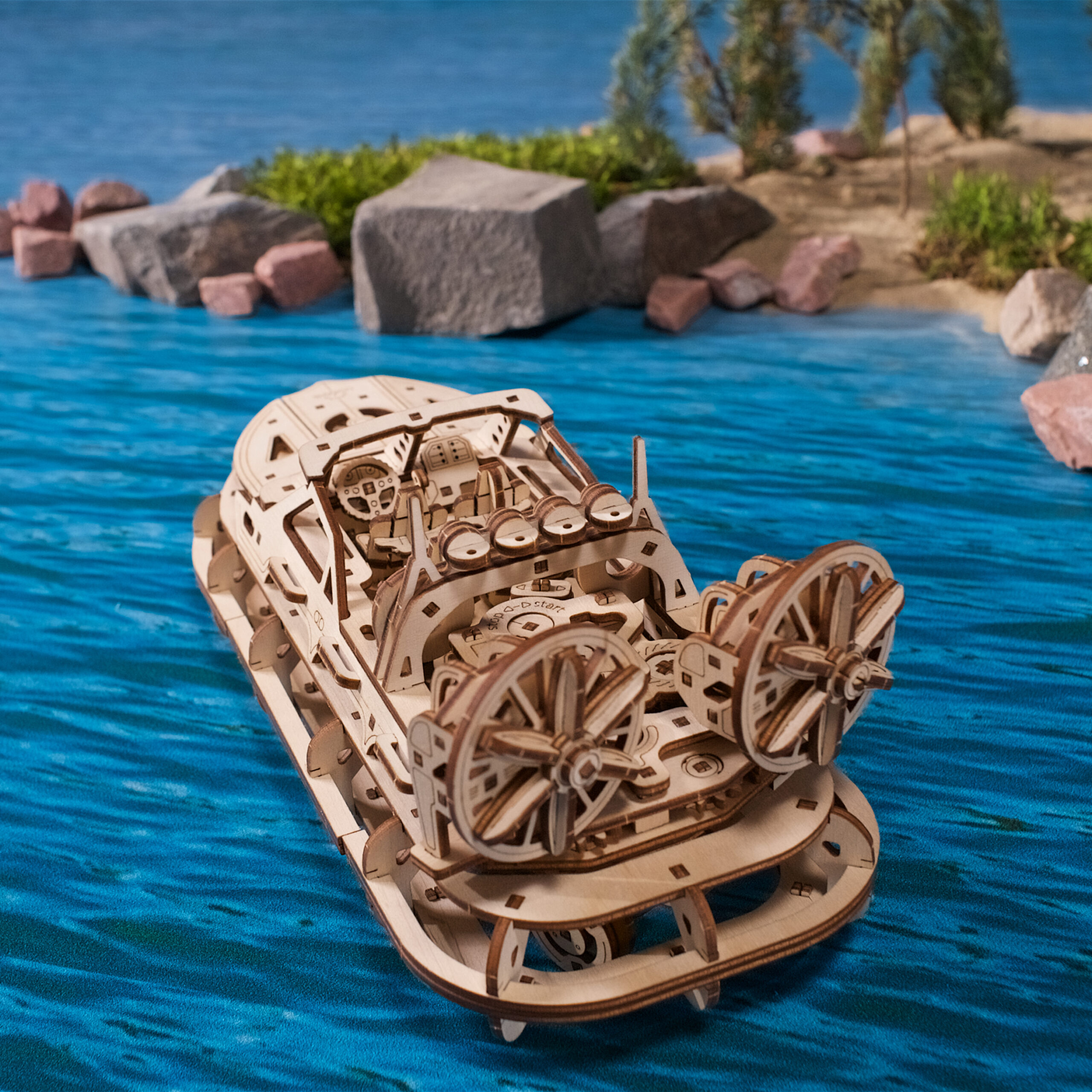 L’Aéroglisseur de sauvetage Ugears est une maquette en bois à l’échelle 1:24 d’un aéroglisseur tout-terrain élégant à deux hélices. Cette maquette en bois à monter soi-même est entraînée par un moteur à ressort, avec une clé à cliquet située sur le train d’atterrissage de l’engin. Un interrupteur Marche/Arrêt vous permet de remonter le moteur en faisant dix tours dans le sens des aiguilles d’une montre, puis d’enclencher le moteur tandis que les hélices à double poussée tournent et que le bateau exécute de gracieux virages préprogrammés à gauche et à droite sur une distance de 3 mètres, imitant le doux mouvement de balancier des véritables aéroglisseurs.
