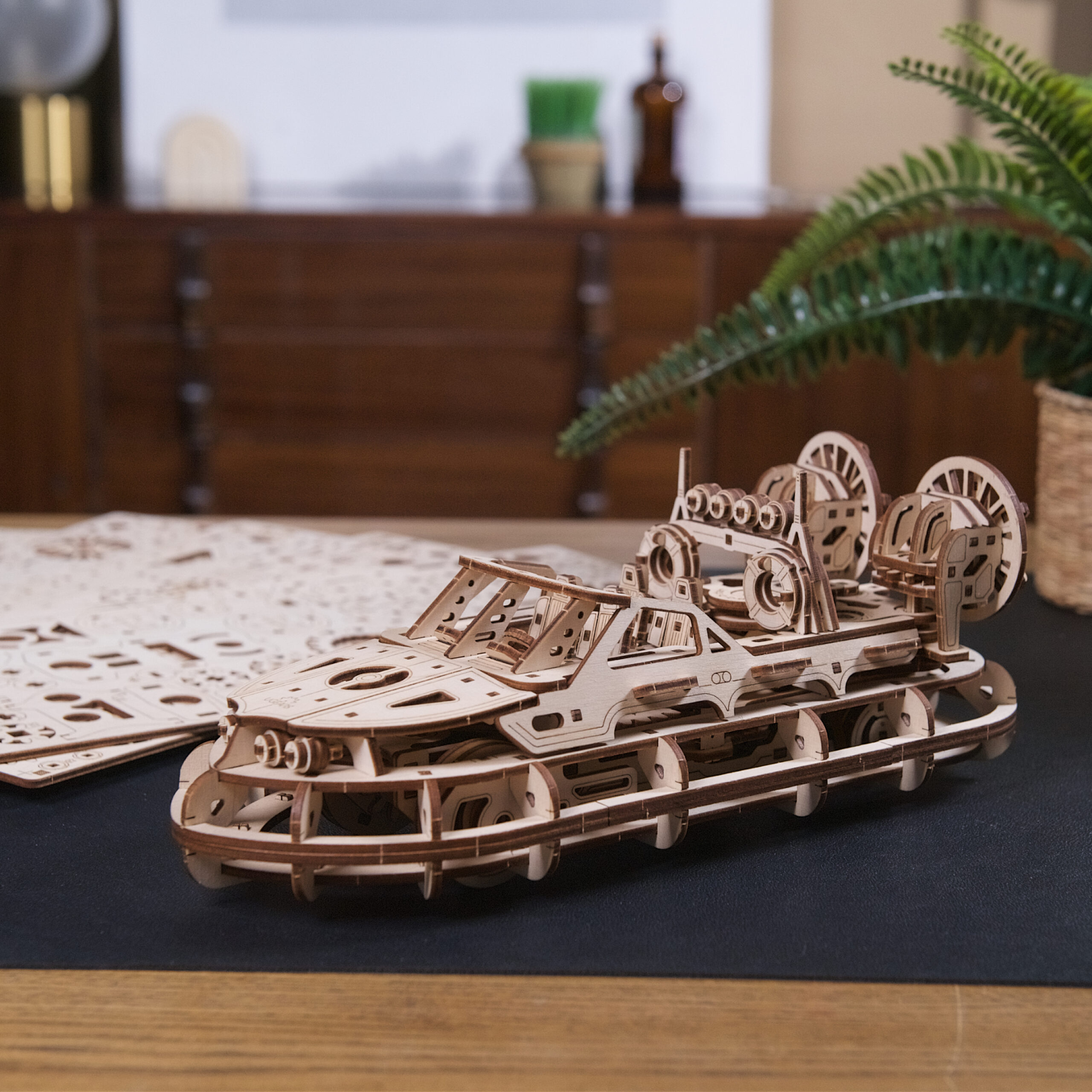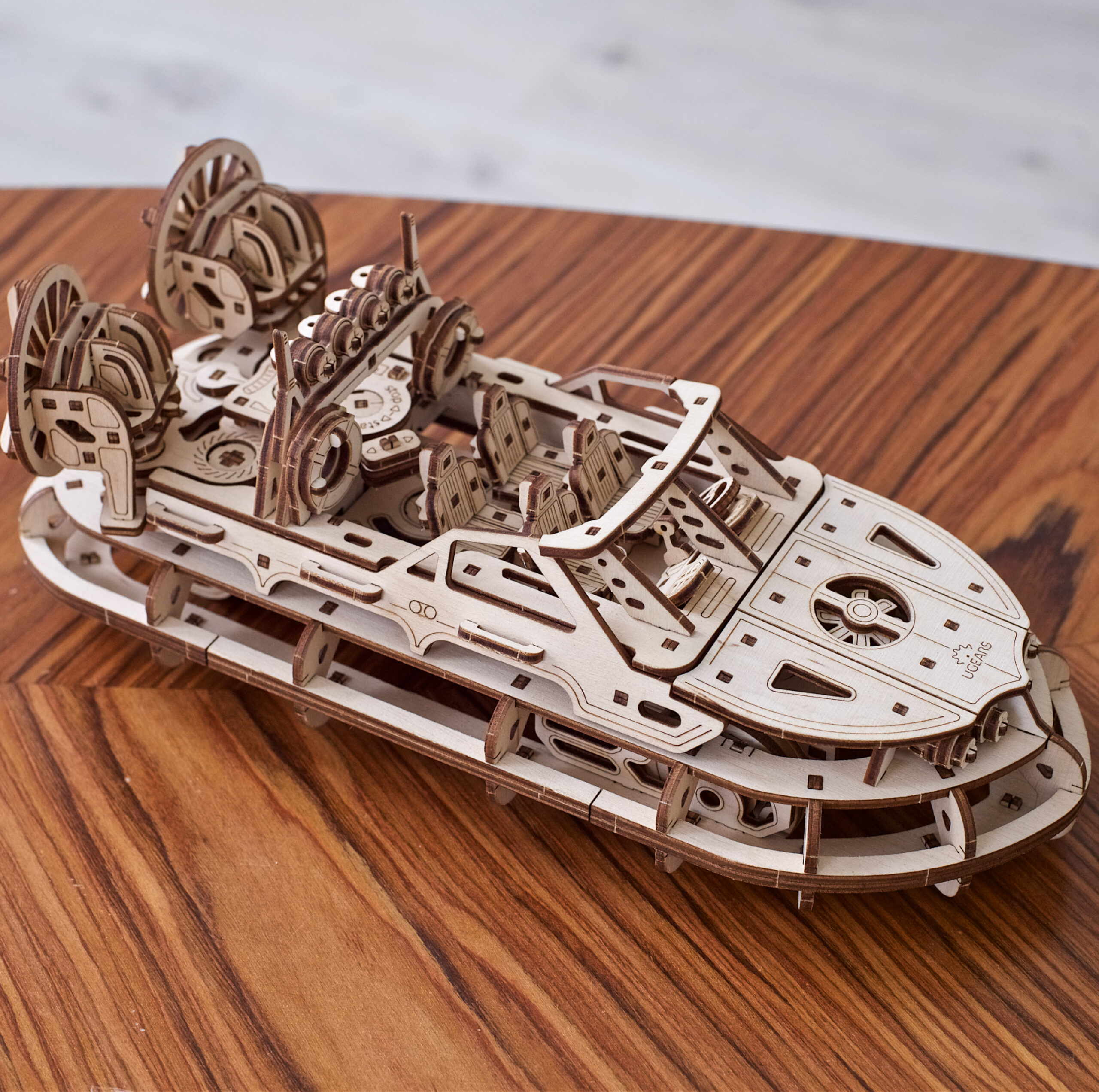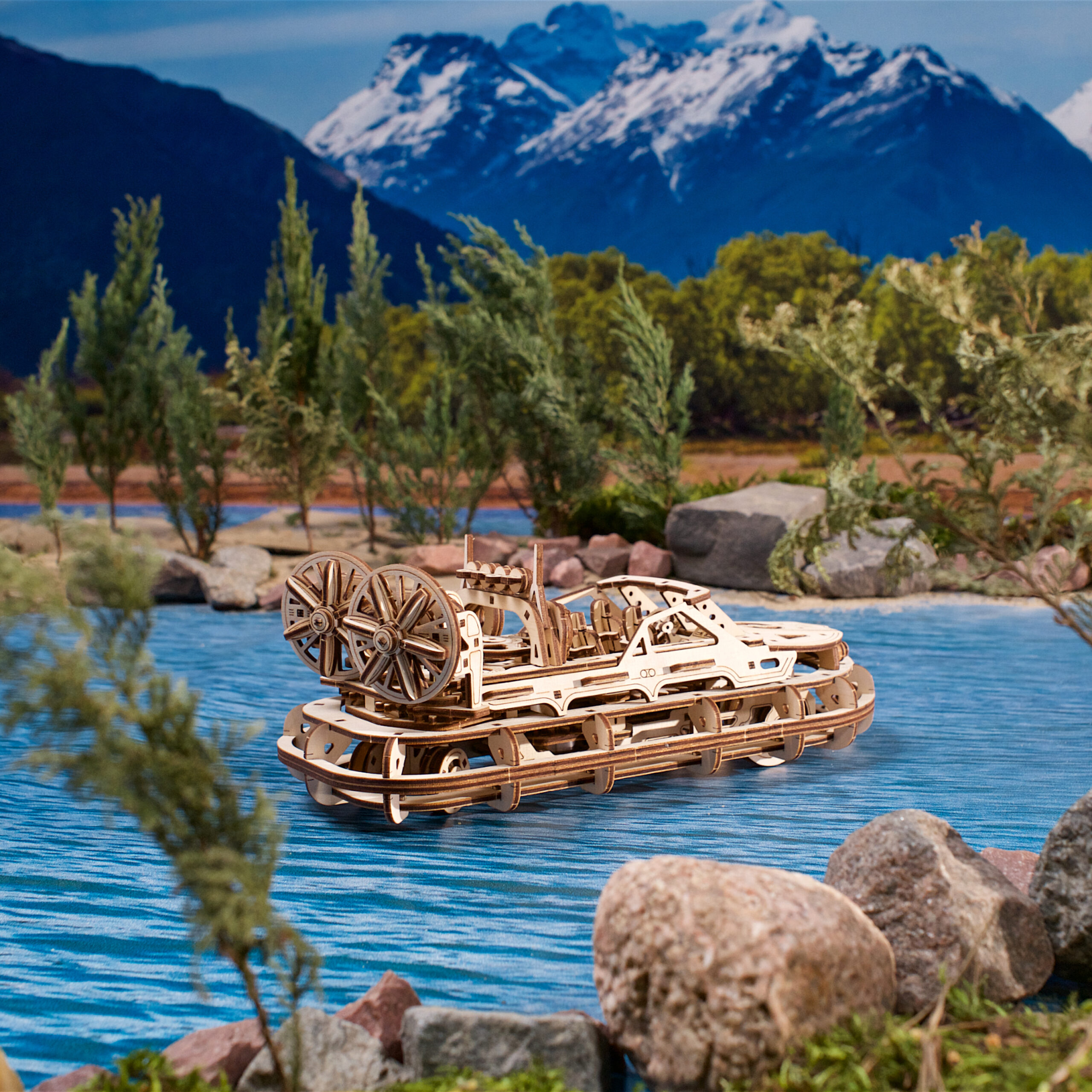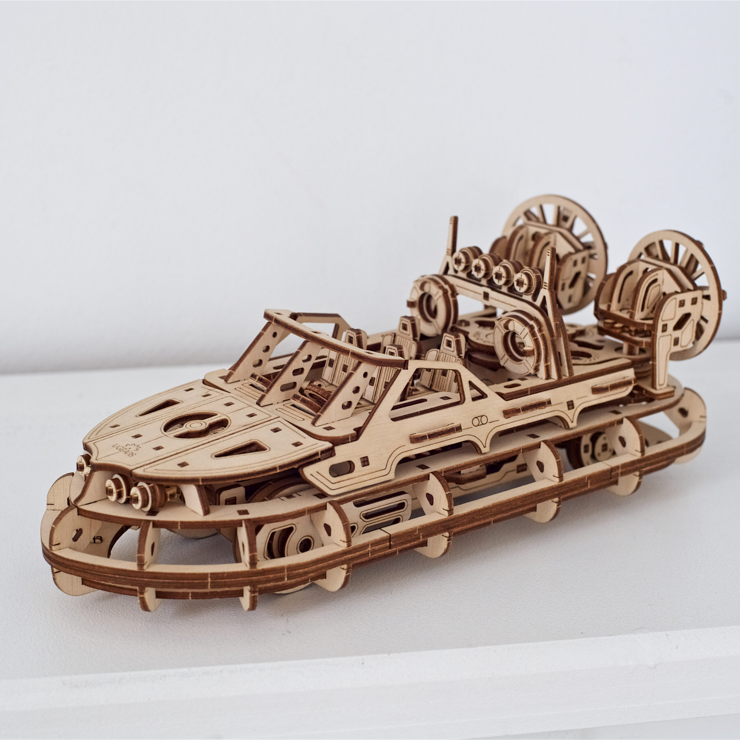 L’Aéroglisseur de sauvetage Ugears est une maquette en bois à l’échelle 1:24 d’un aéroglisseur tout-terrain élégant à deux hélices. Cette maquette en bois à monter soi-même est entraînée par un moteur à ressort, avec une clé à cliquet située sur le train d’atterrissage de l’engin. Un interrupteur Marche/Arrêt vous permet de remonter le moteur en faisant dix tours dans le sens des aiguilles d’une montre, puis d’enclencher le moteur tandis que les hélices à double poussée tournent et que le bateau exécute de gracieux virages préprogrammés à gauche et à droite sur une distance de 3 mètres, imitant le doux mouvement de balancier des véritables aéroglisseurs.