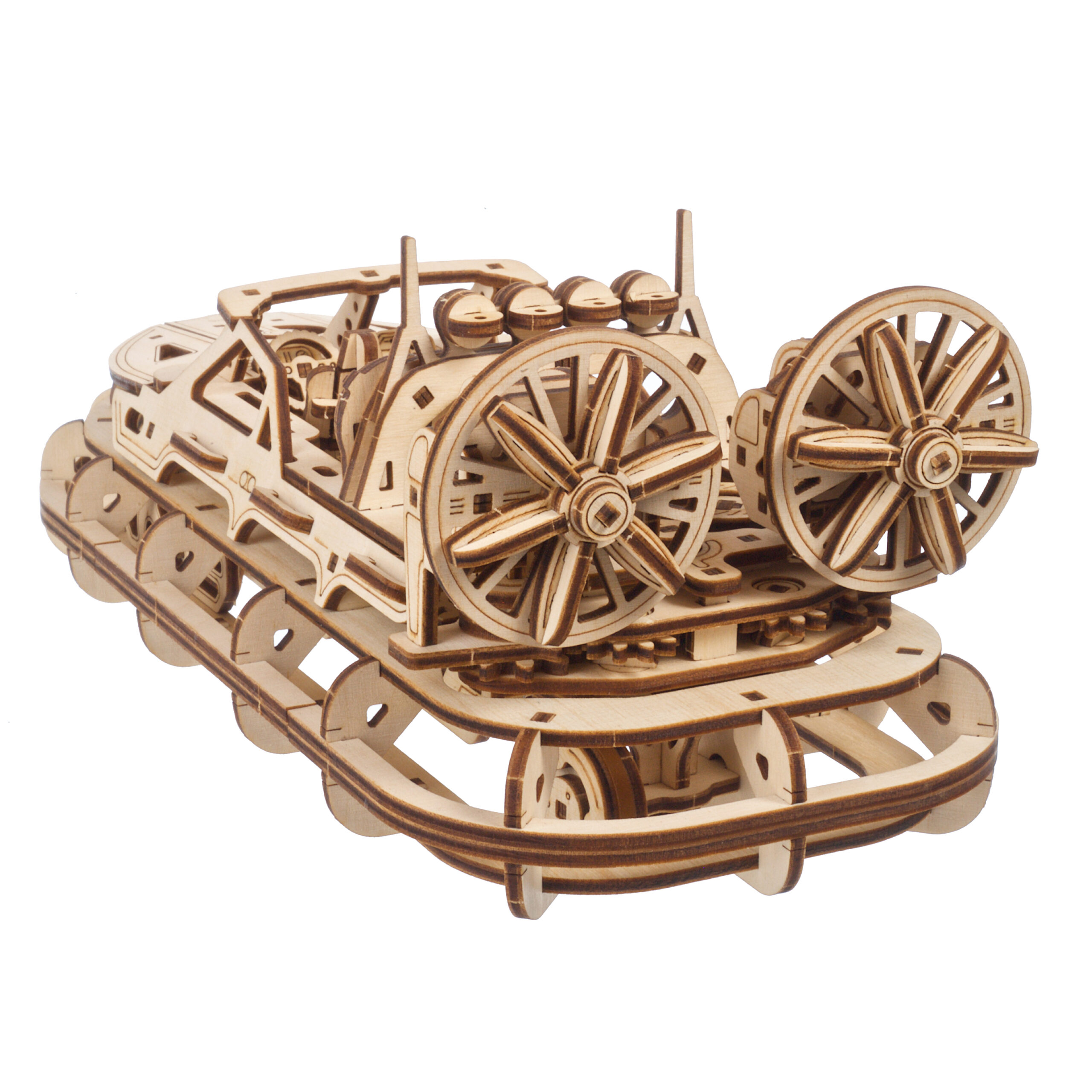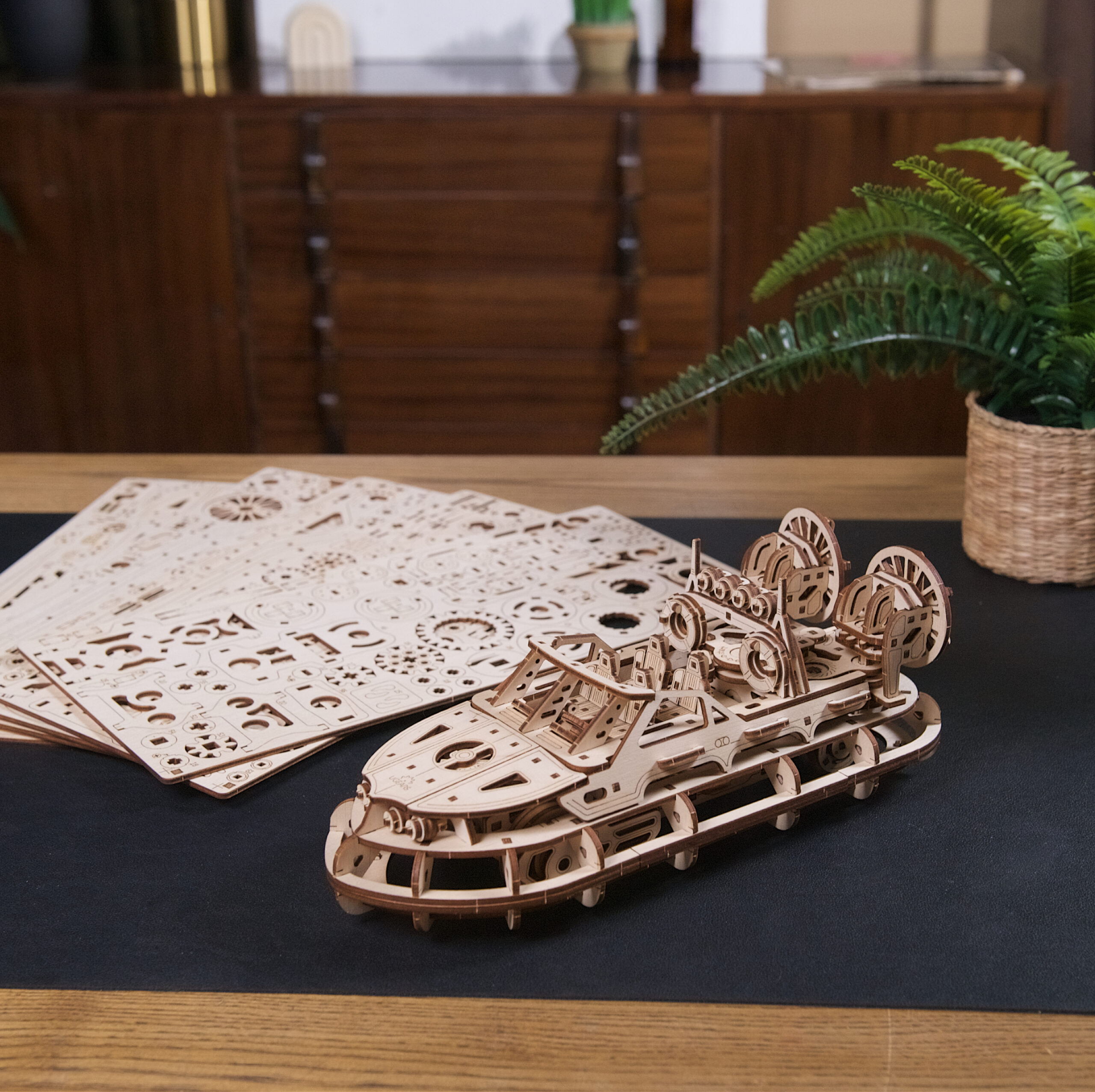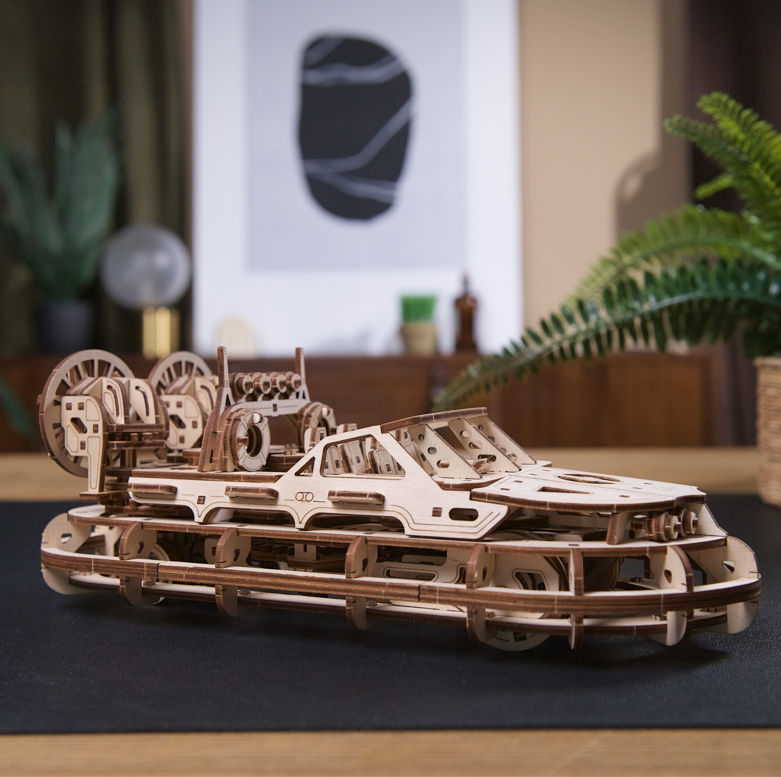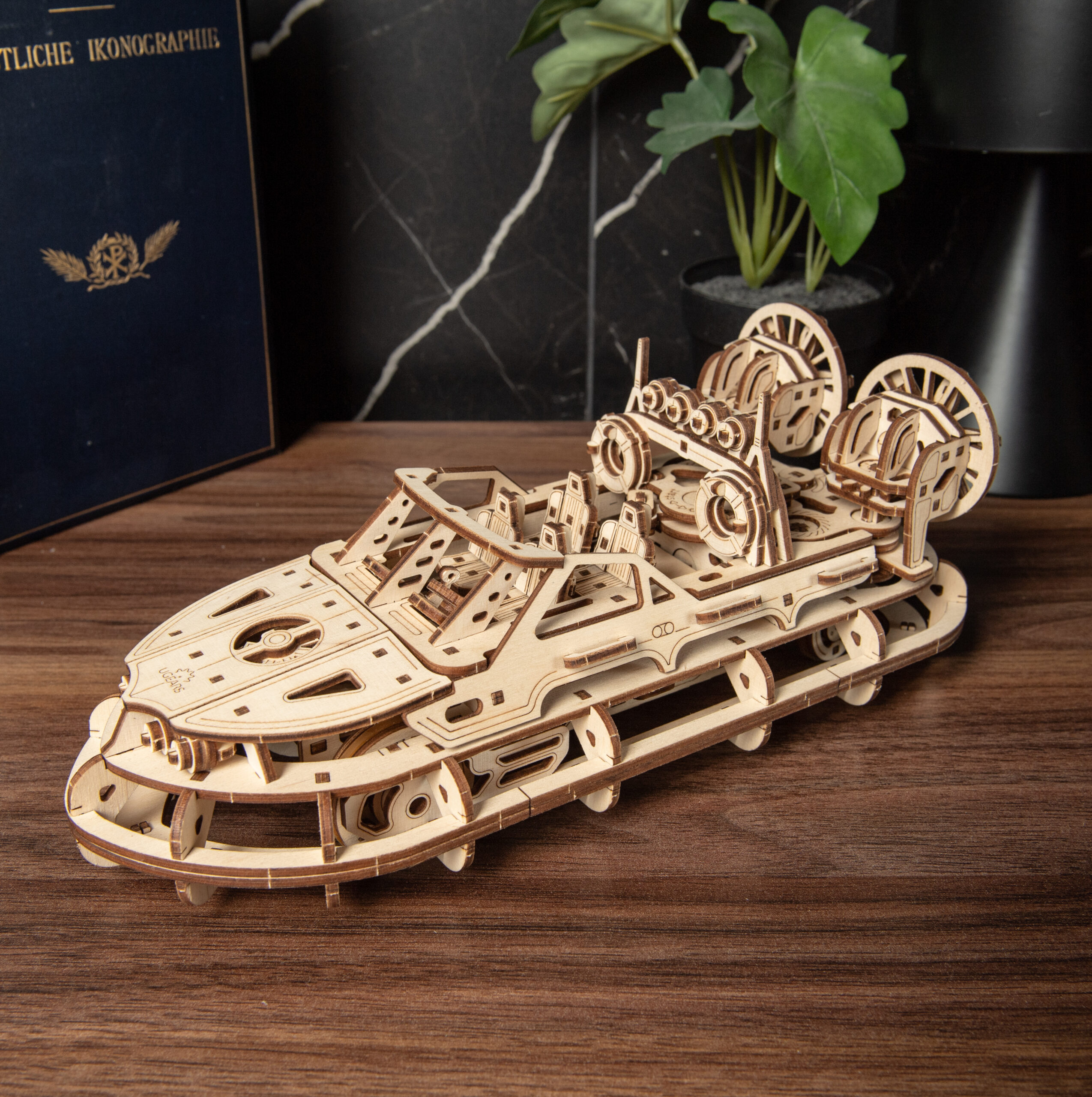 L’Aéroglisseur de sauvetage Ugears est une maquette en bois à l’échelle 1:24 d’un aéroglisseur tout-terrain élégant à deux hélices. Cette maquette en bois à monter soi-même est entraînée par un moteur à ressort, avec une clé à cliquet située sur le train d’atterrissage de l’engin. Un interrupteur Marche/Arrêt vous permet de remonter le moteur en faisant dix tours dans le sens des aiguilles d’une montre, puis d’enclencher le moteur tandis que les hélices à double poussée tournent et que le bateau exécute de gracieux virages préprogrammés à gauche et à droite sur une distance de 3 mètres, imitant le doux mouvement de balancier des véritables aéroglisseurs.