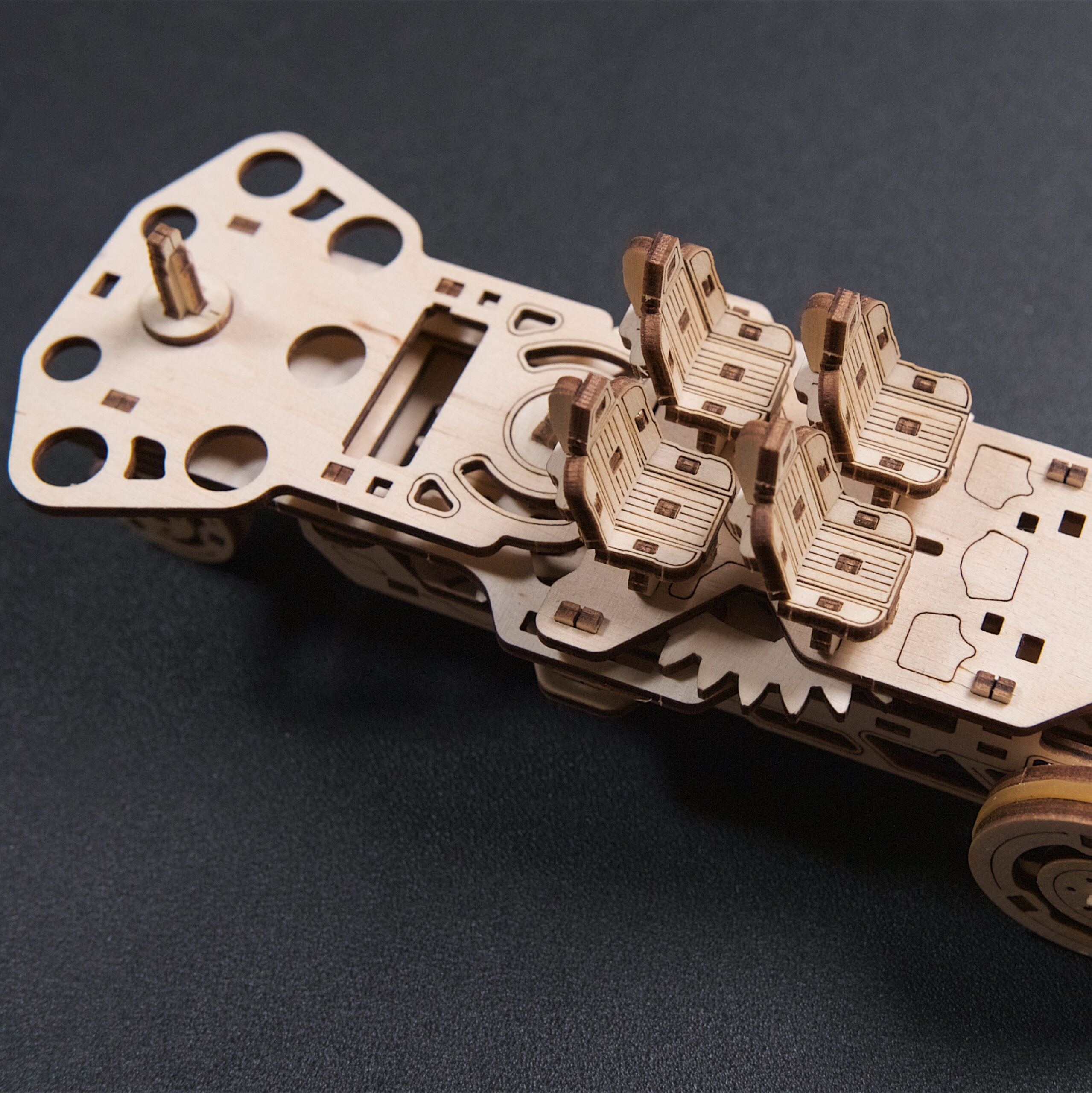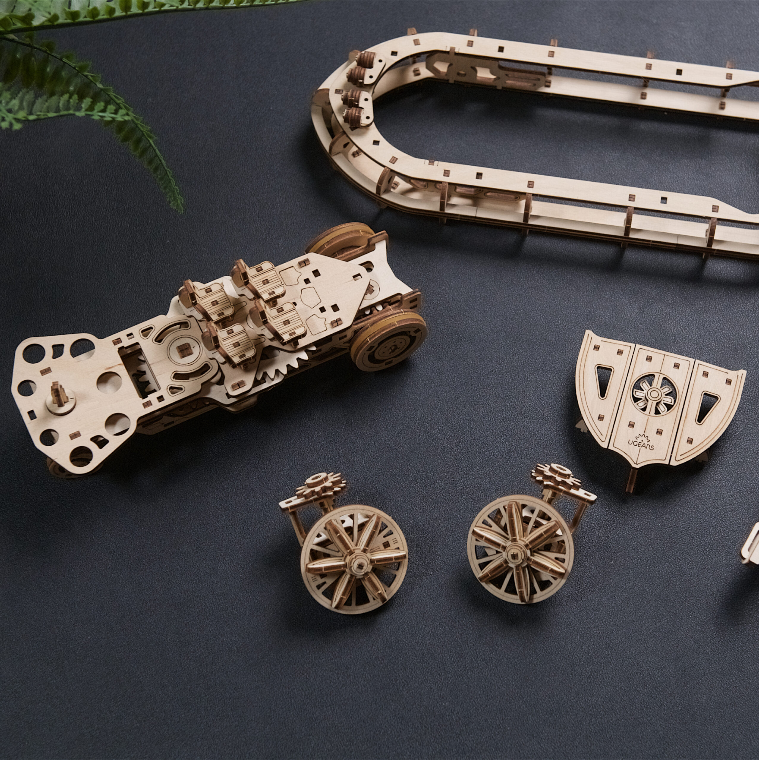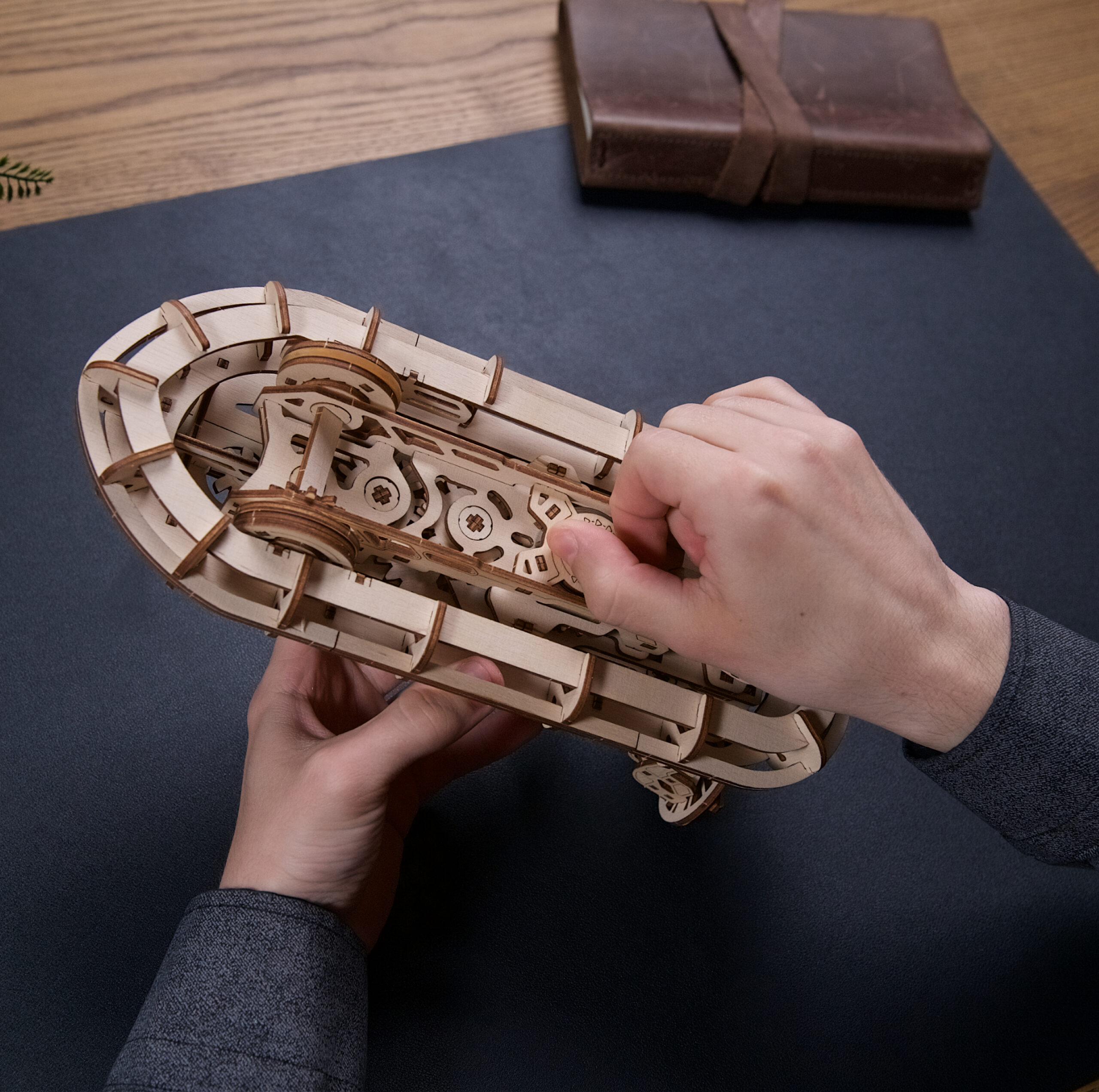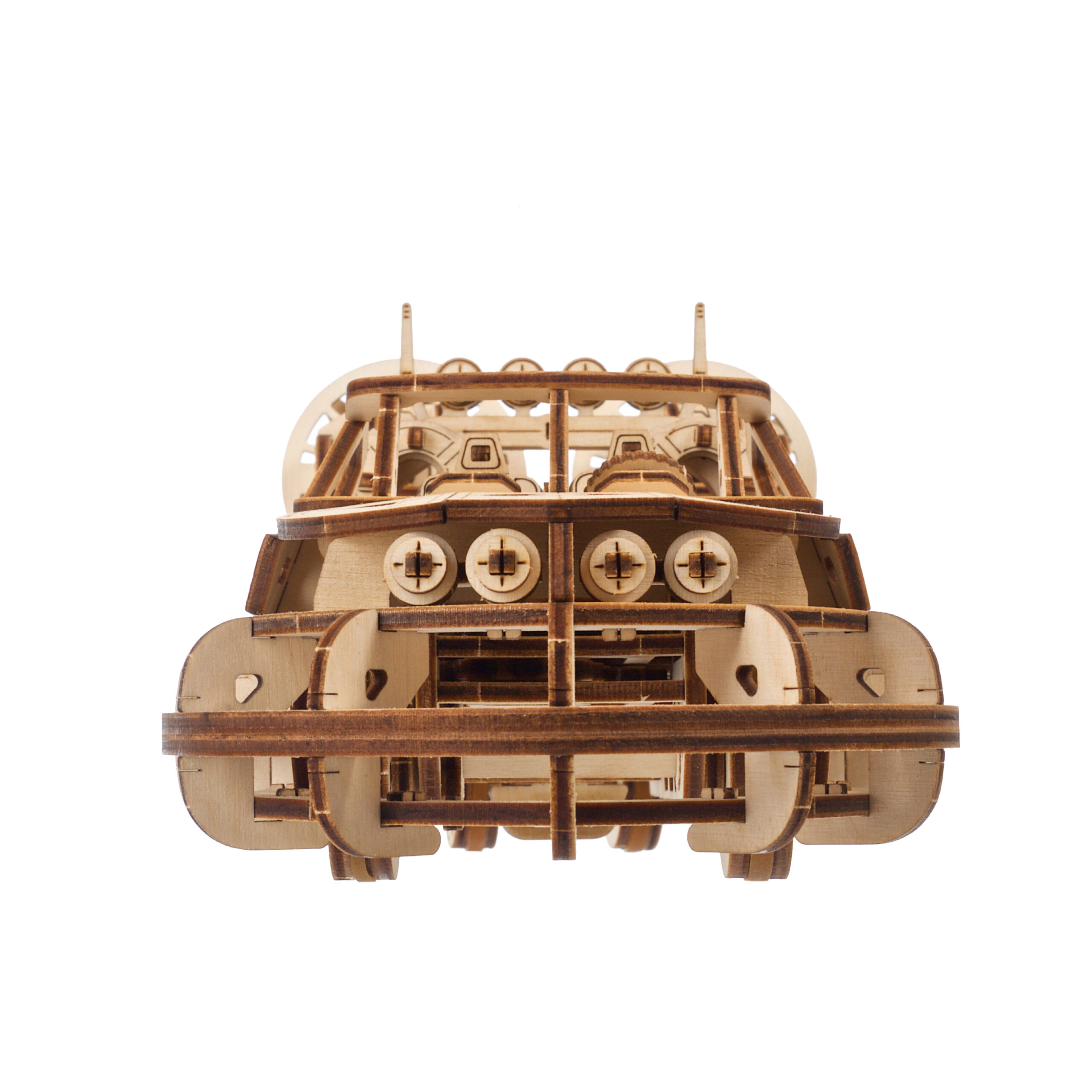 L’Aéroglisseur de sauvetage Ugears est une maquette en bois à l’échelle 1:24 d’un aéroglisseur tout-terrain élégant à deux hélices. Cette maquette en bois à monter soi-même est entraînée par un moteur à ressort, avec une clé à cliquet située sur le train d’atterrissage de l’engin. Un interrupteur Marche/Arrêt vous permet de remonter le moteur en faisant dix tours dans le sens des aiguilles d’une montre, puis d’enclencher le moteur tandis que les hélices à double poussée tournent et que le bateau exécute de gracieux virages préprogrammés à gauche et à droite sur une distance de 3 mètres, imitant le doux mouvement de balancier des véritables aéroglisseurs.
