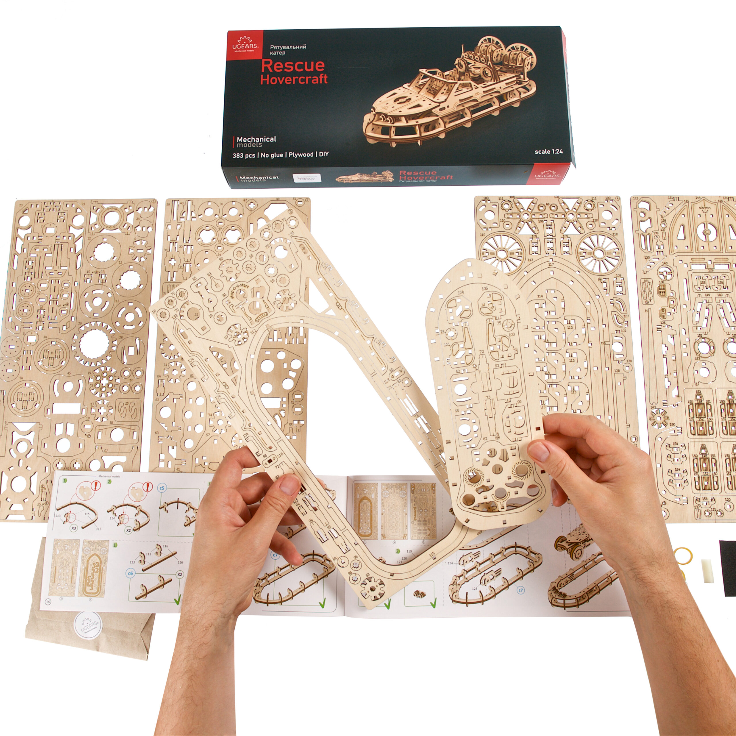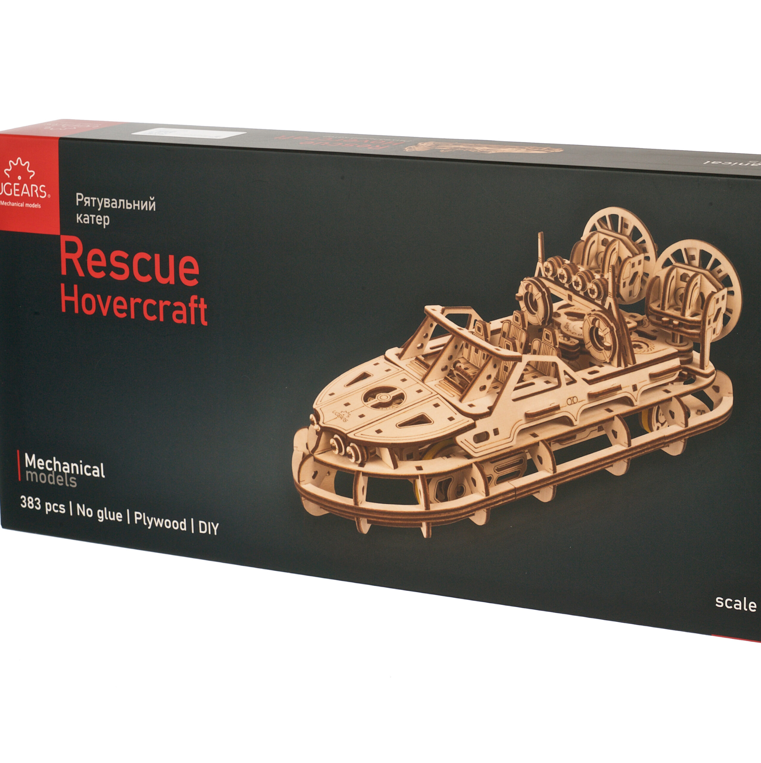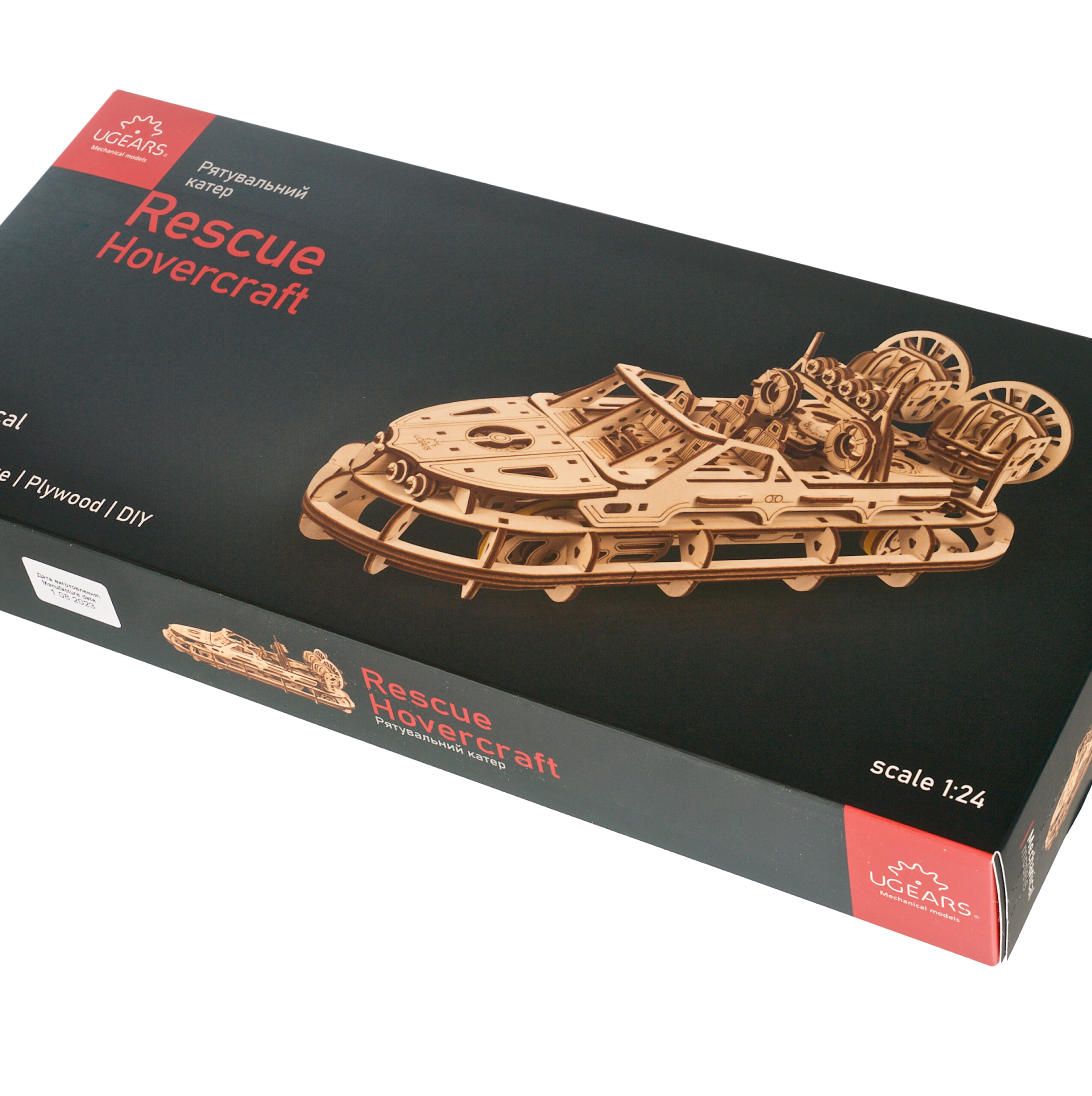 Les modèles Ugears se distinguent par leur réalisme exceptionnel, leur conception intelligente et leur souci du détail. L’Aéroglisseur de sauvetage est doté d’une large jupe à coussin d’air, d’un ventilateur de levage mobile et manuel à l’avant, de ventilateurs de levage gravés au laser à l’arrière, de deux grands ventilateurs de poussée entraînés par le moteur, d’un poste de pilotage et d’un cockpit avec des sièges pour quatre personnes, de deux anneaux de sauvetage intégrés, de phares encastrés à l’avant et de projecteurs montés à l’arrière du cockpit pour les sauvetages nocturnes.