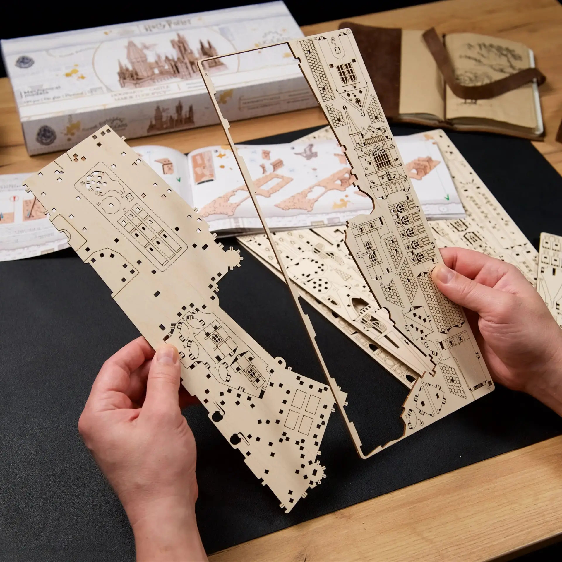 La maquette est recommandée pour les personnes de 14 ans et plus, et est d’un niveau de difficulté « Moyen » avec 340 pièces et un temps d’assemblage estimé à 6 heures. Les pièces sont prédécoupées au laser dans des planches de bois composite de qualité artistique. Pour les assembler, il suffit de détacher les pièces des planches et de les emboîter en suivant les instructions détaillées et illustrées disponibles en 11 langues (anglais, allemand, ukrainien, français, polonais, espagnol, portugais, japonais, italien, chinois et coréen). Aucune colle ni aucun outil spécial n’est nécessaire pour construire le château de Poudlard™ : tout ce dont vous avez besoin pour l’assemblage est inclus dans la boîte.