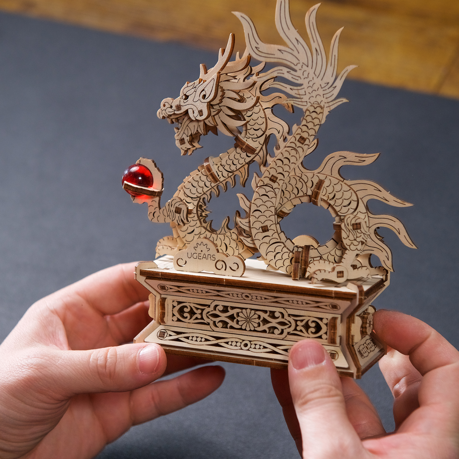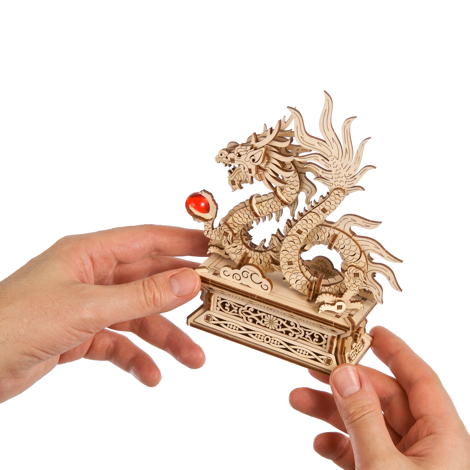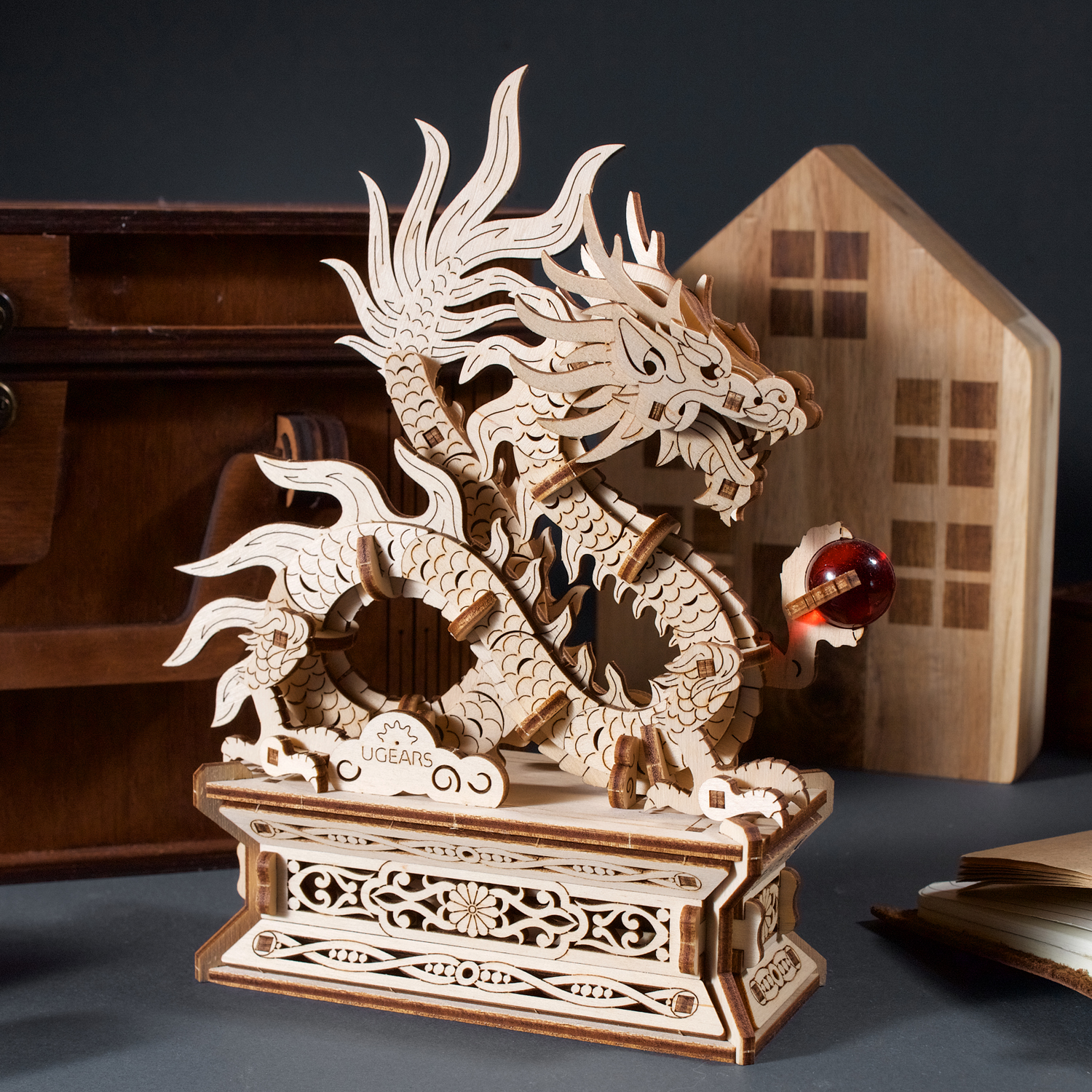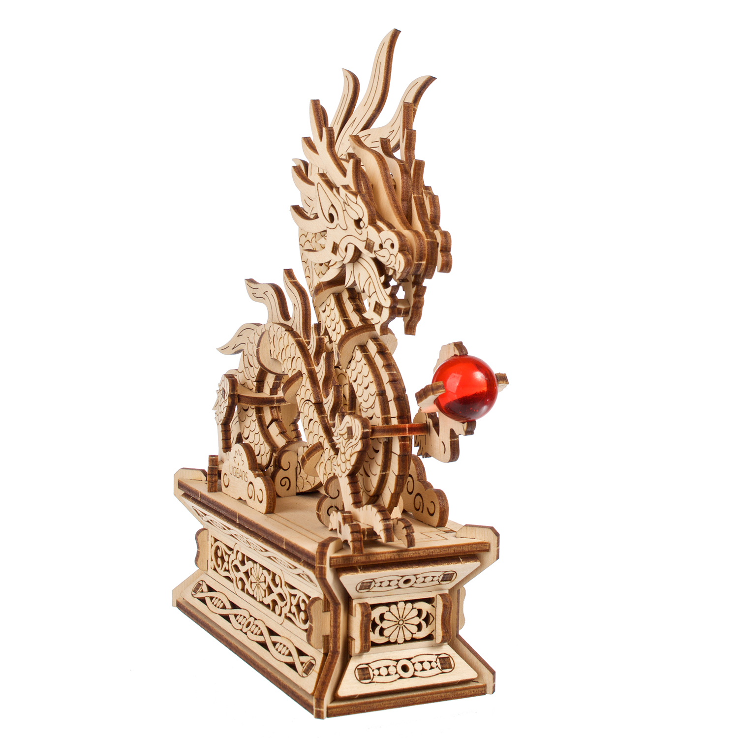 Le Dragon de bois Ugears est une boîte puzzle en 3D et une maquette à monter soi-même représentant un dragon porte-bonheur qui tient une perle rouge flamboyante dans sa griffe gauche. Le long dragon de bois, enroulé et doté de quatre membres, s’inspire des représentations de dragons dans l’art chinois. Il repose sur un support spécial doté d’un tiroir caché qui s’ouvre lorsque l’on appuie sur un bouton secret, déguisé en fleur (le tiroir se referme manuellement). Le dragon est entièrement détachable et peut être posé sur n’importe quelle surface et admiré séparément du support. Rangez un message secret, une fortune ou un petit trésor à l’intérieur du socle du Dragon de bois. Vous pouvez même placer une enveloppe rouge spéciale (appelée 紅包, ou hóngbāo) à l’intérieur du tiroir, contenant un cadeau pour le Nouvel An lunaire, puis présenter le Dragon de bois à deux mains et mettre le destinataire au défi d’ouvrir la boîte à trésors !