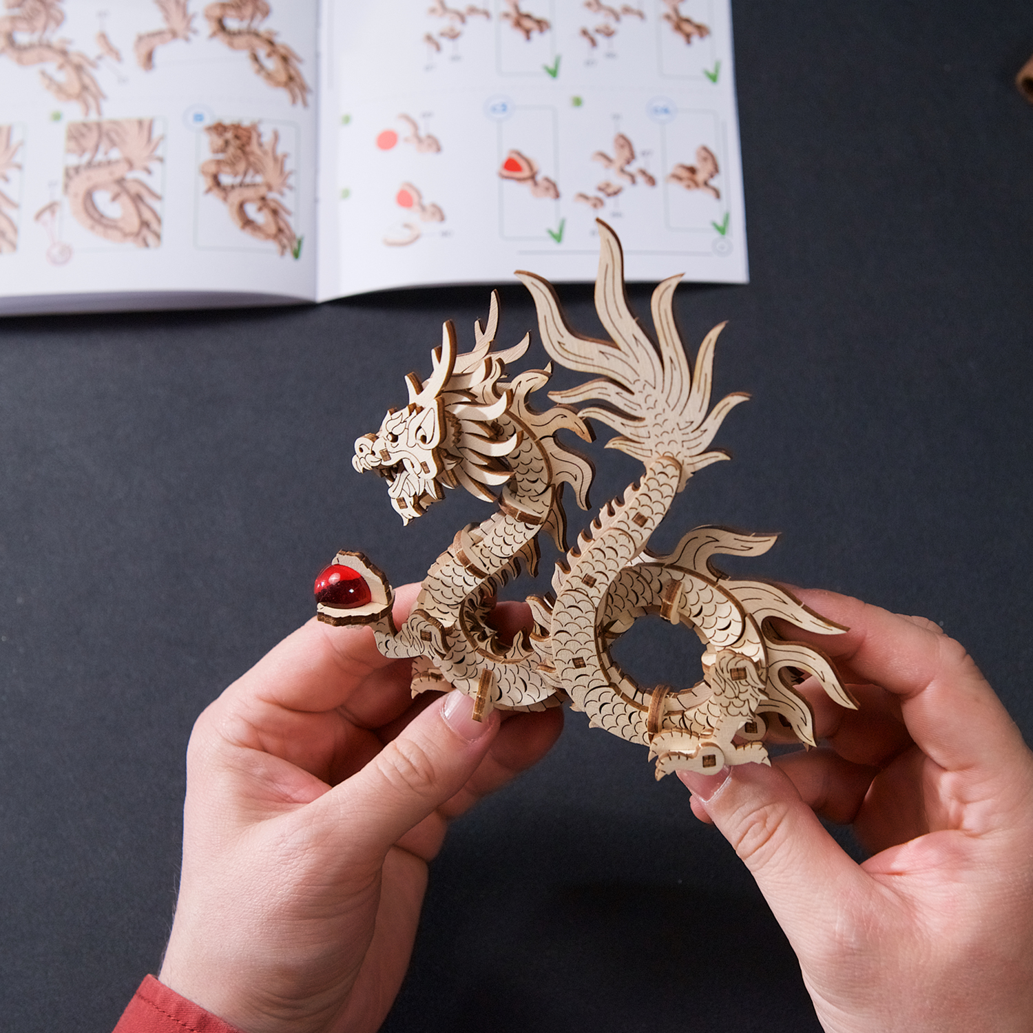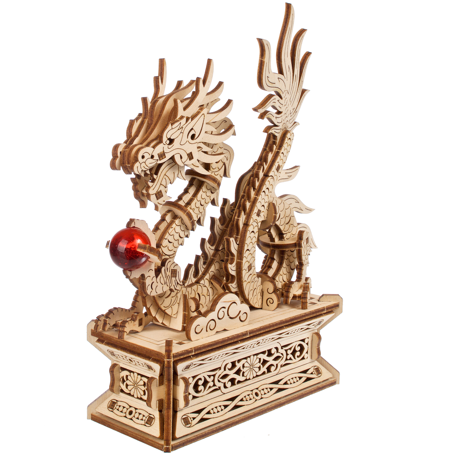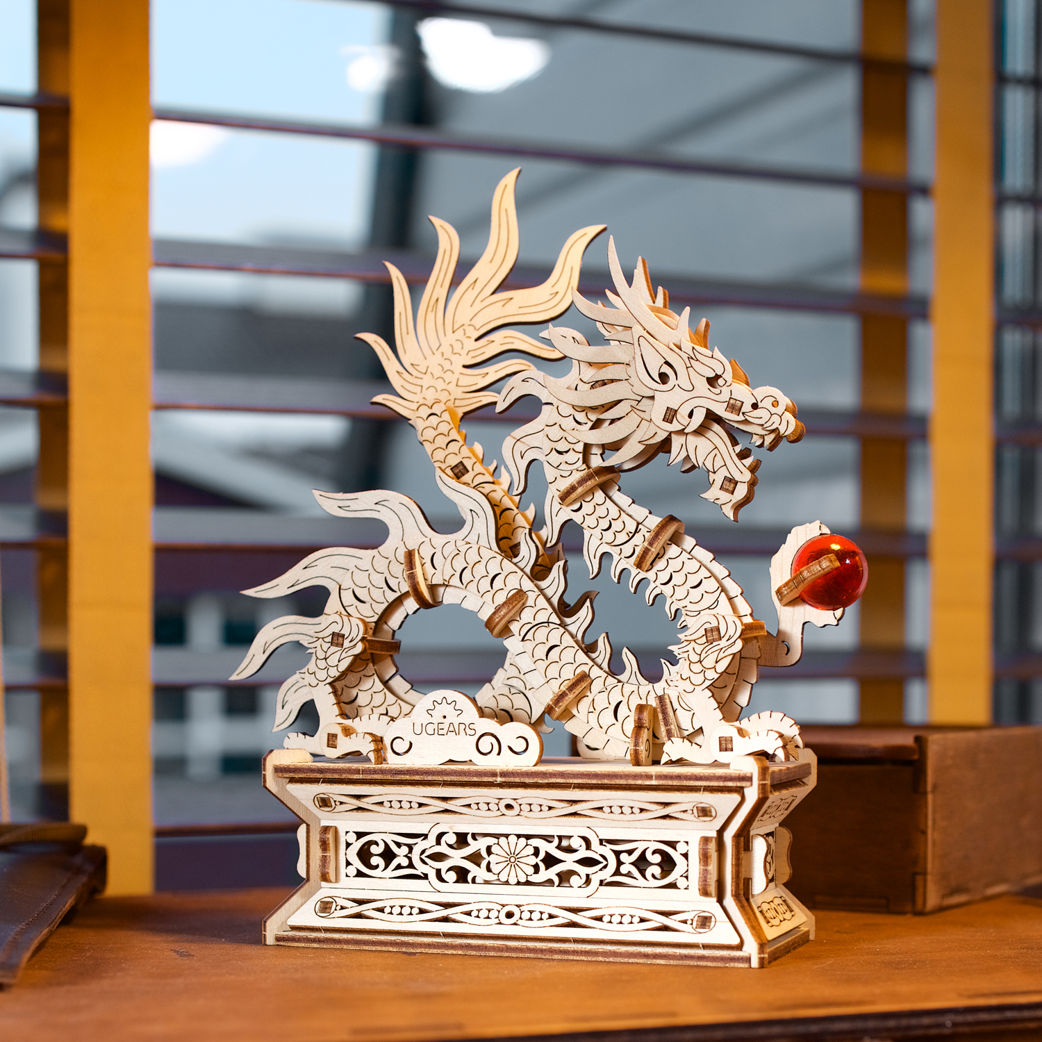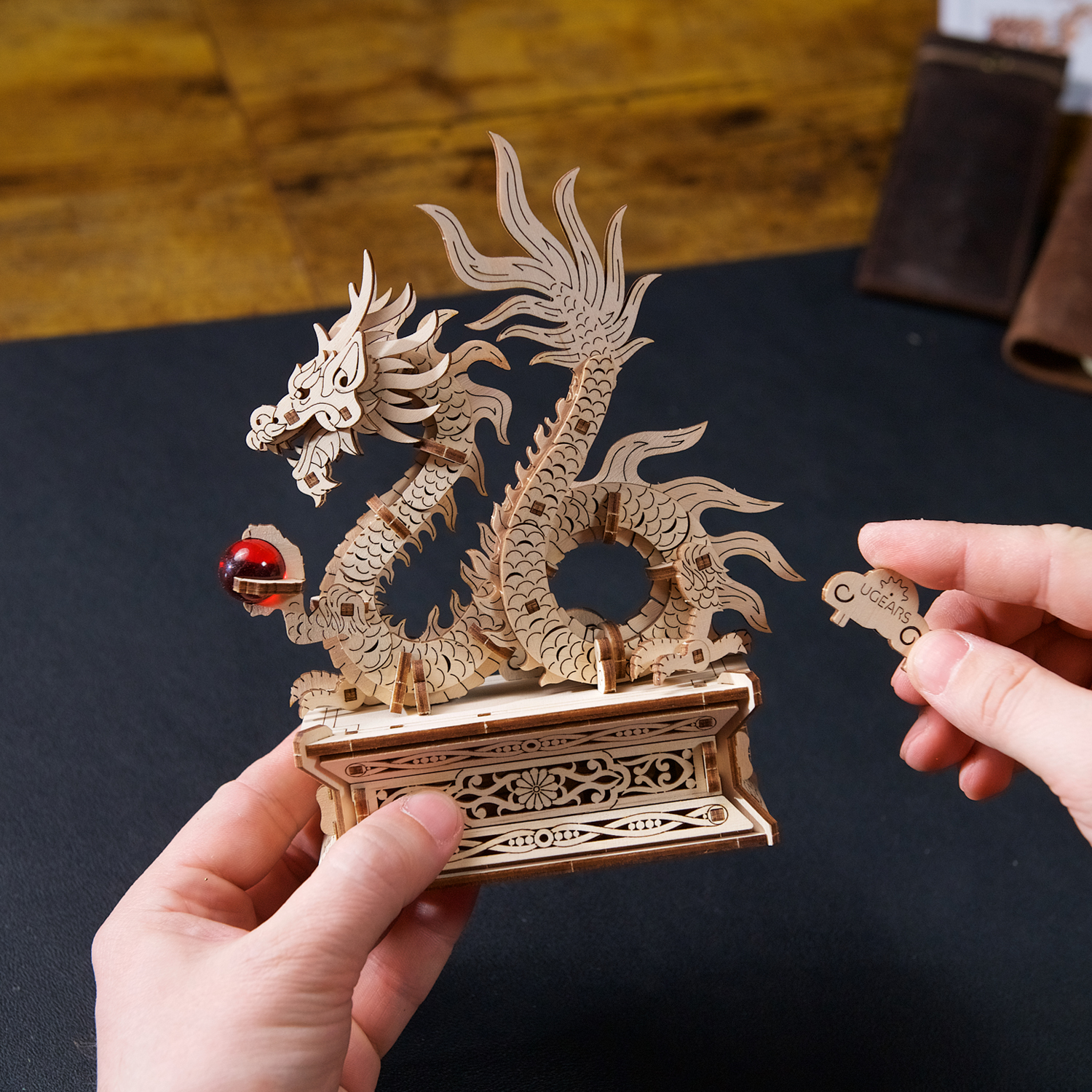 Le Dragon de bois Ugears est une boîte puzzle en 3D et une maquette à monter soi-même représentant un dragon porte-bonheur qui tient une perle rouge flamboyante dans sa griffe gauche. Le long dragon de bois, enroulé et doté de quatre membres, s’inspire des représentations de dragons dans l’art chinois. Il repose sur un support spécial doté d’un tiroir caché qui s’ouvre lorsque l’on appuie sur un bouton secret, déguisé en fleur (le tiroir se referme manuellement). Le dragon est entièrement détachable et peut être posé sur n’importe quelle surface et admiré séparément du support. Rangez un message secret, une fortune ou un petit trésor à l’intérieur du socle du Dragon de bois. Vous pouvez même placer une enveloppe rouge spéciale (appelée 紅包, ou hóngbāo) à l’intérieur du tiroir, contenant un cadeau pour le Nouvel An lunaire, puis présenter le Dragon de bois à deux mains et mettre le destinataire au défi d’ouvrir la boîte à trésors !