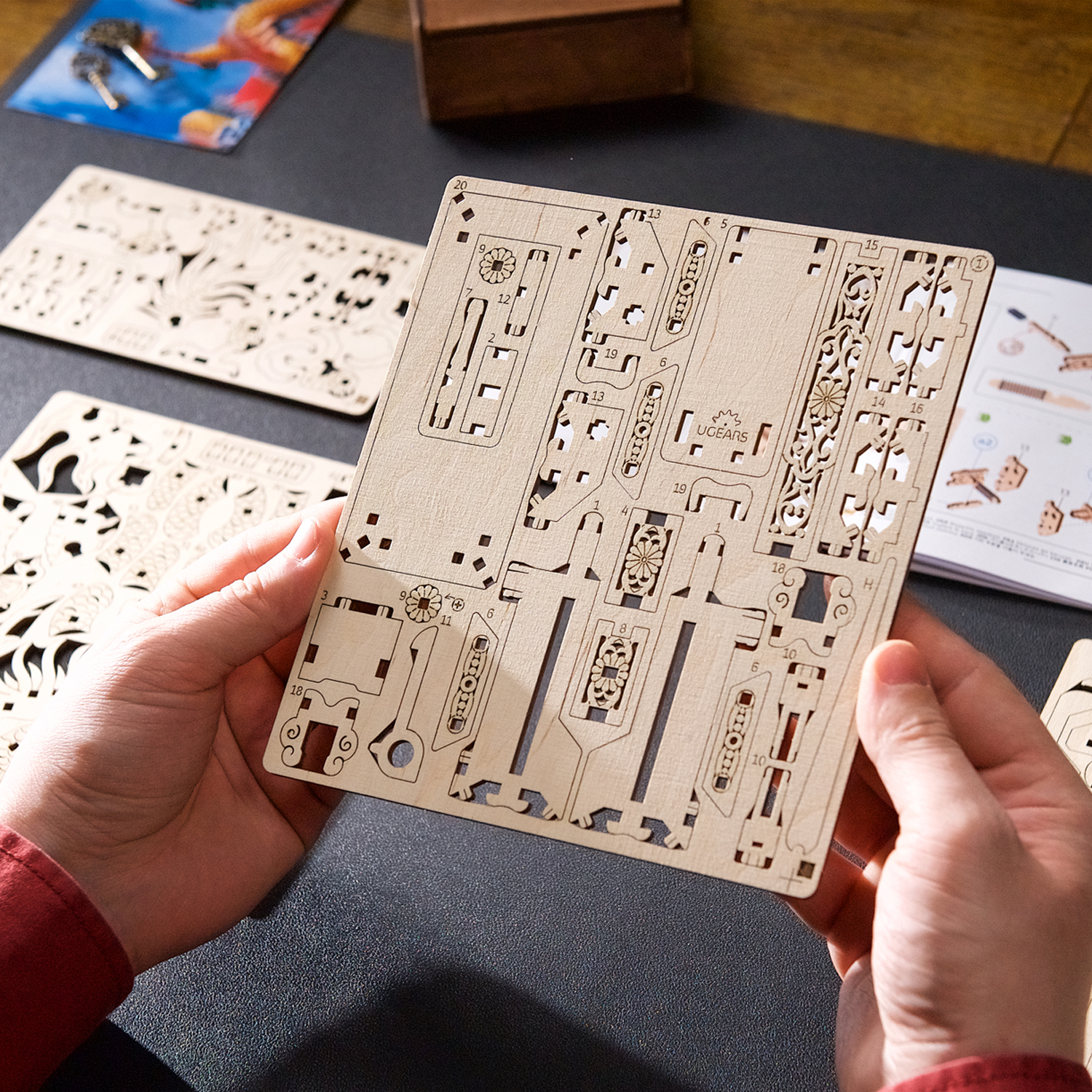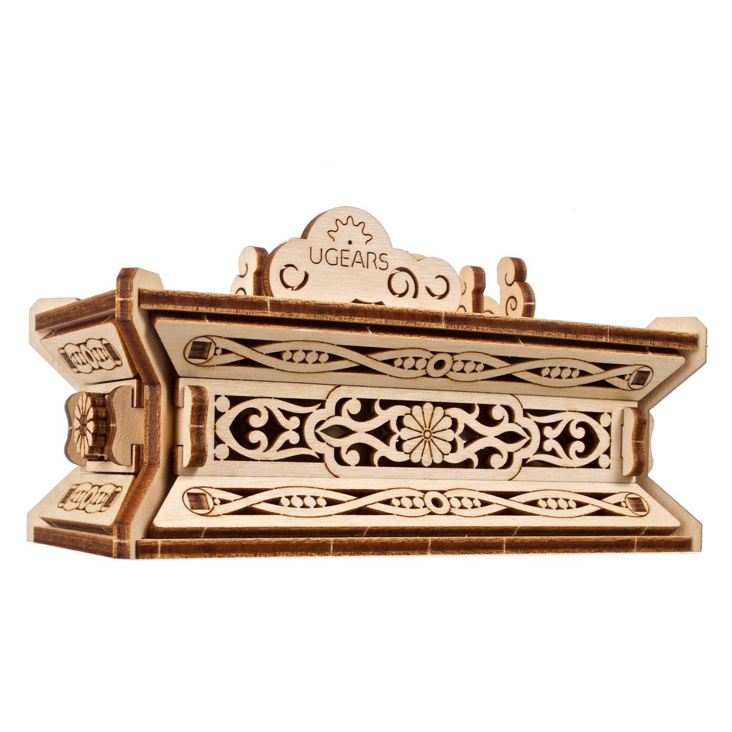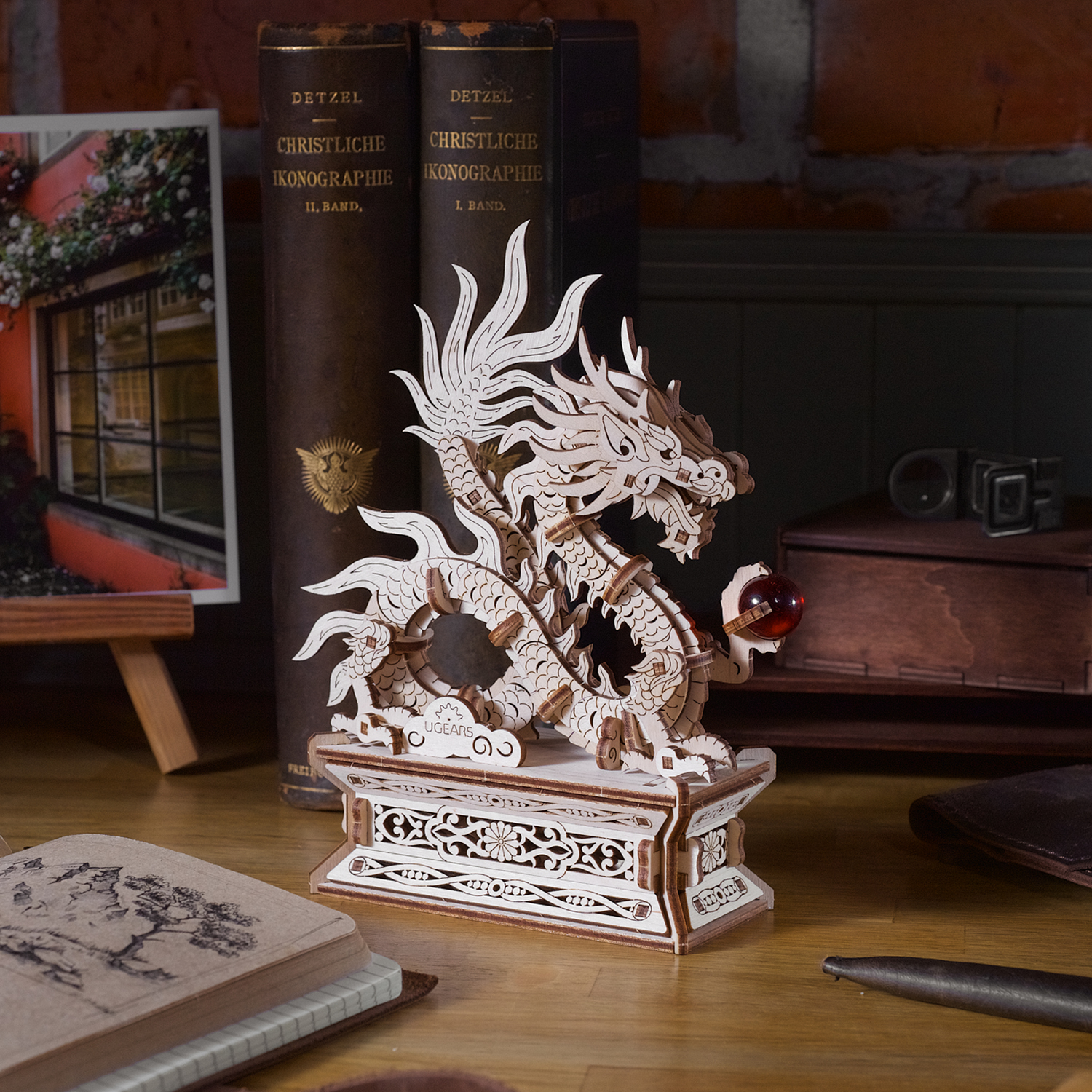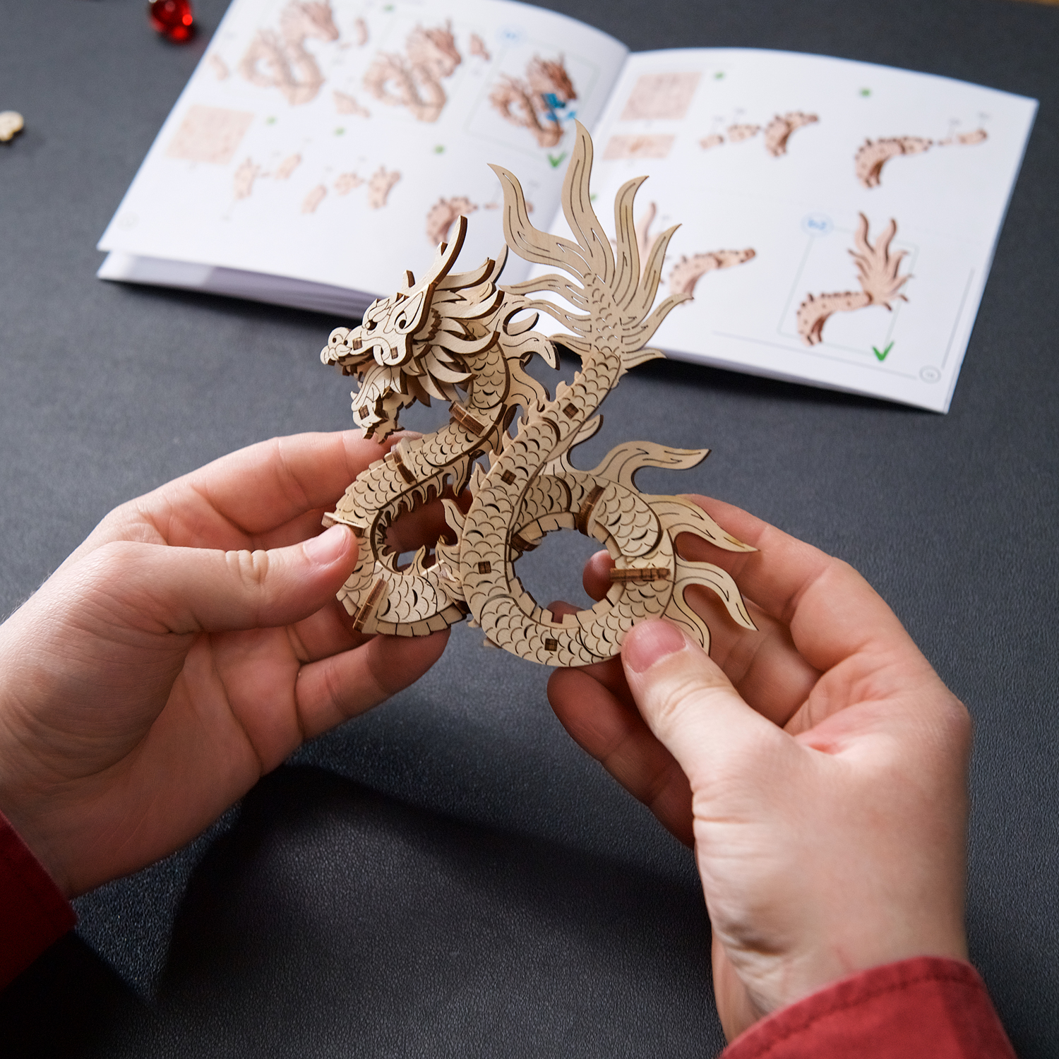 Le Dragon de bois Ugears est une boîte puzzle en 3D et une maquette à monter soi-même représentant un dragon porte-bonheur qui tient une perle rouge flamboyante dans sa griffe gauche. Le long dragon de bois, enroulé et doté de quatre membres, s’inspire des représentations de dragons dans l’art chinois. Il repose sur un support spécial doté d’un tiroir caché qui s’ouvre lorsque l’on appuie sur un bouton secret, déguisé en fleur (le tiroir se referme manuellement). Le dragon est entièrement détachable et peut être posé sur n’importe quelle surface et admiré séparément du support. Rangez un message secret, une fortune ou un petit trésor à l’intérieur du socle du Dragon de bois. Vous pouvez même placer une enveloppe rouge spéciale (appelée 紅包, ou hóngbāo) à l’intérieur du tiroir, contenant un cadeau pour le Nouvel An lunaire, puis présenter le Dragon de bois à deux mains et mettre le destinataire au défi d’ouvrir la boîte à trésors !