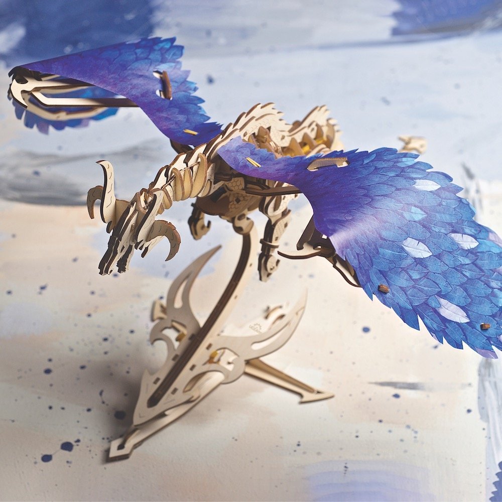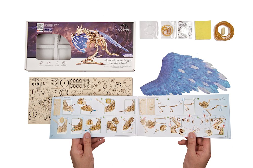 Le modèle a une clé de remontage dans la partie frontale de sa poitrine. Pour l’enrouler, tenez le dragon par son corps et tournez la clé dans le sens des aiguilles d’une montre. Relâchez le moteur en tirant sur le levier de démarrage. C’est à ce moment que la magie commence: les bras, les jambes et même tout le corps du Dragon commenceront à bouger. Et bien sûr, l’étonnante paire d’ailes fortes et belles sera mise en mouvement. C’est la particularité de votre dragon Ugears: les os des ailes sont en bois, mais le reste est constitué de découpes en papier plumeuses magnifiquement conçues. Un matériau plus doux et flexible rend le vol très réaliste et laisse de la place à vos propres idées.