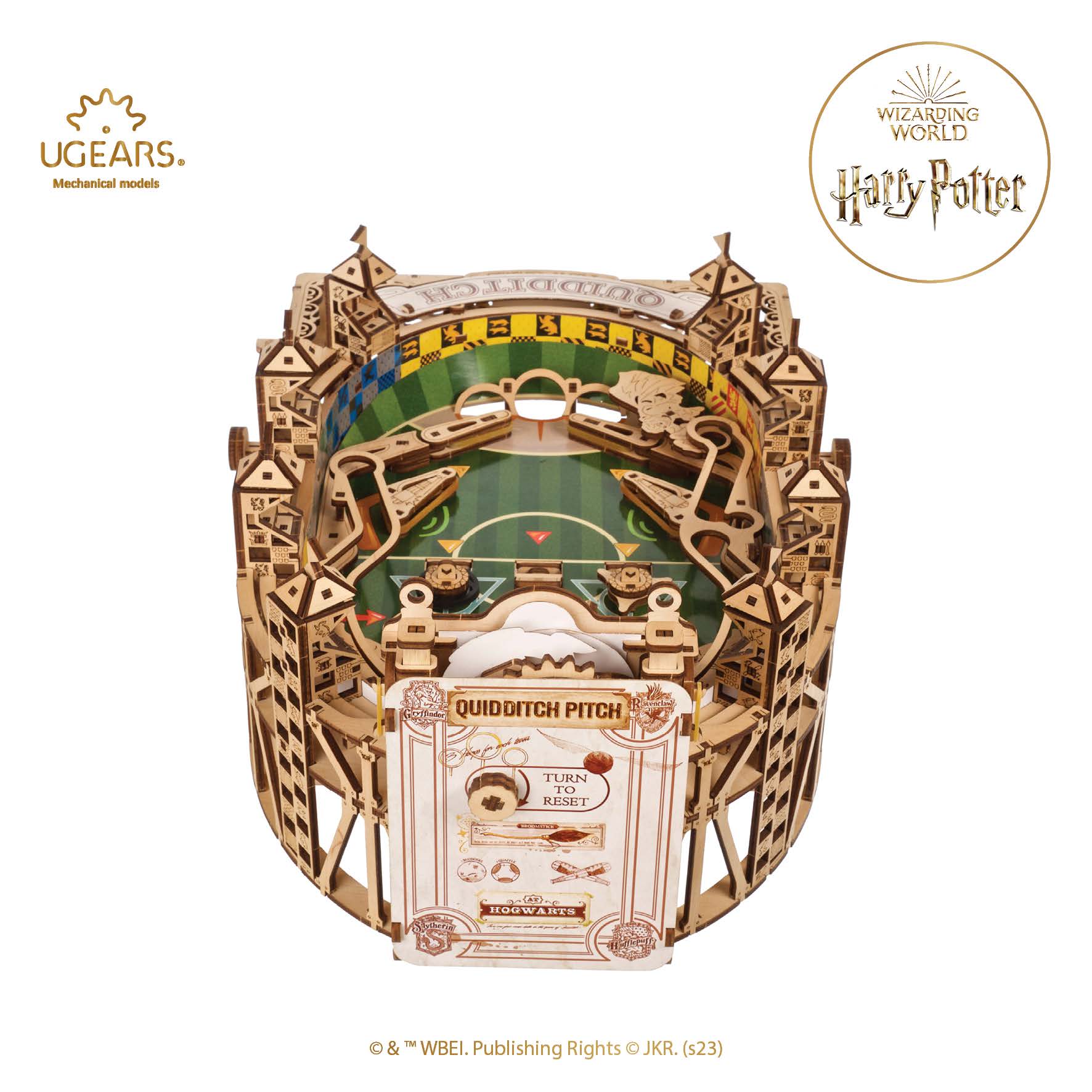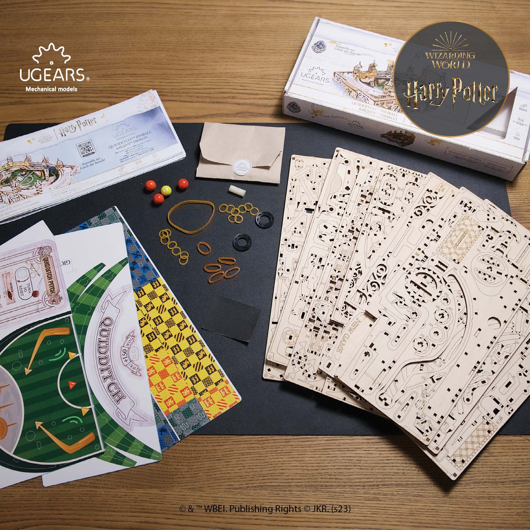 La maquette de Flipper Quidditch™ à monter soi-même de chez Ugears est un stade visuellement époustouflant qui comprend un terrain de jeu en carton imprimé d’éléments décoratifs, 8 plateformes d’observation surélevées gravées des logos des quatre maisons des Poudlard™ (Gryffondor™, Poufsouffle™, Serdaigle™ et Serpentard™), un tableau de points fonctionnel, un coffre pour ranger le Vif d’or et trois billes rouges ainsi que des éléments de flipper fonctionnels dont des pales, tampons, cibles et obstacles.