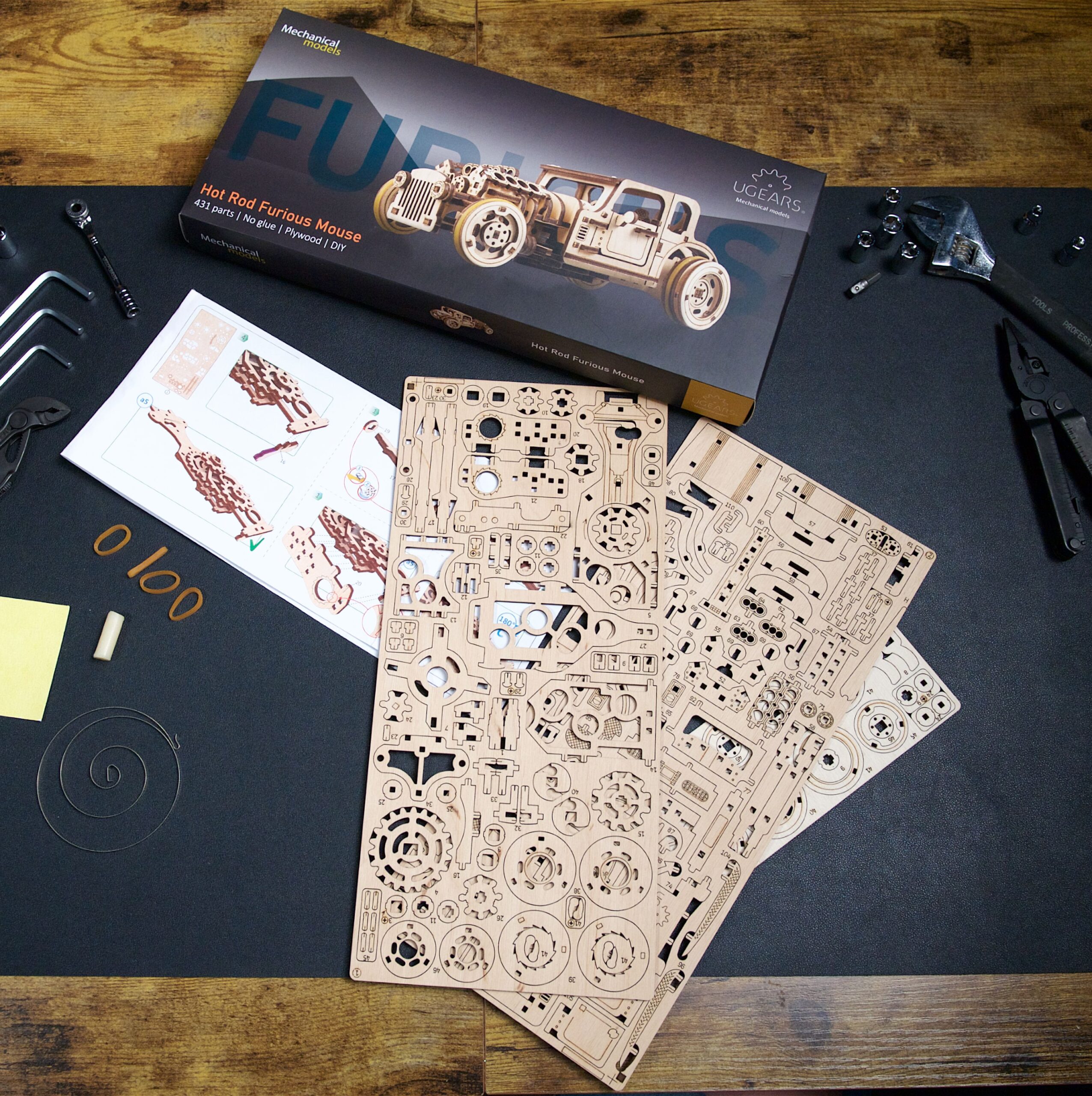 Le kit de modélisme Hot Rod – Moteur Furieux contient 207 pièces et est classé au niveau « Facile ». Il suffit de détacher les pièces des planches prédécoupées au laser, puis de les assembler en suivant nos instructions illustrées étape par étape en 11 langues (anglais, ukrainien, allemand, espagnol, français, italien, portugais, polonais, japonais, chinois et coréen). Même les modélistes débutants devraient être en mesure d’assembler ce modèle de voiture-jouet en 4 heures ou moins, puis de passer des heures à jouer. Un conseil pour assembler votre Hot Rod souris furieuse : « Développez » le châssis (c’est-à-dire assurez-vous que toutes les pièces mobiles sont légèrement poncées et lubrifiées, et que tous les engrenages se déplacent en douceur lors des essais) avant de placer le module de carrosserie sur le dessus. Comme pour toute la gamme exceptionnelle de puzzles 3D, de kits de modélisme pour le bricolage, d’automates, de robots, de boîtes de puzzle en bois et de kits de modélisme de STEM Lab proposés par Ugears, vous n’avez pas besoin de colle ou d’outils spéciaux pour assembler votre Hot Rod ; tout ce dont vous avez besoin est fourni dans la boîte.