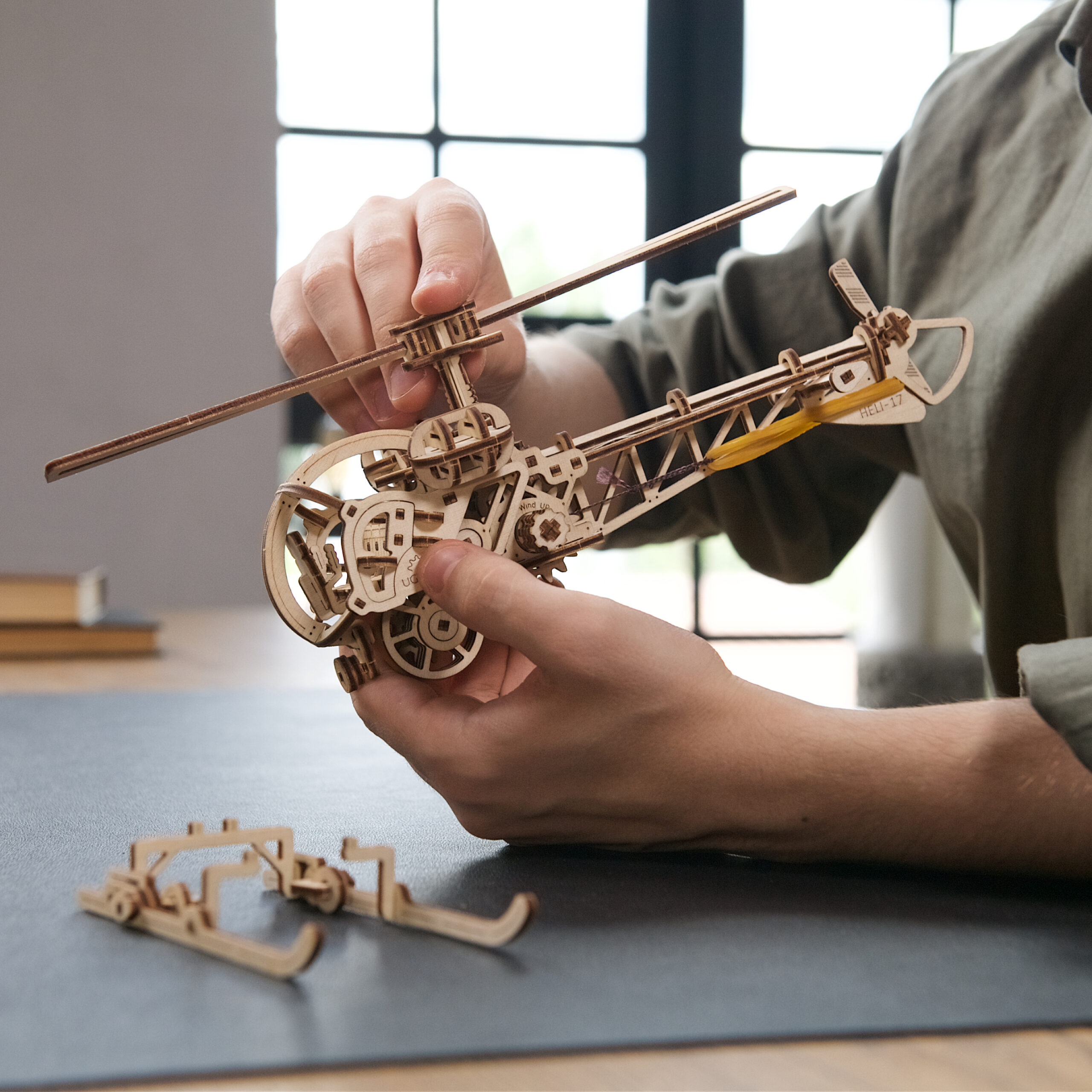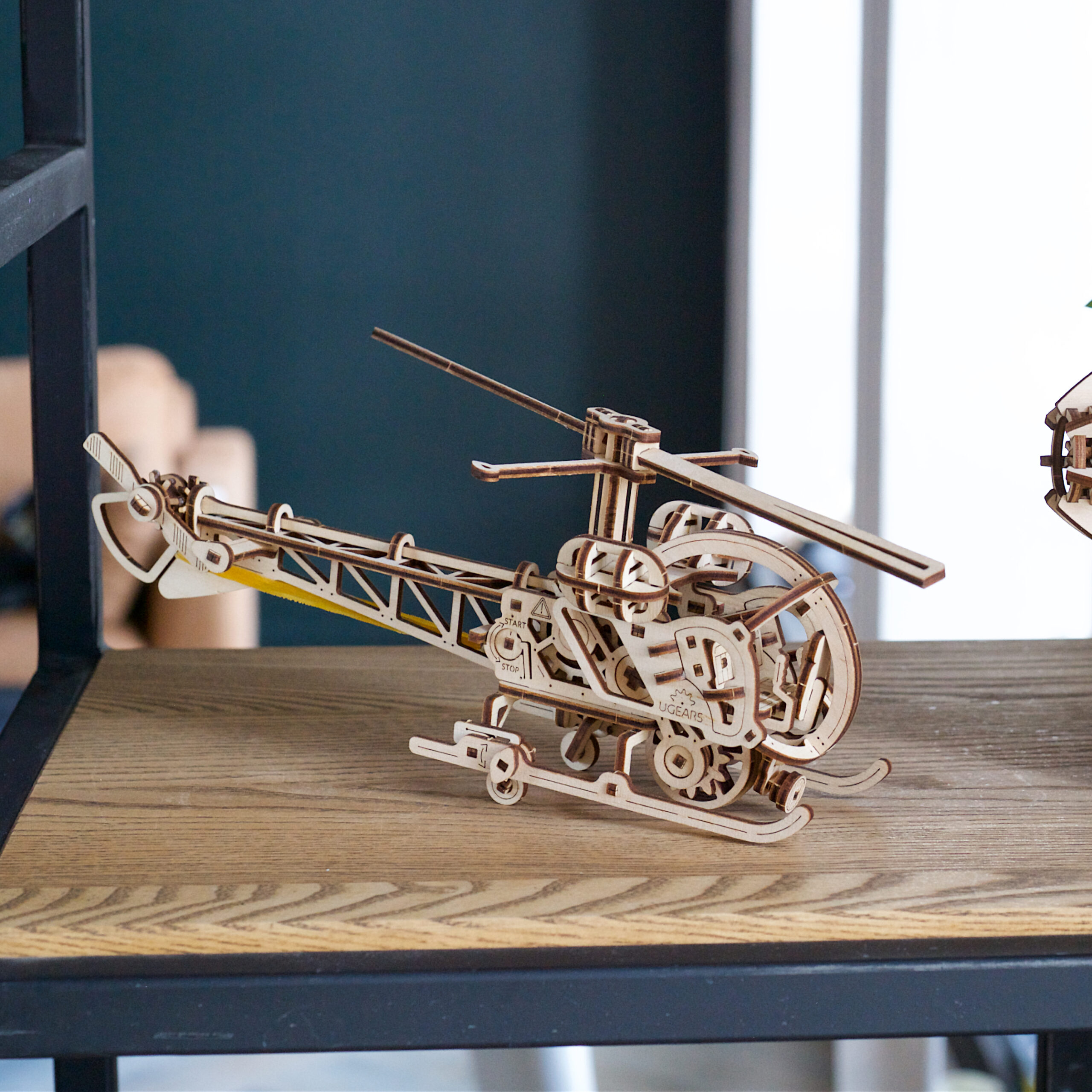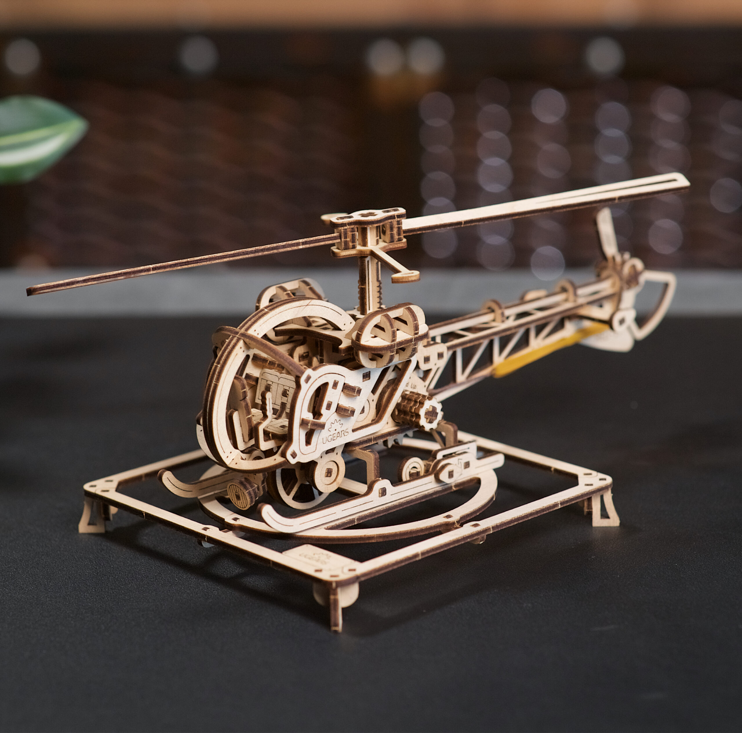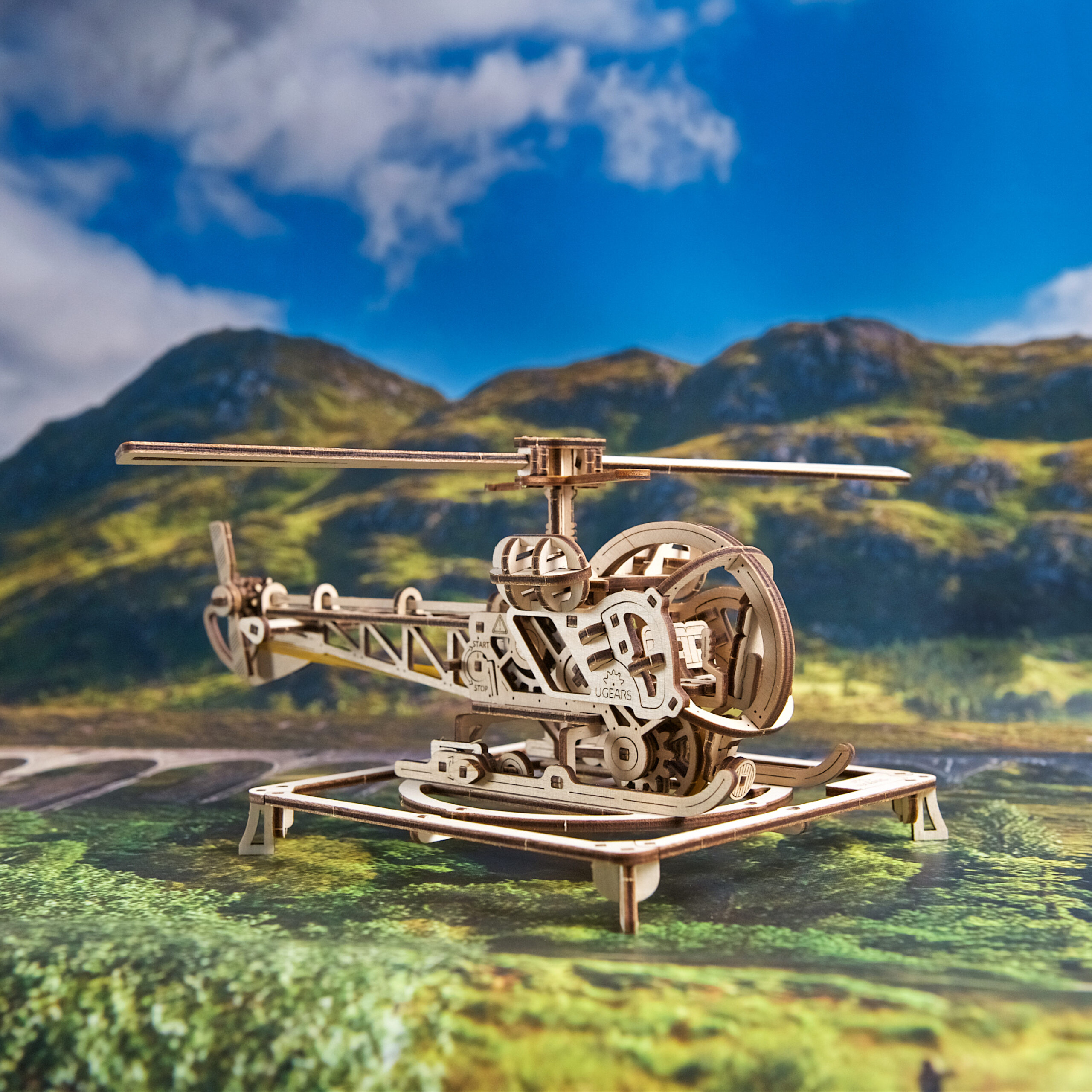 Pour mettre votre Mini hélicoptère Ugears en mouvement, placez l’interrupteur Marche/Arrêt sur la position « Arrêt », donnez plusieurs tours à la clé à cliquet silencieuse pour enrouler le moteur à élastique, abaissez les roues arrière, posez la maquette sur une surface plane, puis tenez-la doucement pendant que vous basculez l’interrupteur sur « Marche », relâchez et regardez votre hélicoptère puzzle 3D filer vers l’avant sur environ 1,5 m. Admirez le superbe réalisme de ce rotor principal en rotation ! Lorsqu’il n’est pas en fonctionnement, vous pouvez poser votre hélicoptère sur l’héliport fourni pour une présentation statique attrayante.