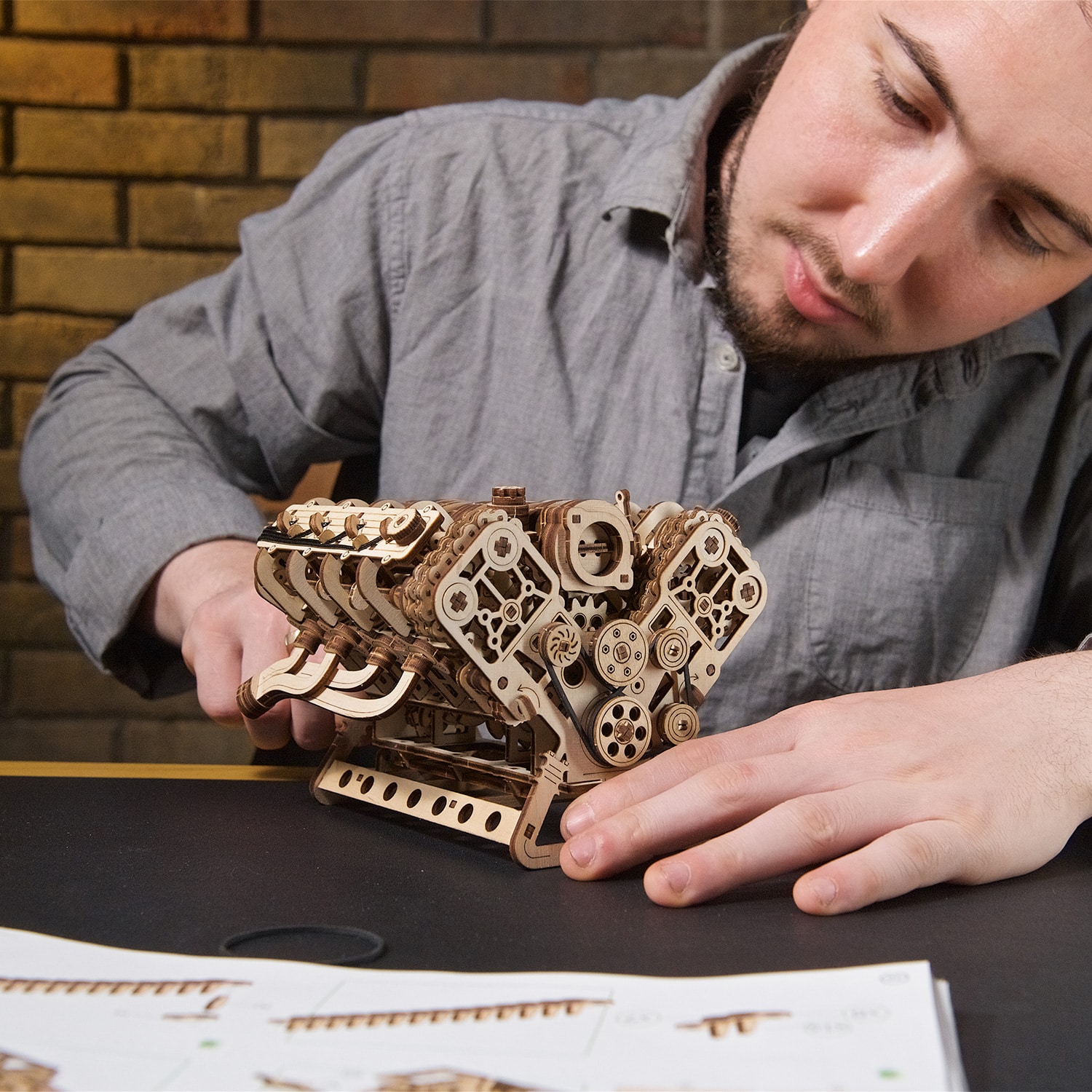 Cette maquette s’adresse à tous les passionnés d’engrenages, de moteurs, de pistons, d’essence, de graisse et de voitures. Vous avez demandé un modèle de moteur en bois sophistiqué et nous l’avons réalisé. Le moteur V8 Ugears est un peu une vantardise de notre part envers nos clients lorsque nous l’avons conçu, et de vous à vos amis et à votre famille lorsque vous le construirez. Le fait est que nous vous comprenons. Nous partageons votre amour de la mécanique. Notre équipe est composée de personnes qui ont tout simplement besoin de savoir comment les choses fonctionnent, et nous voulons aider les autres à apprendre à leur tour. Inspirez la prochaine génération d’ingénieurs et de mécaniciens en offrant le moteur V8 à un jeune modéliste, ou en le sortant de l’étagère de votre maison, de votre garage ou de votre atelier pour le montrer à un enfant, un petit-enfant ou un voisin curieux, ou en le laissant jouer avec votre maquette. Mettez de l’ambiance dans la pièce avec le moteur V8 Ugears !