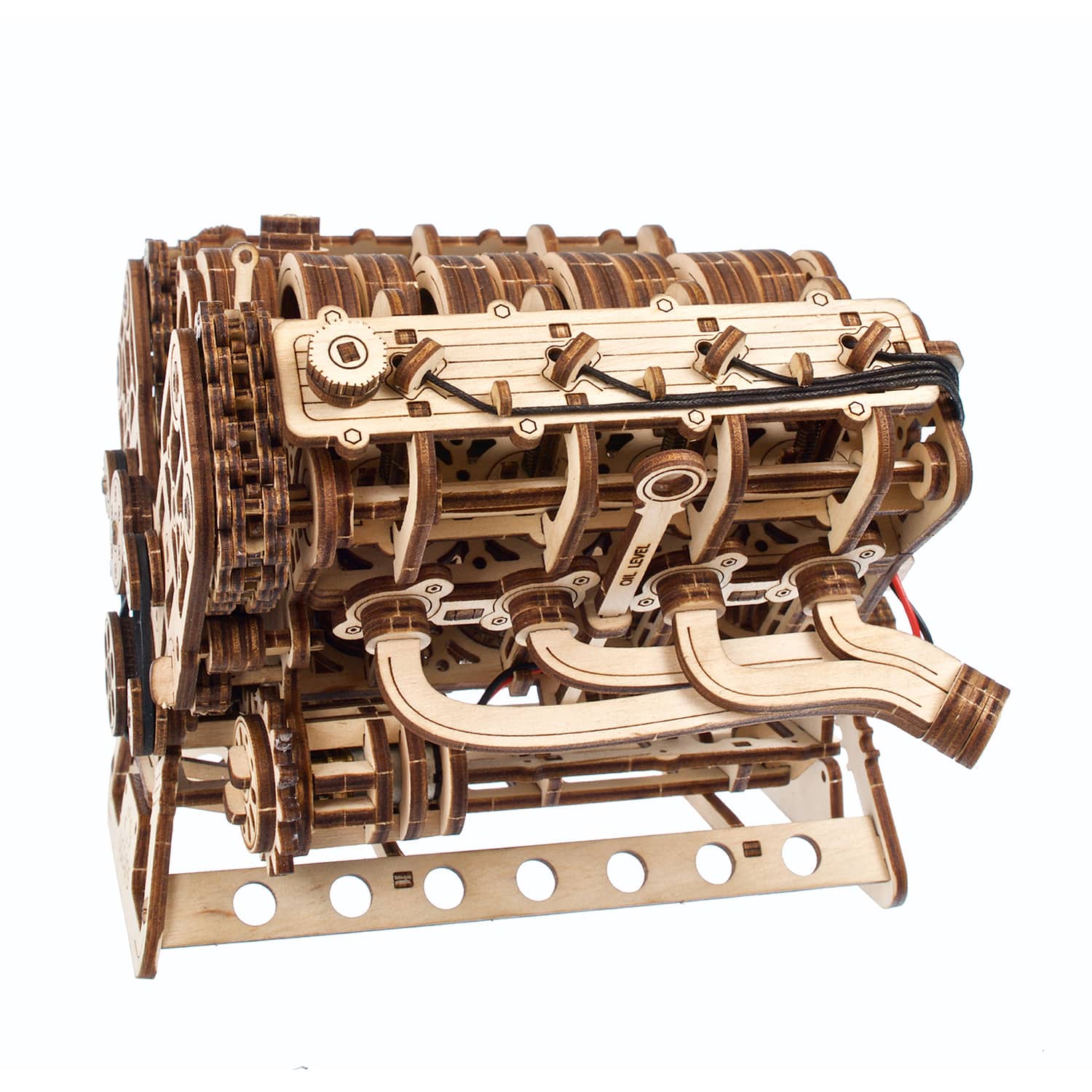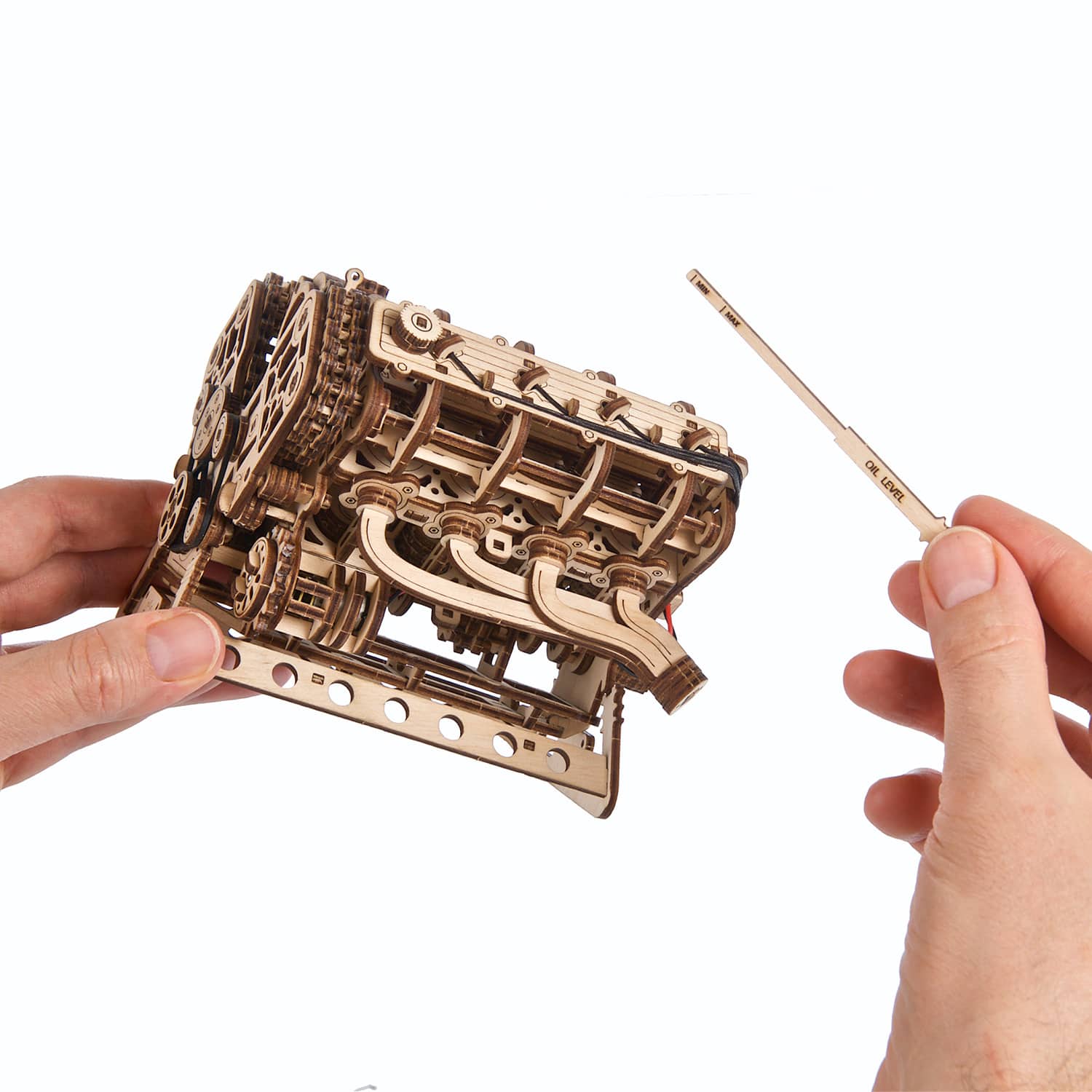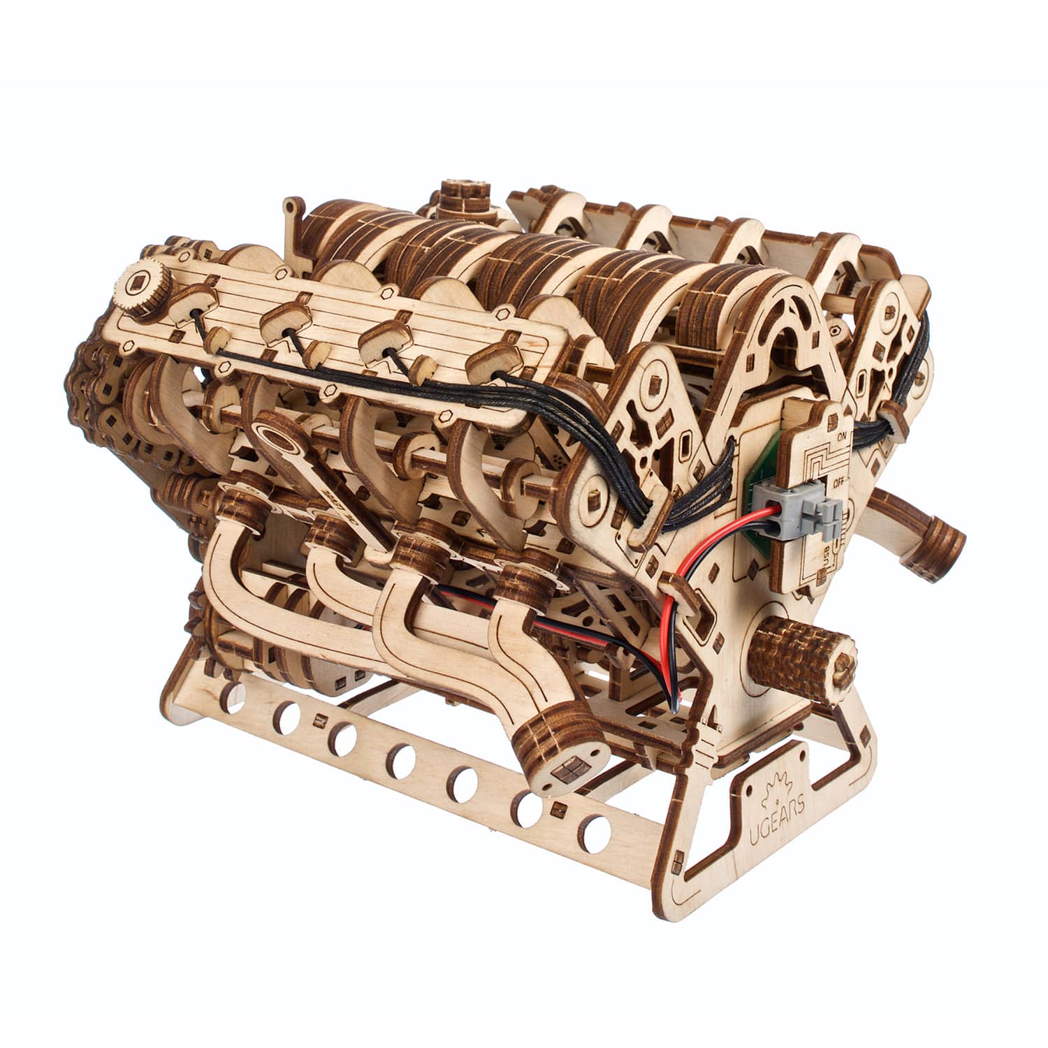 Le moteur Ugears V8 est un modèle de niveau avancé, destiné aux modélistes expérimentés. Vos efforts seront récompensés par une meilleure compréhension du fonctionnement d’un moteur à combustion interne lorsque vous construirez et ferez fonctionner cette maquette de moteur en bois très réaliste. Ce moteur 3D complexe peut être assemblé sans colle ni outils spéciaux, en suivant les instructions illustrées étape par étape en 11 langues (anglais, ukrainien, allemand, espagnol, français, italien, portugais, polonais, japonais, chinois et coréen). Les pièces sont fabriquées en bois composite de qualité artistique et sont détachées de planches prédécoupées au laser. Veillez à poncer et à lubrifier soigneusement toutes les pièces mobiles à l’aide du papier de verre et de la cire (ou d’un autre lubrifiant de votre choix) fournis, afin d’assurer un fonctionnement optimal du moteur.