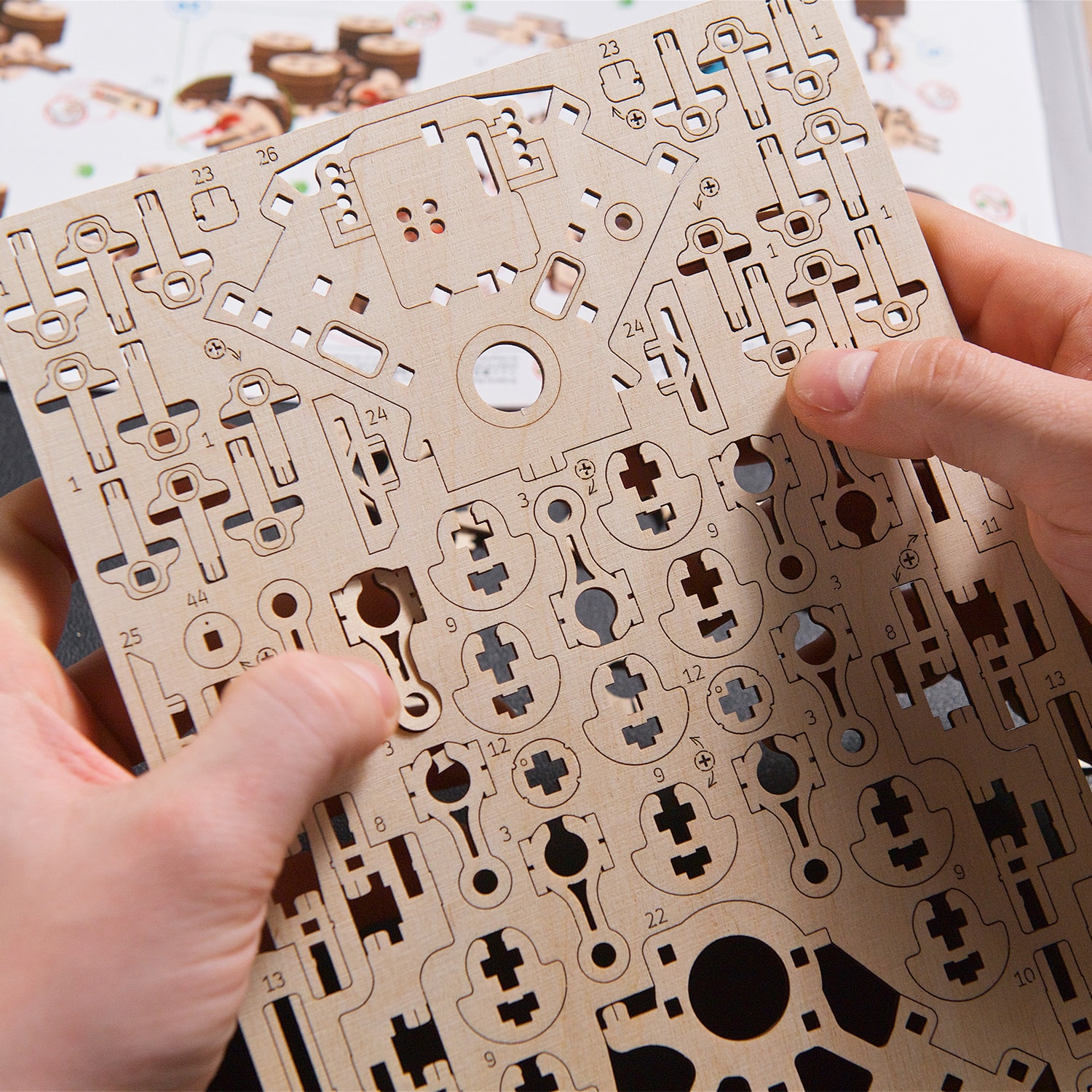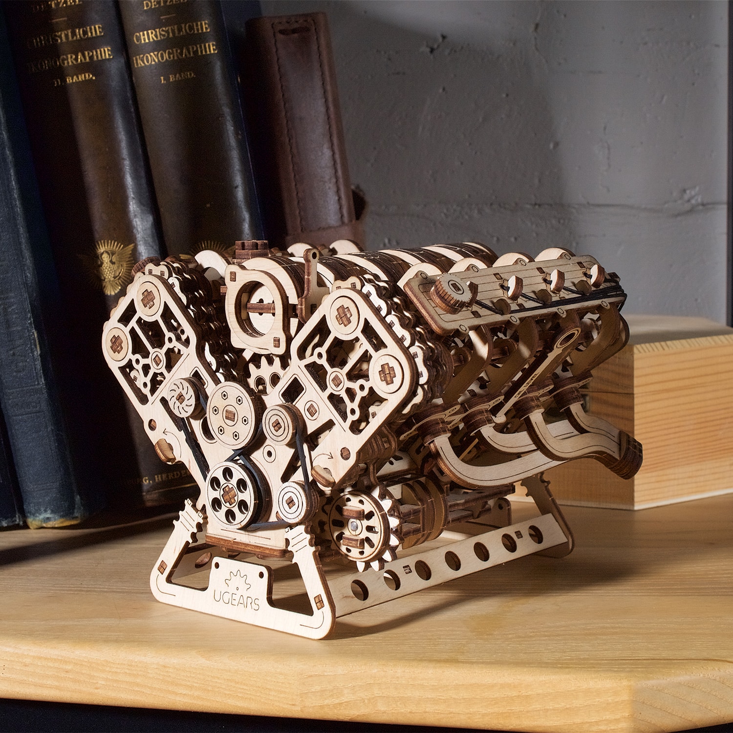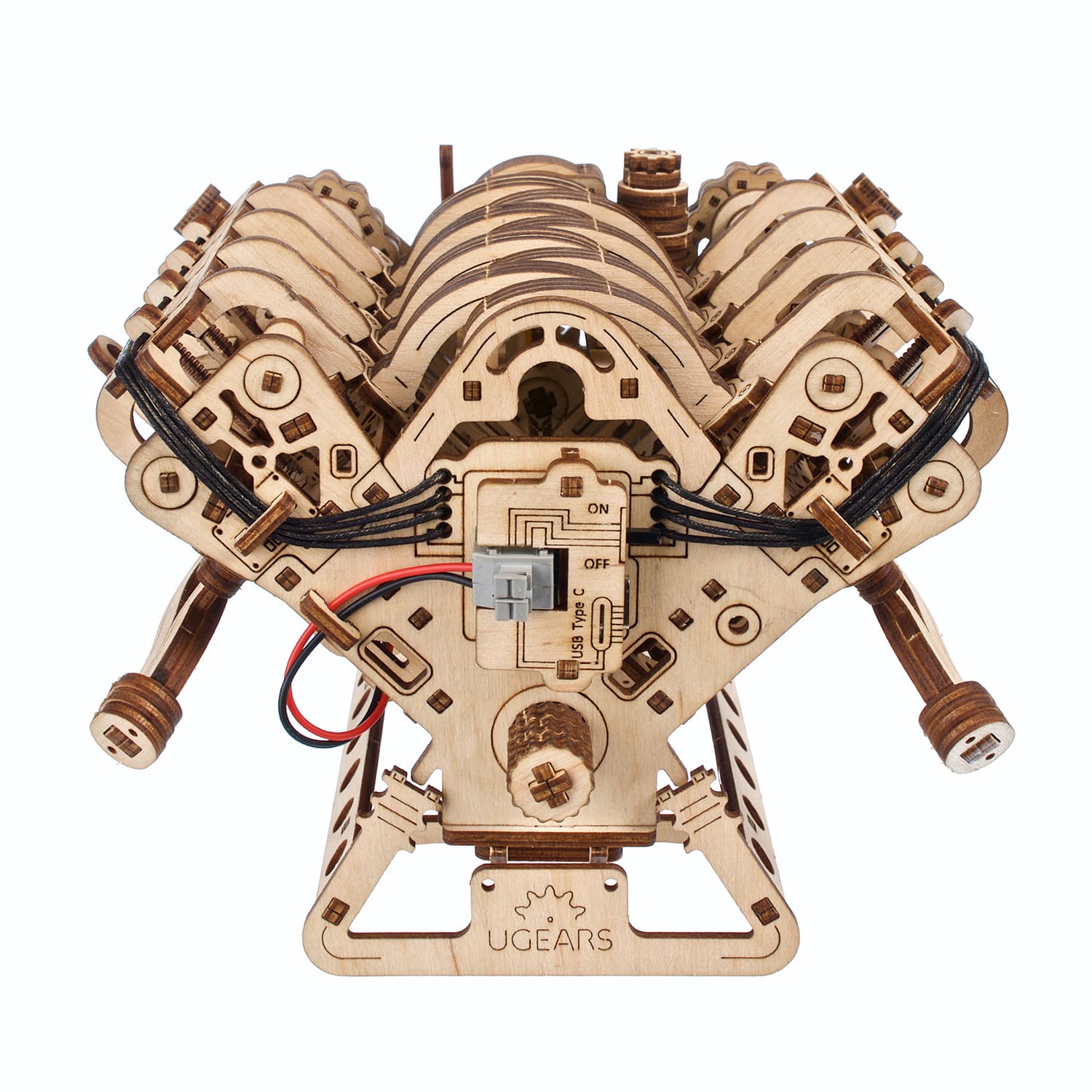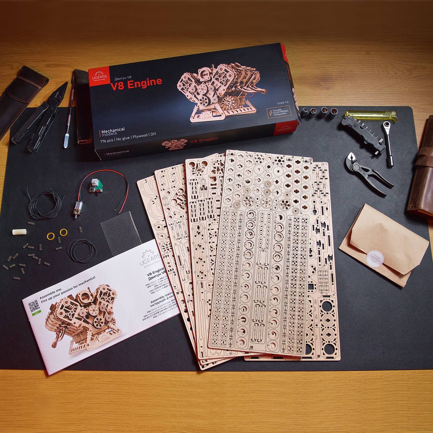 Le moteur Ugears V8 est un modèle de niveau avancé, destiné aux modélistes expérimentés. Vos efforts seront récompensés par une meilleure compréhension du fonctionnement d’un moteur à combustion interne lorsque vous construirez et ferez fonctionner cette maquette de moteur en bois très réaliste. Ce moteur 3D complexe peut être assemblé sans colle ni outils spéciaux, en suivant les instructions illustrées étape par étape en 11 langues (anglais, ukrainien, allemand, espagnol, français, italien, portugais, polonais, japonais, chinois et coréen). Les pièces sont fabriquées en bois composite de qualité artistique et sont détachées de planches prédécoupées au laser. Veillez à poncer et à lubrifier soigneusement toutes les pièces mobiles à l’aide du papier de verre et de la cire (ou d’un autre lubrifiant de votre choix) fournis, afin d’assurer un fonctionnement optimal du moteur.