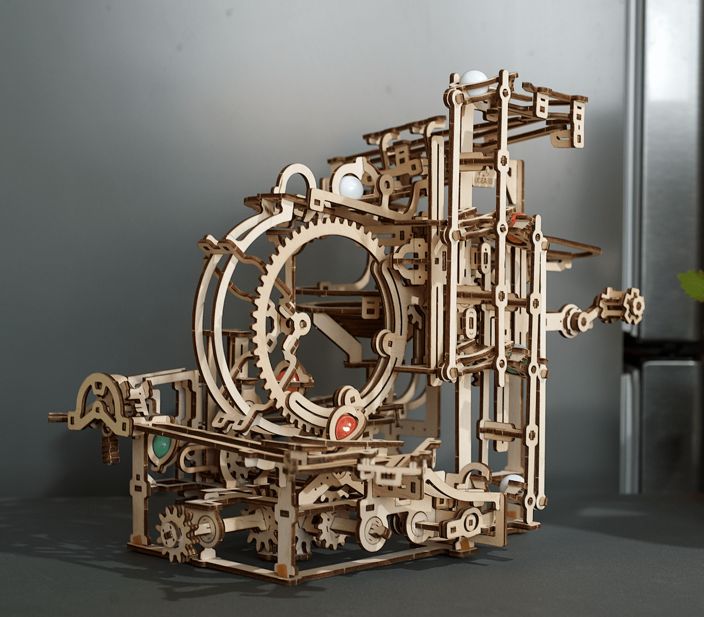 Le Parcours à Billes le plus haut du monde, mesurant 72 pieds, est la « machine à énergie ». Elle est située à l’intérieur du musée des sciences de Hong Kong. Notre Parcours à Billes Ugears n’est peut-être pas le plus grand, mais nous pensons que c’est le plus sympathique ! Lorsque les billes entrent dans le commutateur à 3 voies, chaque bille ferme une « porte » derrière elle, permettant à la bille suivante de passer plus loin. La troisième bille, passant par le dernier trou, ouvre les portes à l’aide d’un levier.