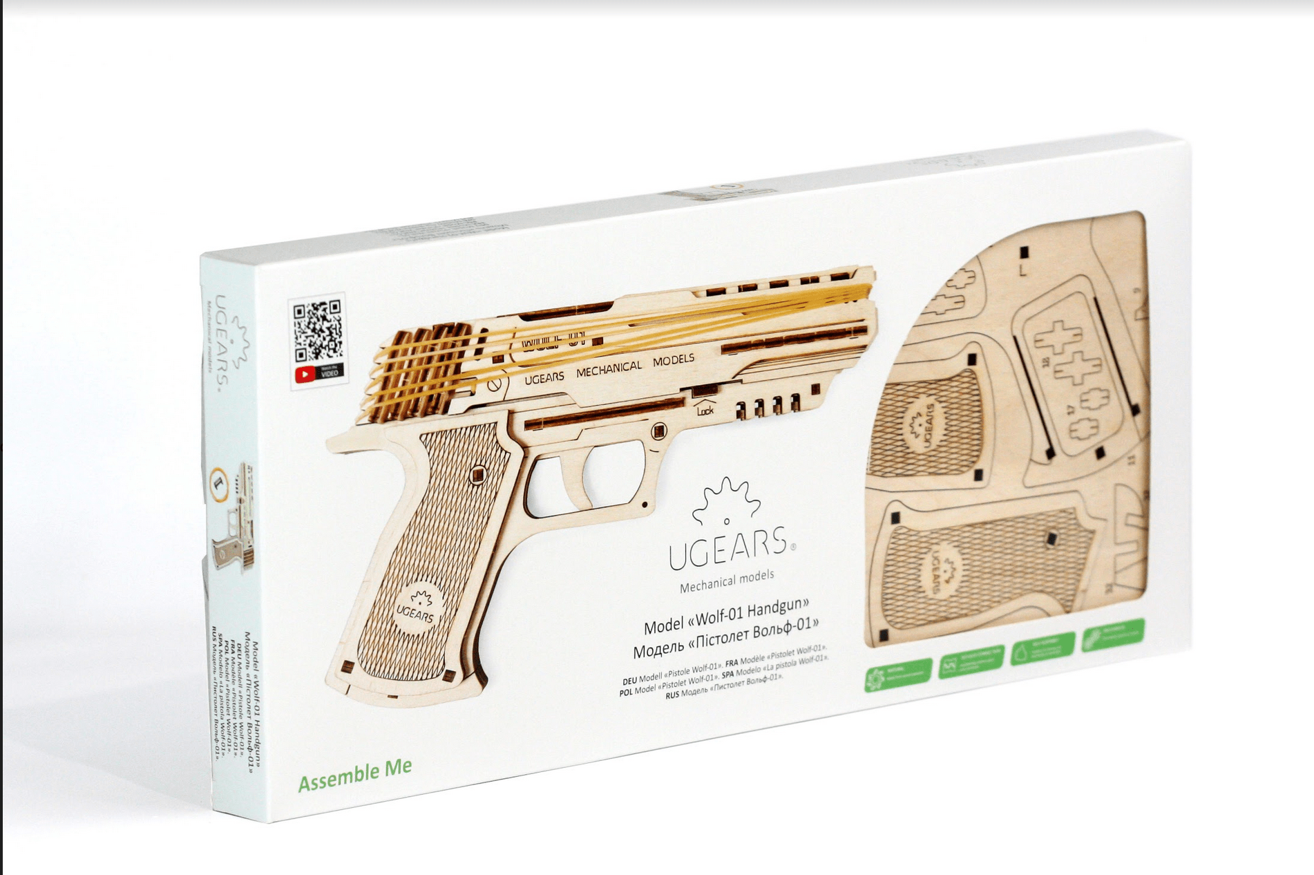 Le Pistolet Wolf-01 Ugears n’est pas un simple jouet en bois dont la fonctionnalité est limitée au tir imaginaire en criant «Bang-bang!». En effet, Le Wolf-01 est un pistolet mécanique 5 coups. Il a donc une performance exceptionnelle et des spécifications techniques, y compris le plus important – une énorme charge de plaisir en toute sécurité et paisible!