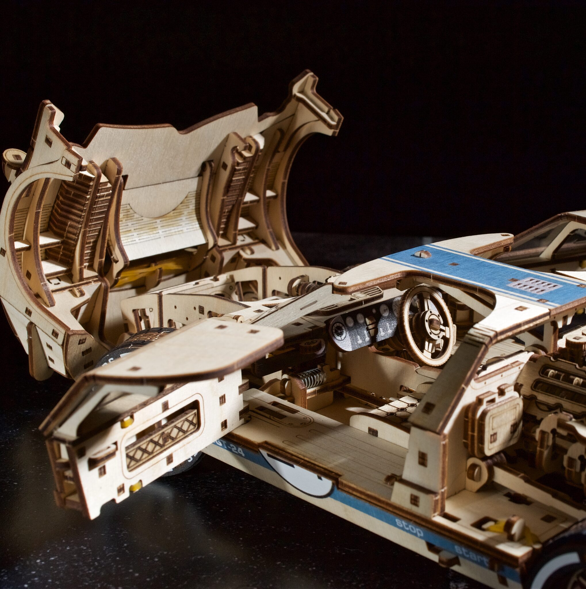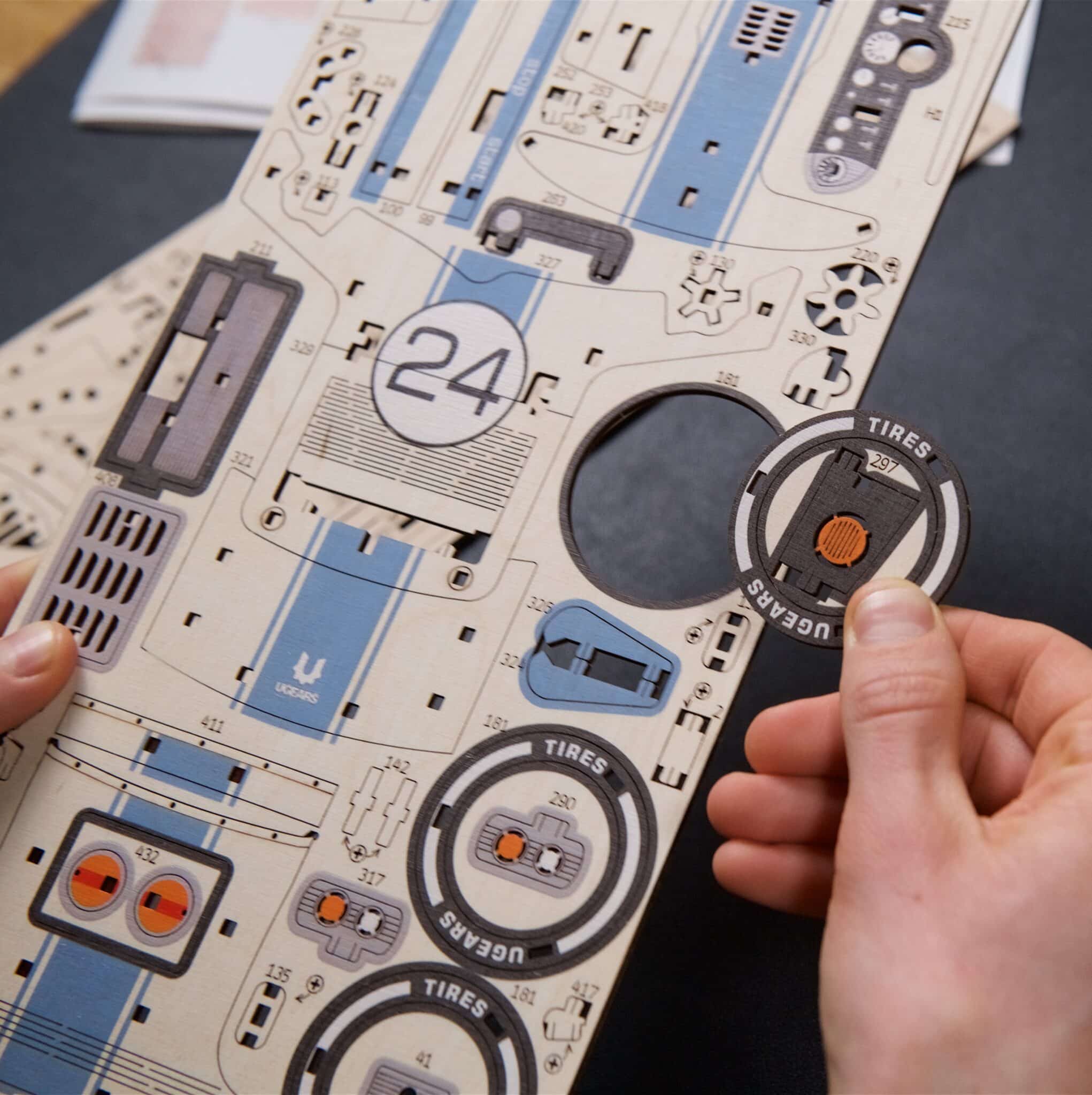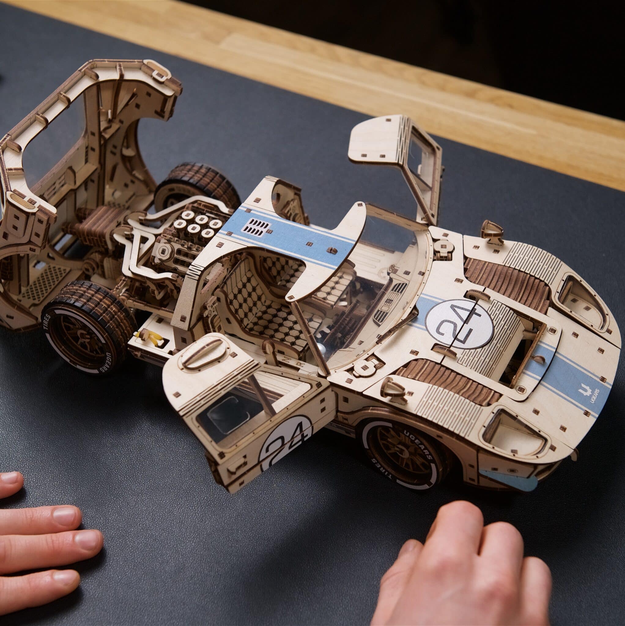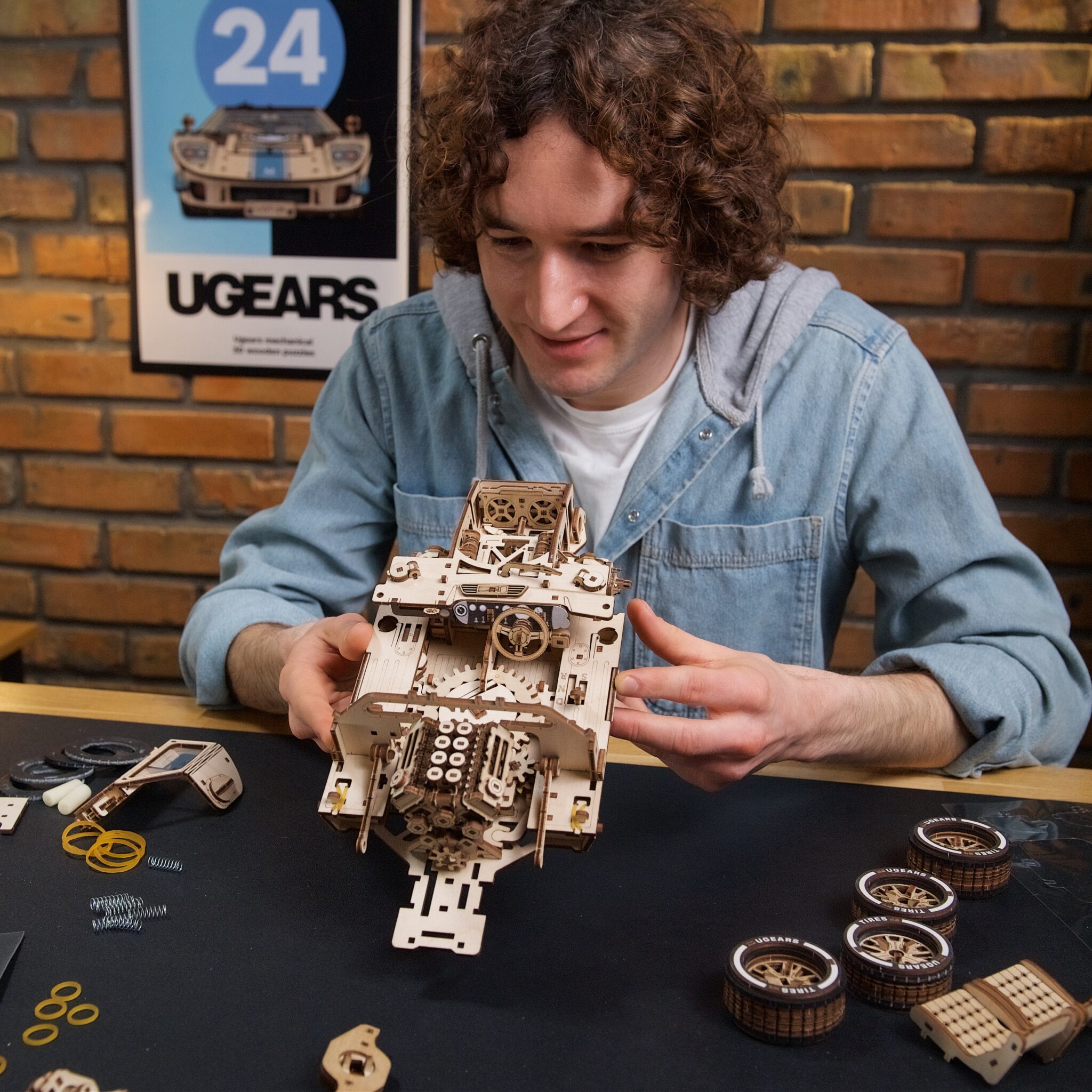 Remontez votre UGT-24 Voiture d’Endurance en retirant la clé qui se trouve dans le coffre et en l’insérant dans le mécanisme à cliquet situé sous le châssis. Posez la voiture sur le sol et actionnez l’interrupteur Stop/Start, ou placez la voiture au point mort pour observer les pistons en mouvement. Le levier de vitesses fonctionnel comporte également des vitesses de marche avant et de marche arrière, avec une poussée de vitesse supplémentaire en mode Sport. Les pièces mobiles de ce modèle de voiture de course en bois comprennent le ventilateur de radiateur, le frein à main, les bouchons de réservoir et des portes verrouillables.