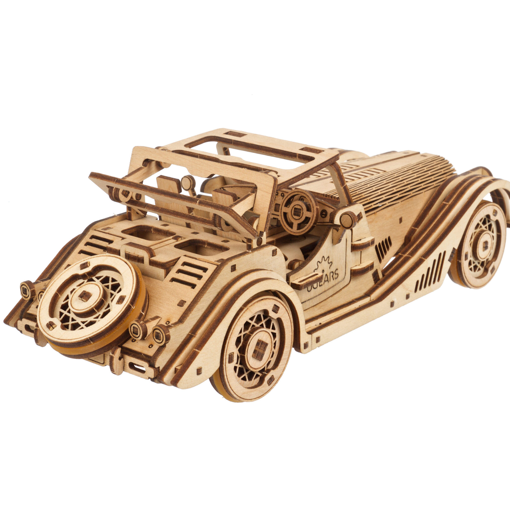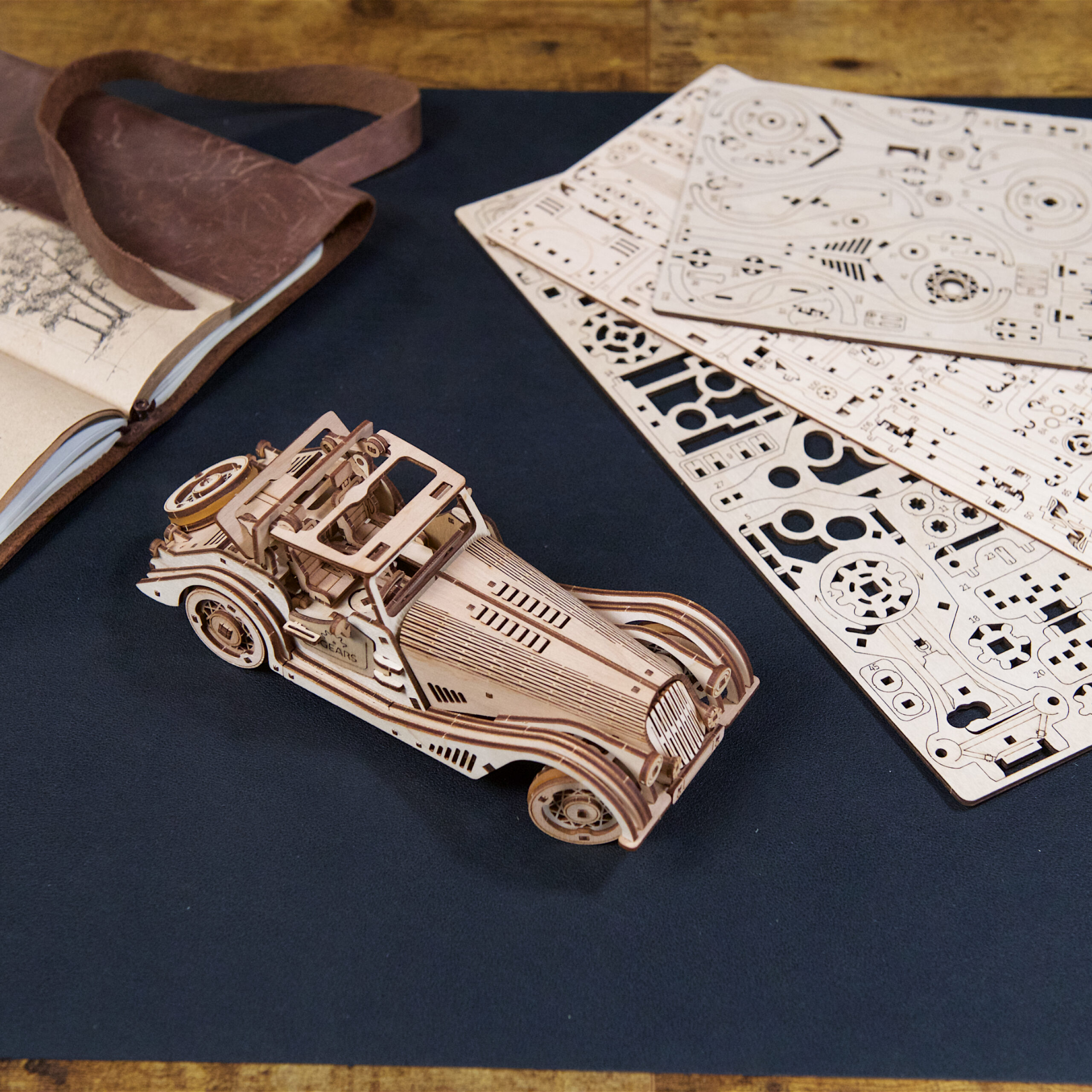 La maquette de mini Voiture de sport possède un moteur. Remontez le moteur à ressort en effectuant six rotations complètes de la clé à cliquet située sur le châssis de la petite voiture, ou tirez la Voiture de sport vers l’arrière sur une surface plane, relâchez-la et regardez-la partir à toute vitesse, comme n’importe quelle voiture-jouet à tirer. Ce modèle réduit de voiture en bois peut tourner à gauche ou à droite en ajustant les roues avant, ou se diriger en ligne droite et prendre de la distance. Les pneus en élastique donnent de la traction et sont faciles à monter et à remplacer. La maquette Ugears Voiture de sport « Souris Rapide » dispose d’une échelle réaliste, d’un intérieur merveilleusement détaillé, d’une roue de secours fonctionnelle montée sur le coffre qui peut être interchangée avec l’une ou l’autre des roues avant, de portes latérales qui s’ouvrent et d’un toit rigide manuel avec toit ouvrant qui se replie, s’abaisse et se referme par enclenchement.