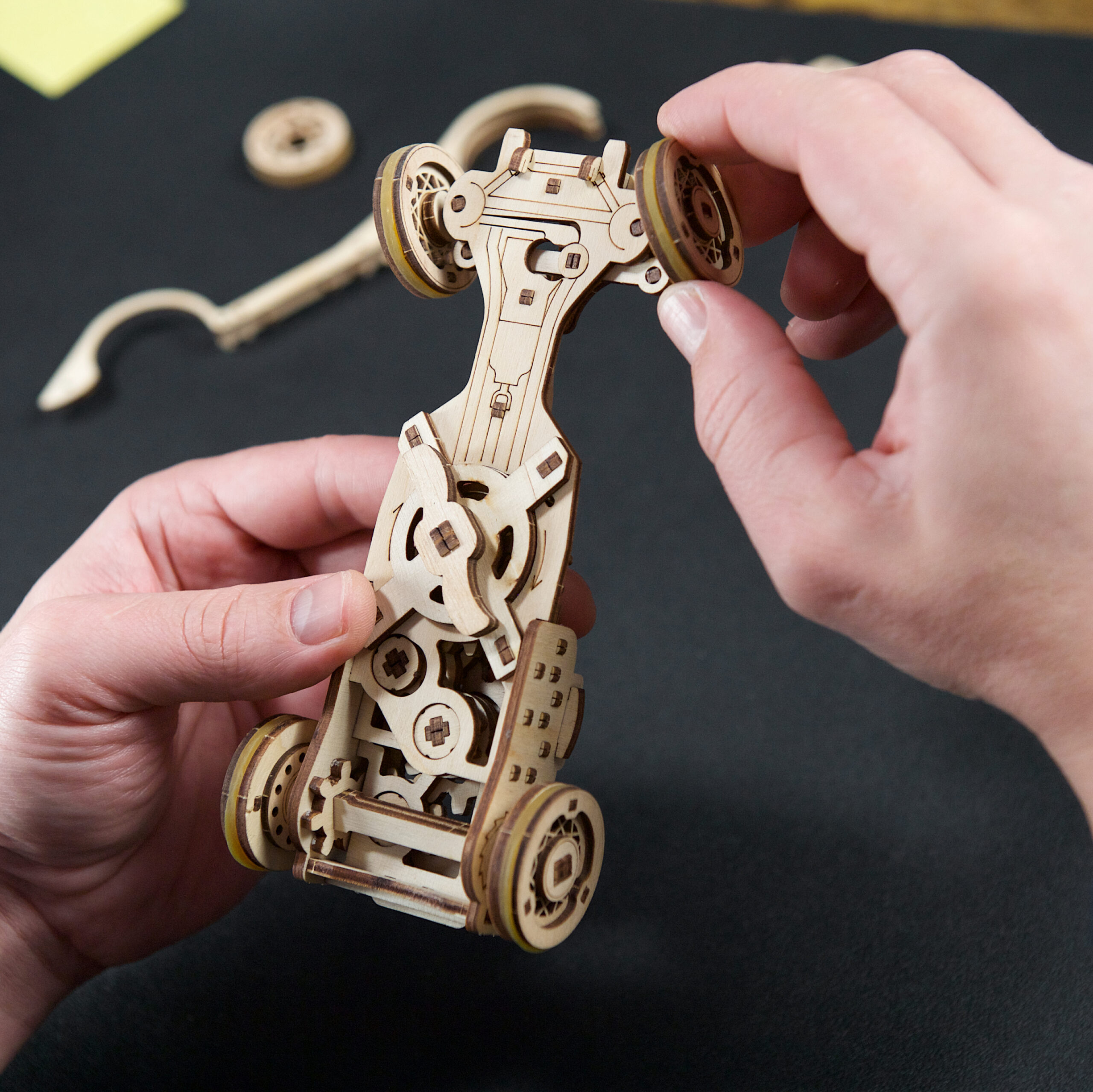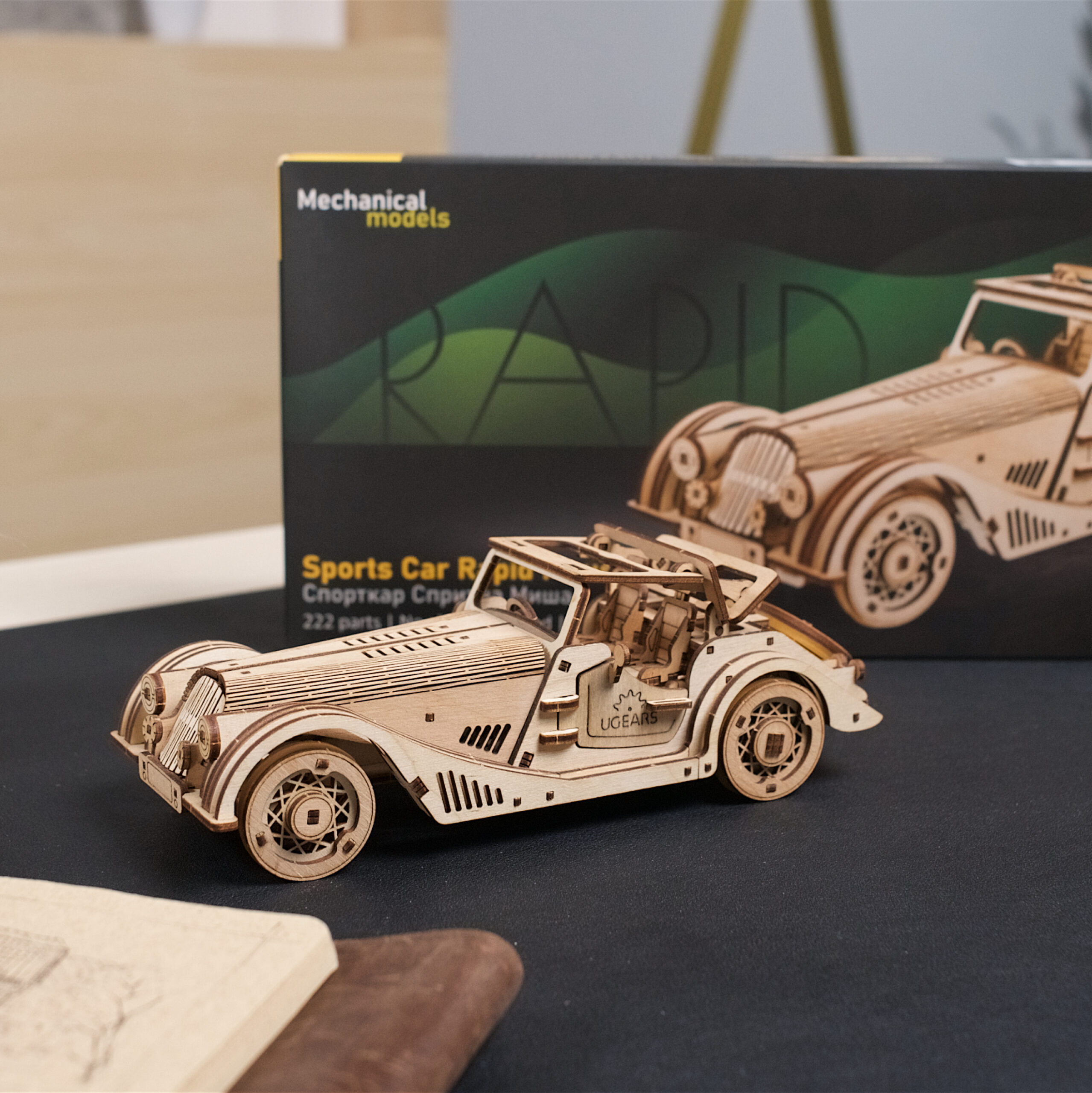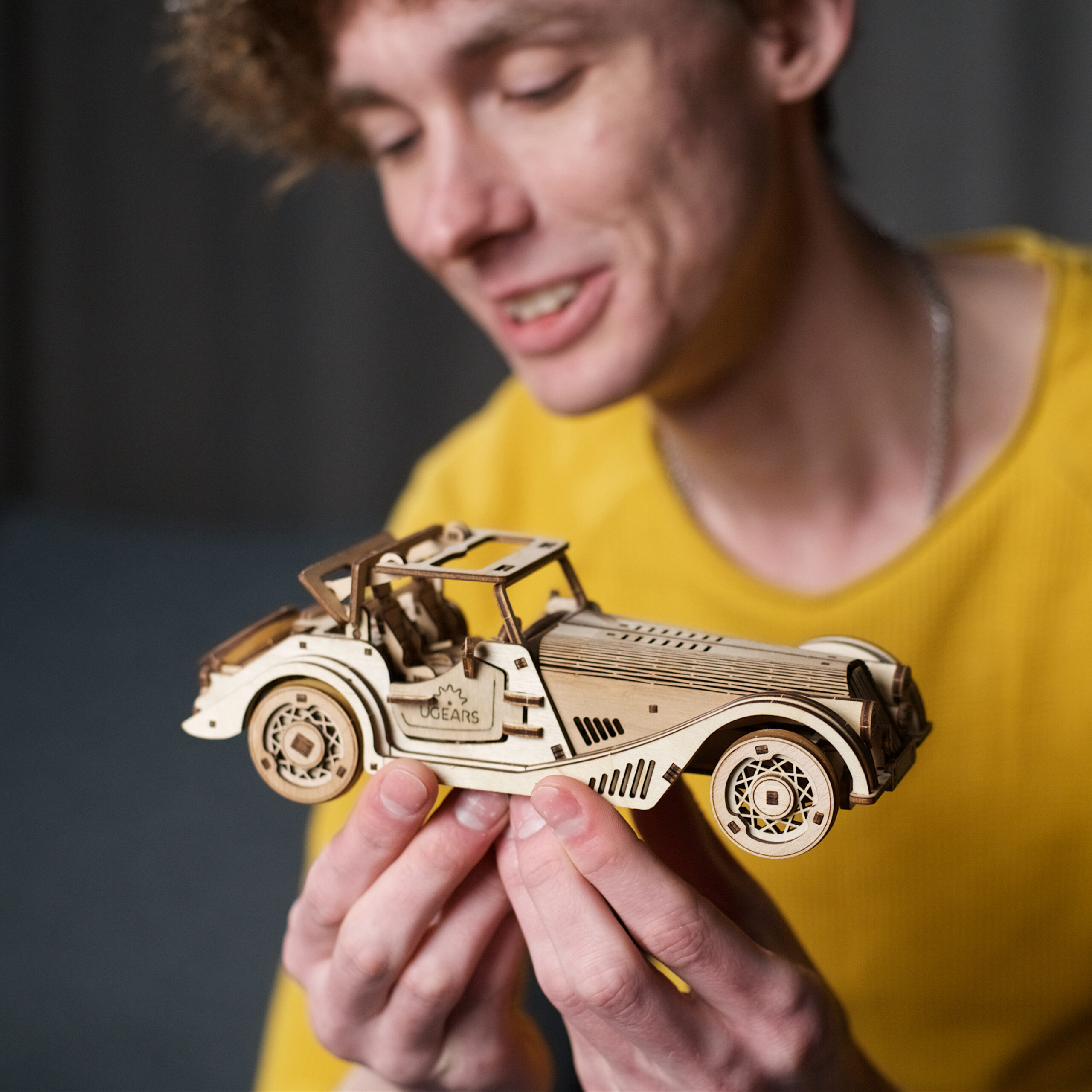 Le kit de mini Voiture de sport « Souris Rapide » à monter soi-même comprend 226 pièces et est classé au niveau « Facile ». Tout ce dont vous avez besoin pour l’assemblage est inclus dans la boîte. Il suffit de détacher les pièces des planches prédécoupées au laser et de les assembler en suivant nos instructions illustrées étape par étape en 11 langues (anglais, ukrainien, allemand, espagnol, français, italien, portugais, polonais, japonais, chinois et coréen). Profitez de 4 heures de construction légèrement ambitieuse, puis de plusieurs heures de jeu avec votre maquette de voiture miniature. Et si vous appréciez cette mini-voiture de sport classique, découvrez les autres modèles de la gamme exceptionnelle de puzzles 3D, de kits de modèles réduits, d’automates, de robots, de boîtes puzzle en bois et de kits de modélisme STEM Lab Ugears.